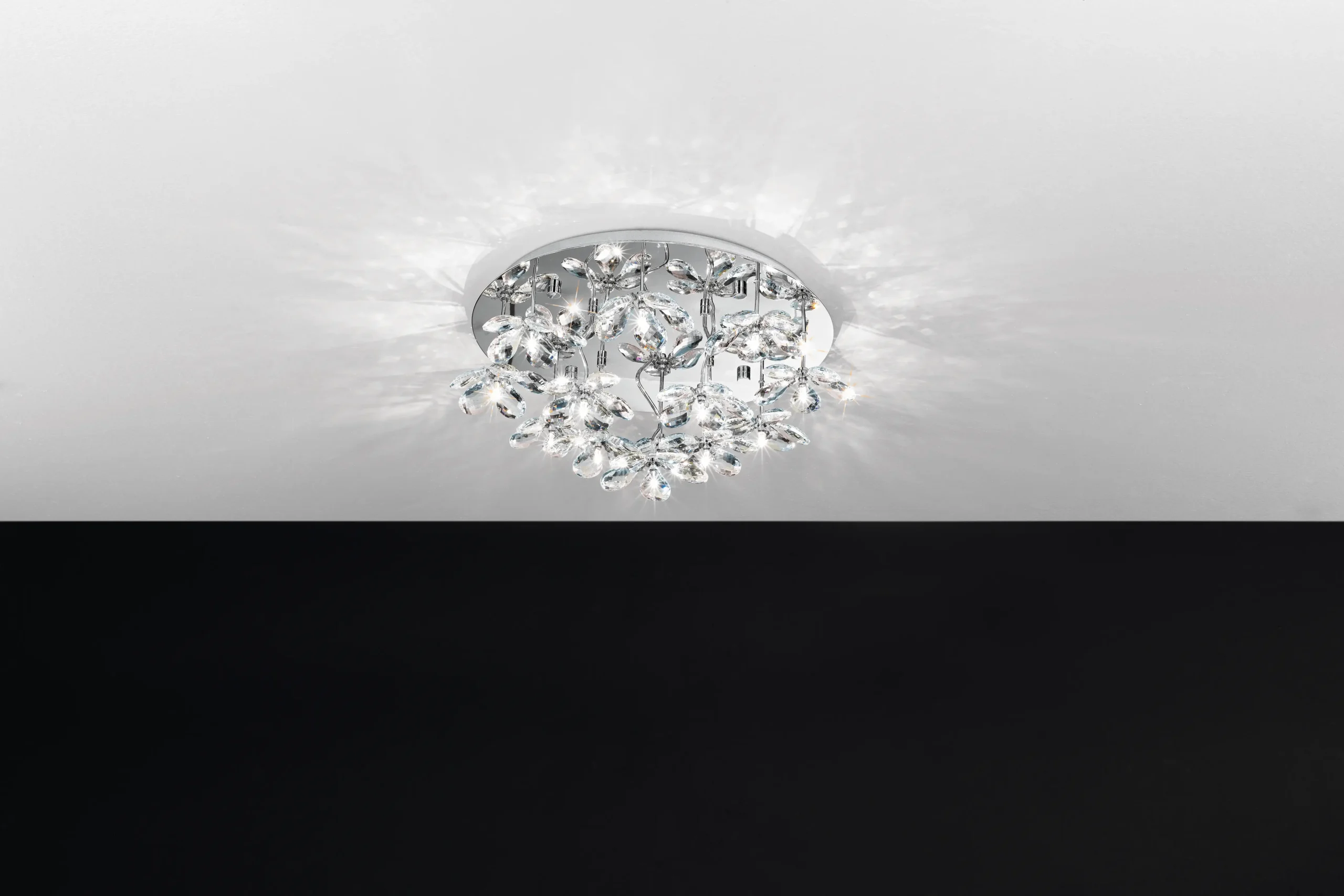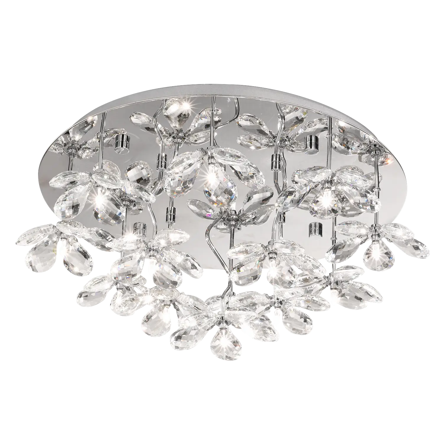 The EGLO PONTEDO 93081 is a statement ceiling lamp crafted in chrome-finished stainless steel with clear glass elements, designed to add a sparkling, decorative glow to interiors. It includes 13x G4 halogen lamps at 10 W each (included), delivering warm white 2700 K light at 100 lm per source for a rich, ambient effect. With a 550 mm diameter and 225 mm height, IP20 rating, and Class II insulation for 220–240 V mains with 12 V operation, it suits feature areas like living rooms and foyers seeking elegant ceiling illumination.