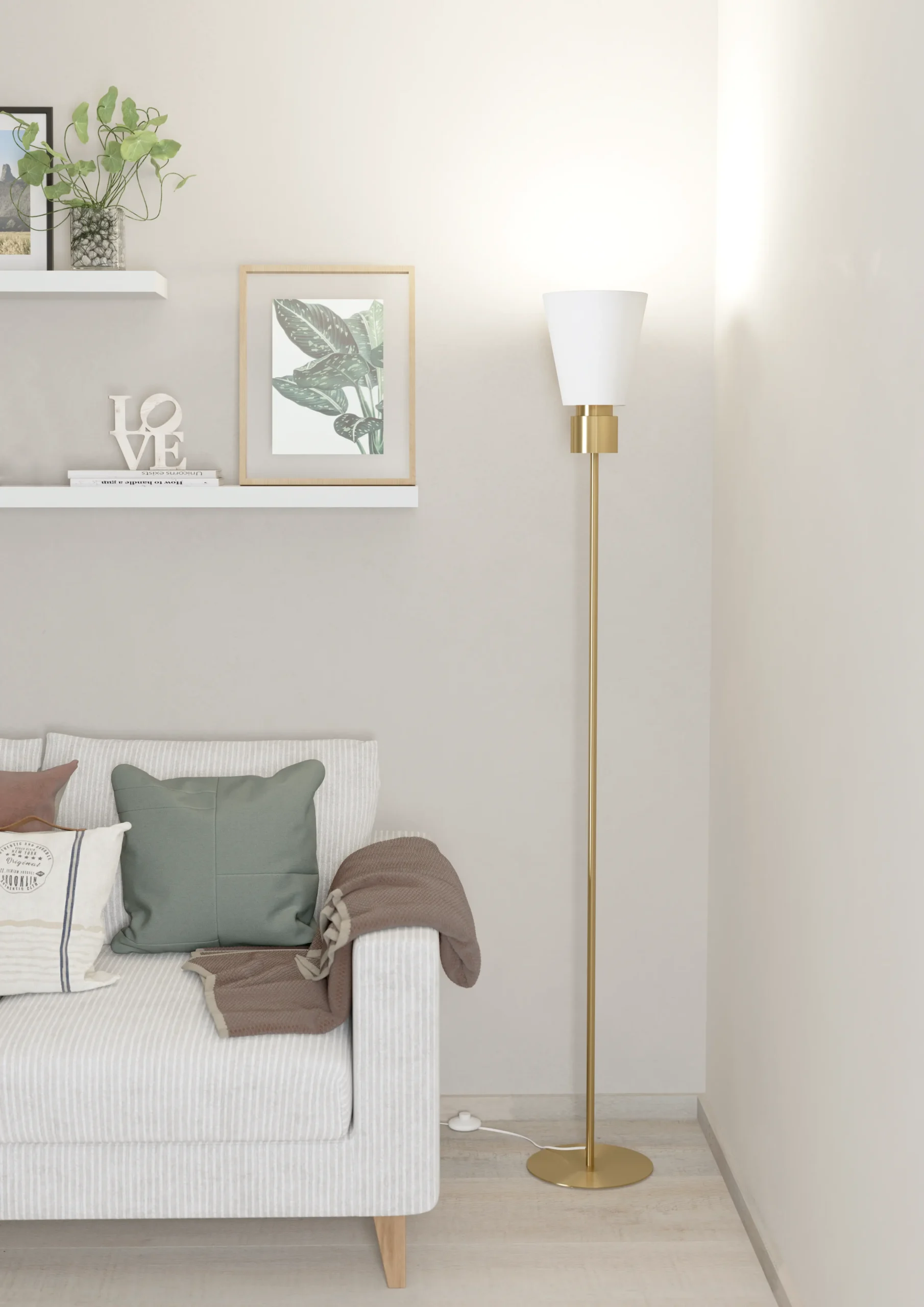 Elegant upright design Tall 1,700mm (66. 9″) steel floor lamp finished in sophisticated brushed brass, topped with a white/brass fabric shade for modern interiors. Perfect dimensions Overall height 1