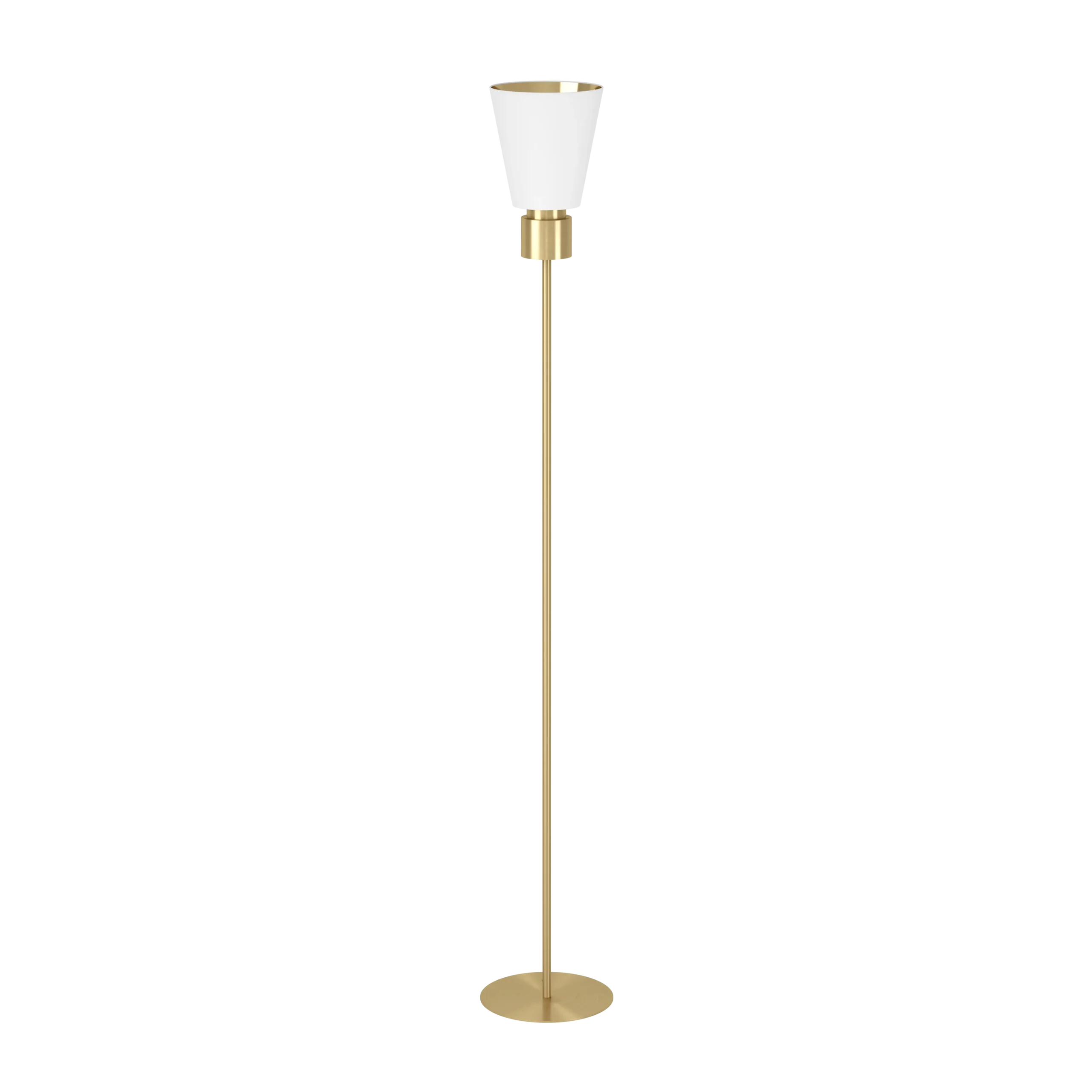 Elegant upright design: Tall 1,700mm (66.9″) steel floor lamp finished in sophisticated brushed brass, topped with a white/brass fabric shade for modern interiors.