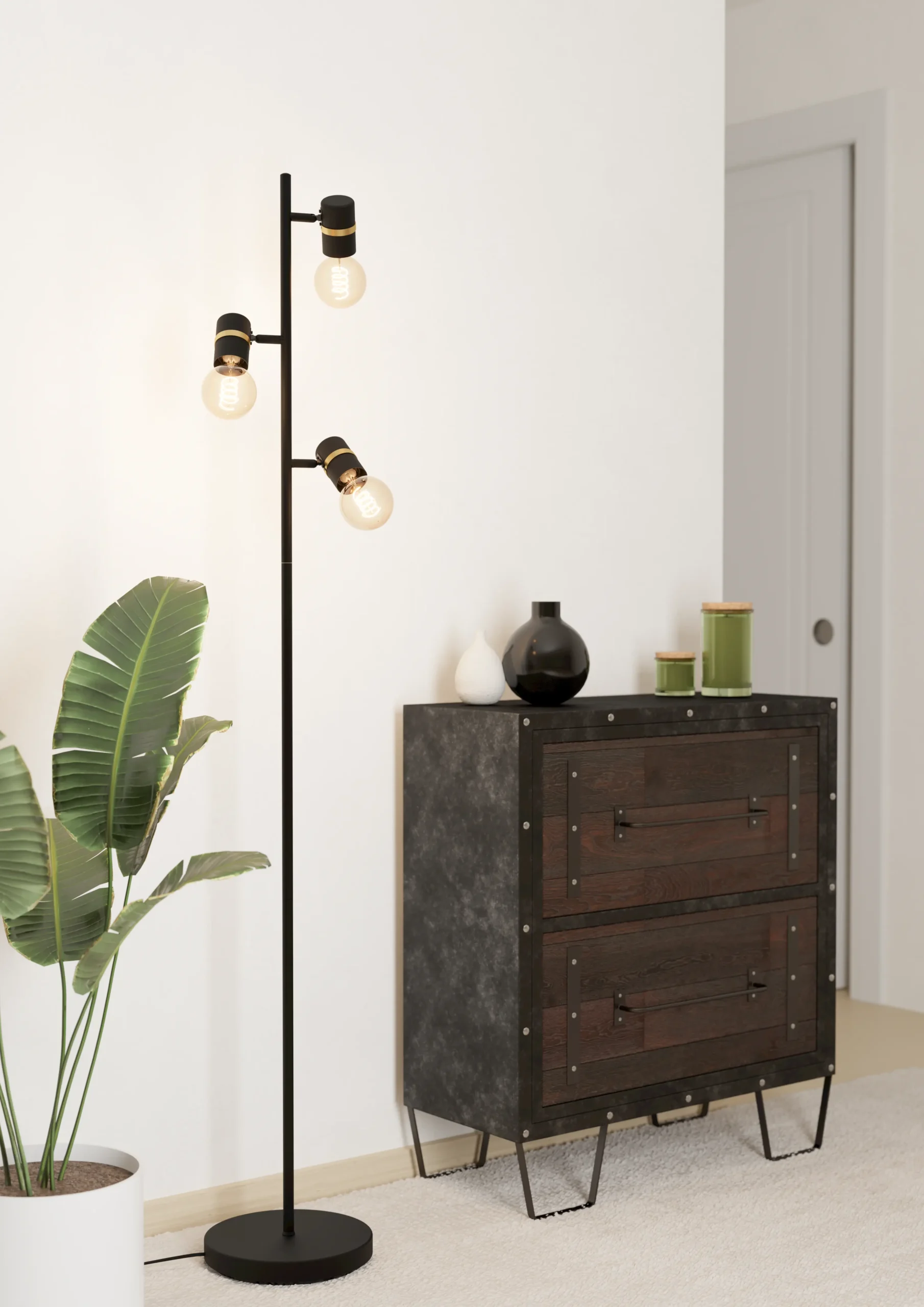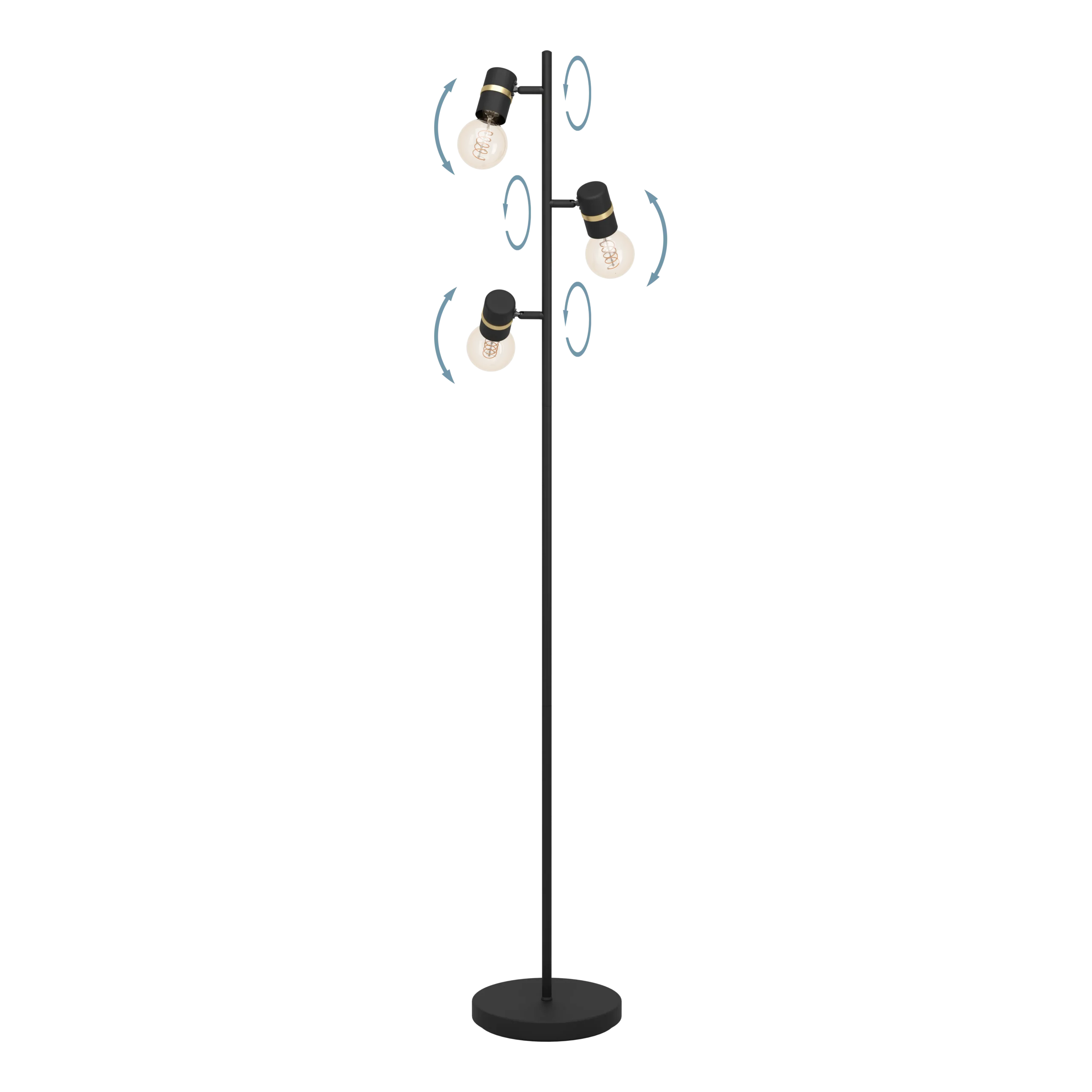 Modern Spot Styling: Three adjustable E27 spotlights on a sleek black steel pole, accented with brass-colored detailing for a contemporary statement
