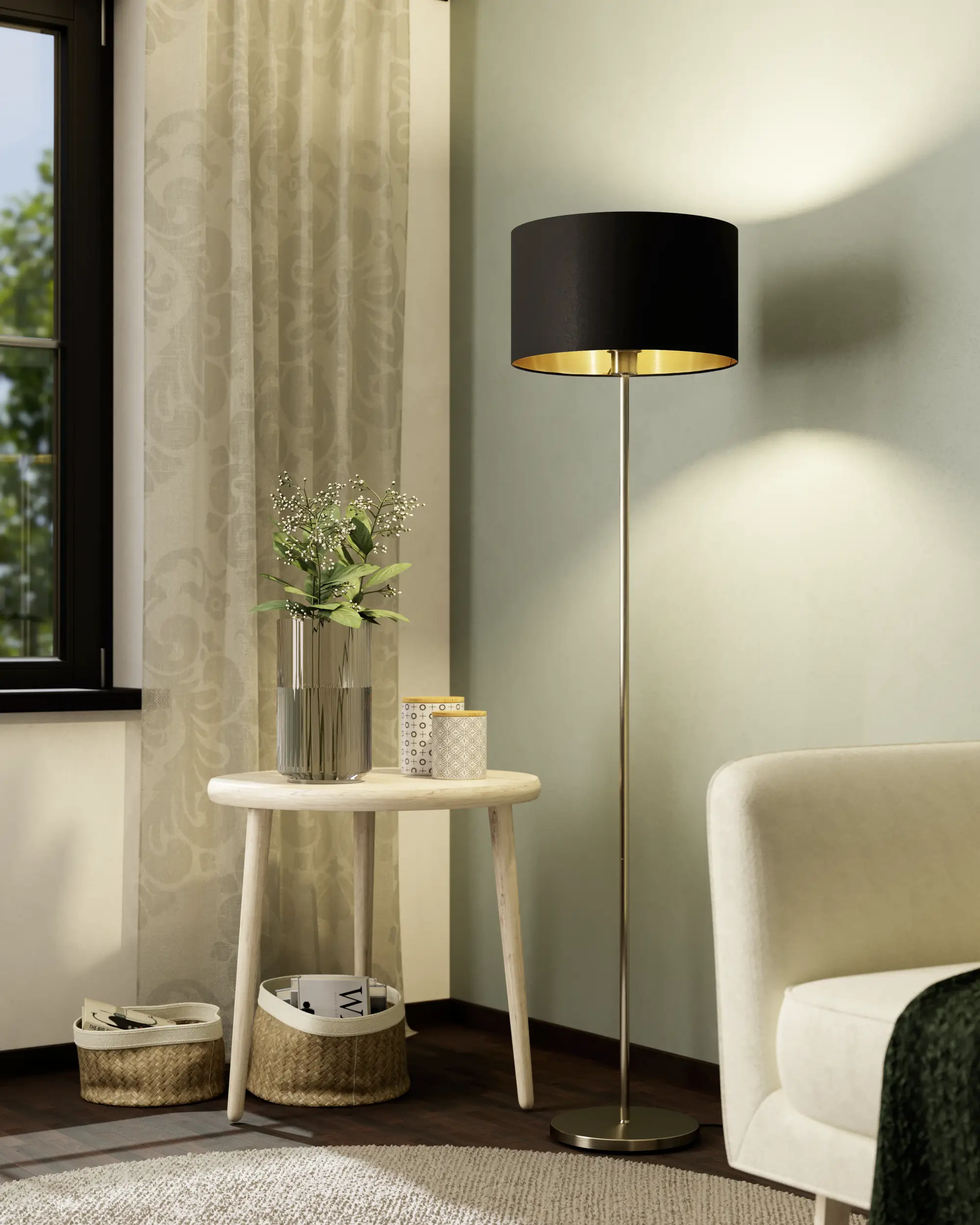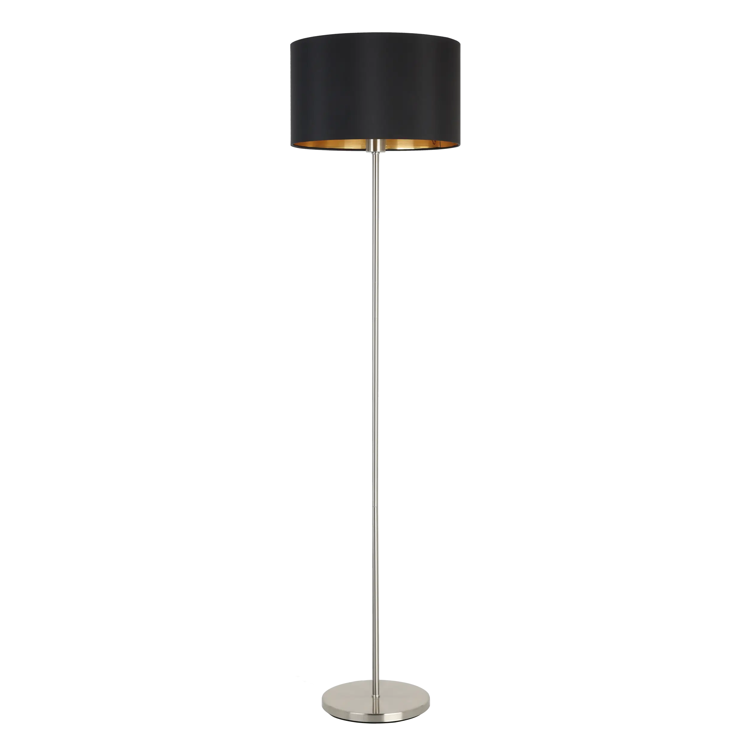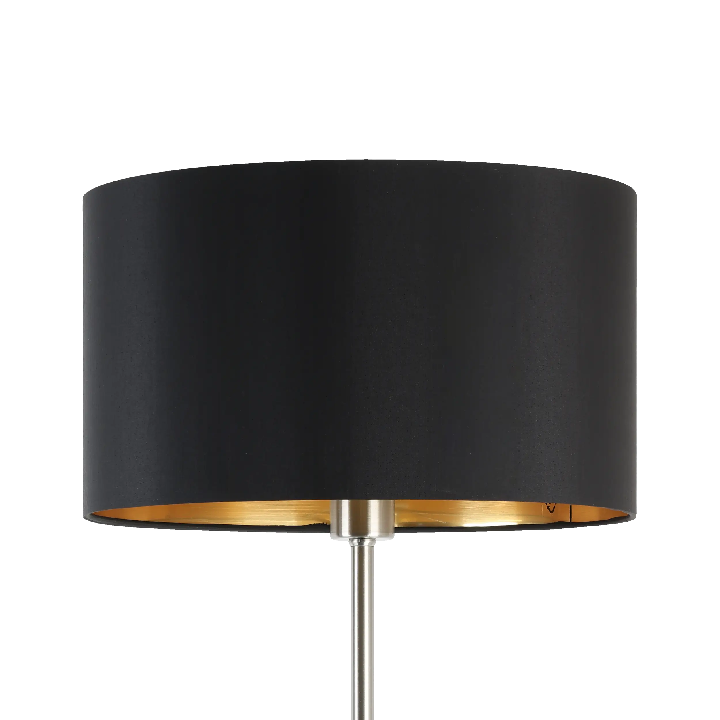 Elegant Two-Tone Design: Combines a sleek satin-nickel steel stand with a stylish black fabric drum shade featuring a warm gold interior—adds modern sophistication to any living space.