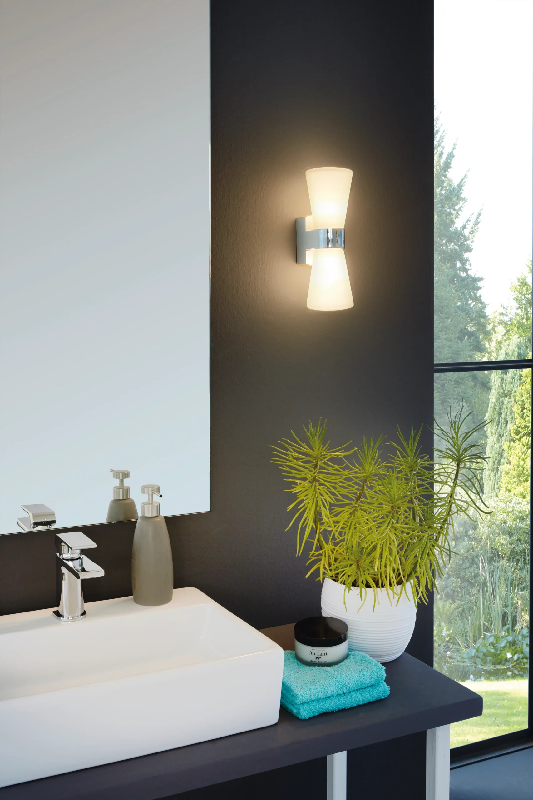 Sleek chrome up/down design – Crafted from cast‑aluminium with satin white glass inlets, this elegant fixture casts warm light both upwards and downwards. Perfect for bathrooms, hallways, and outdoor-covered areas.