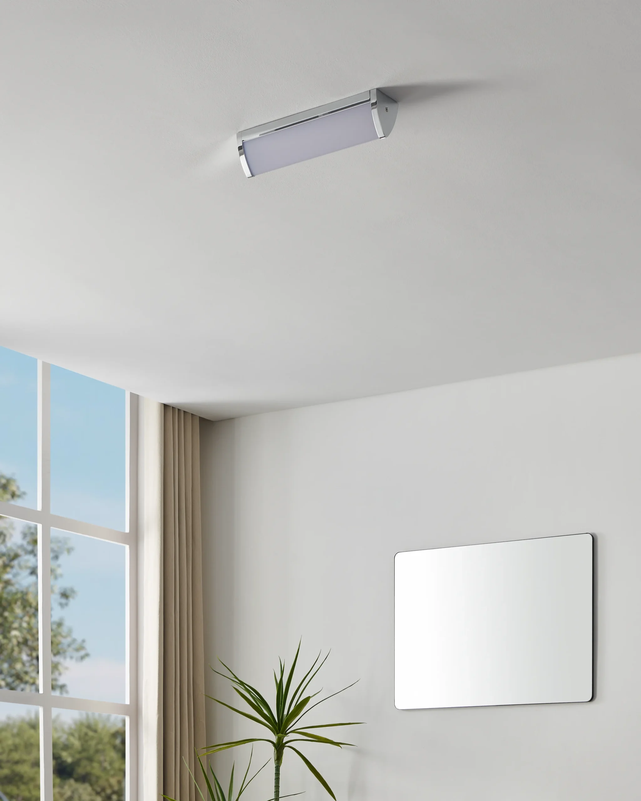 Sleek Modern Design: Features a chrome-plated cast metal frame with a white plastic diffuser, offering a contemporary aesthetic suitable for various interior styles.