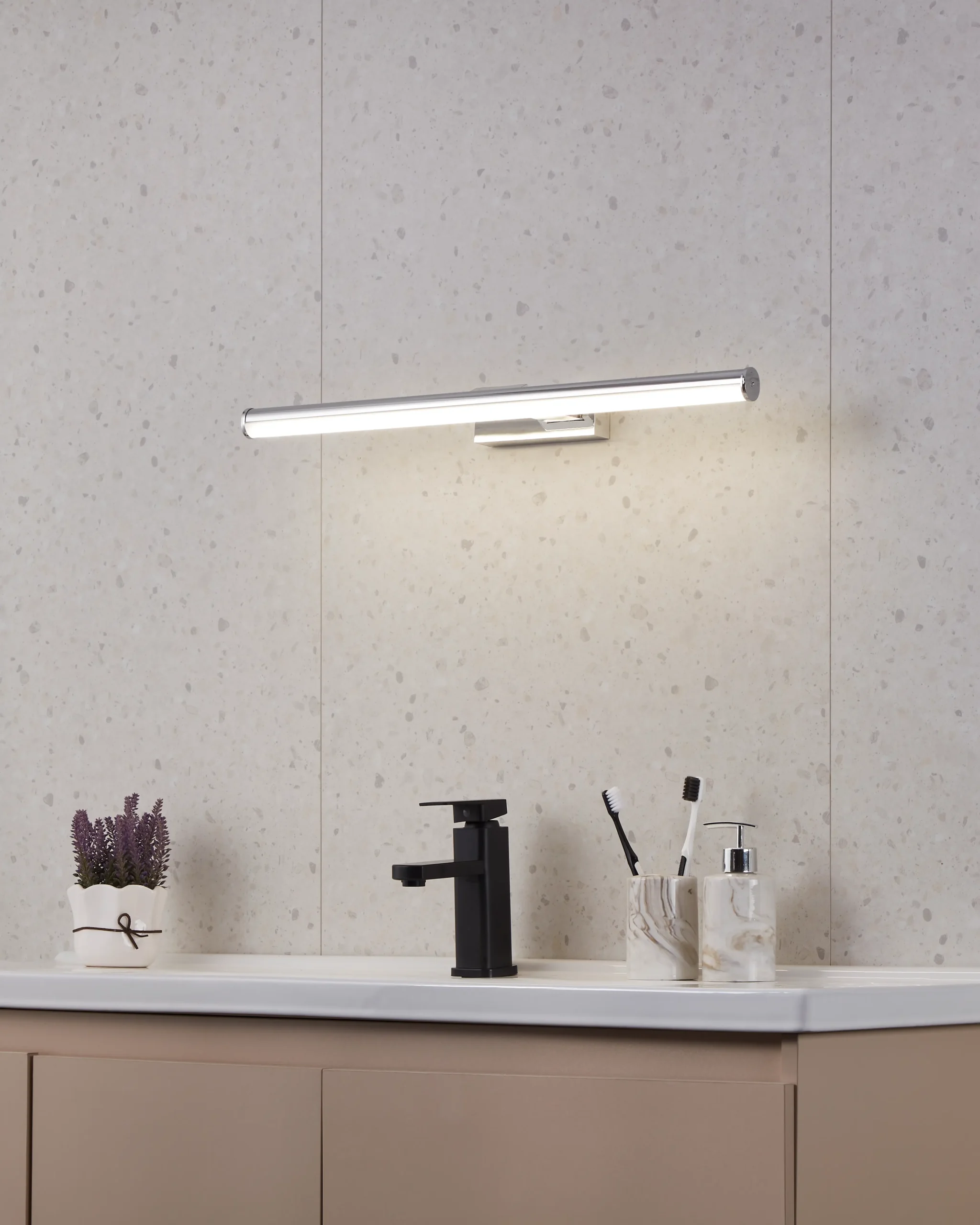 Compact Dimensions – Measures 600mm in length, 50mm in height, and extends 125mm from the wall, fitting seamlessly above mirrors or vanities.