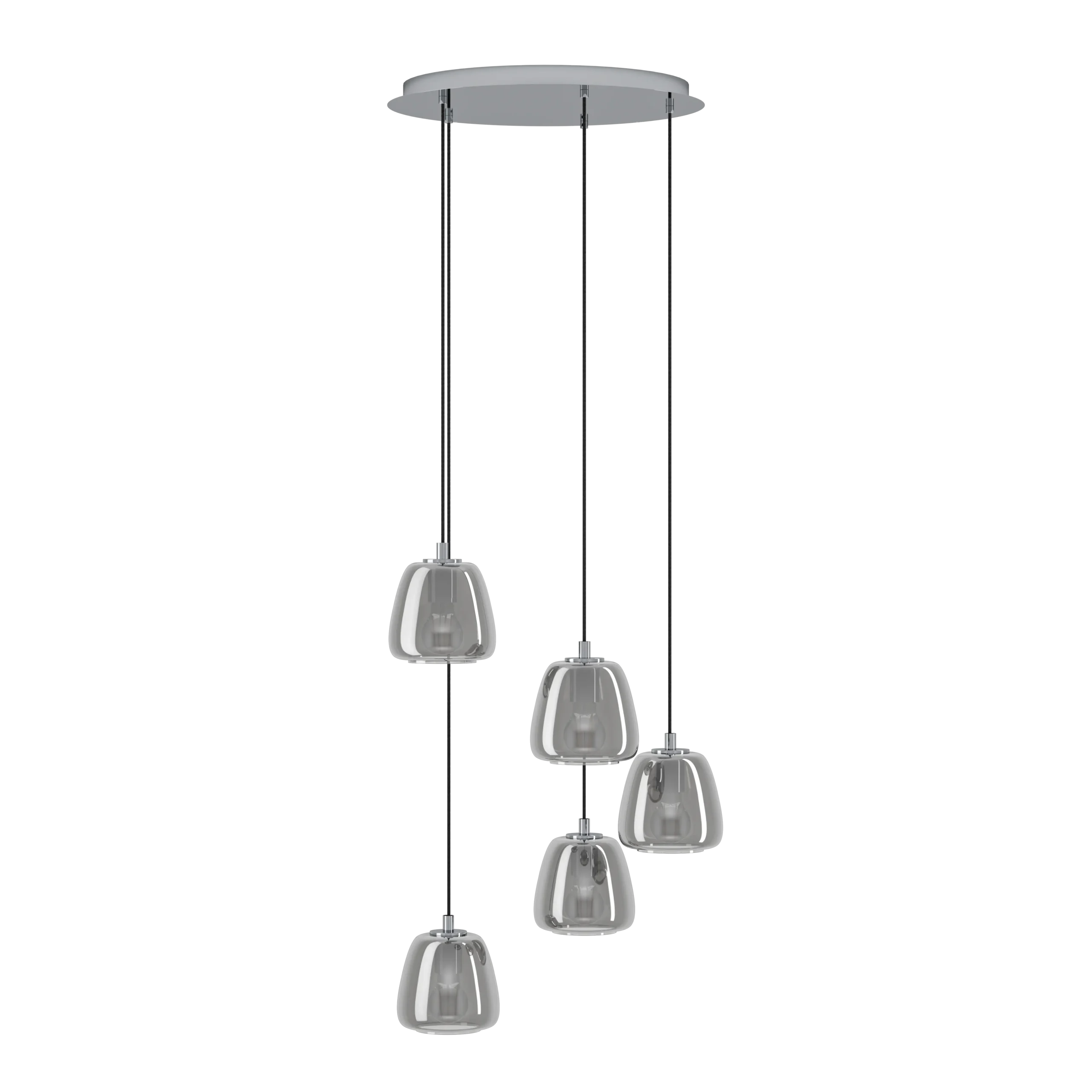 ALBARINO 5‑Lamp Pendant – Chrome Steel Frame with Black‑Transparent Vaporized Glass – E27 Sockets, 5×40W, 55cm Ø × 150cm H, Adjustable Indoor Hanging Lamp