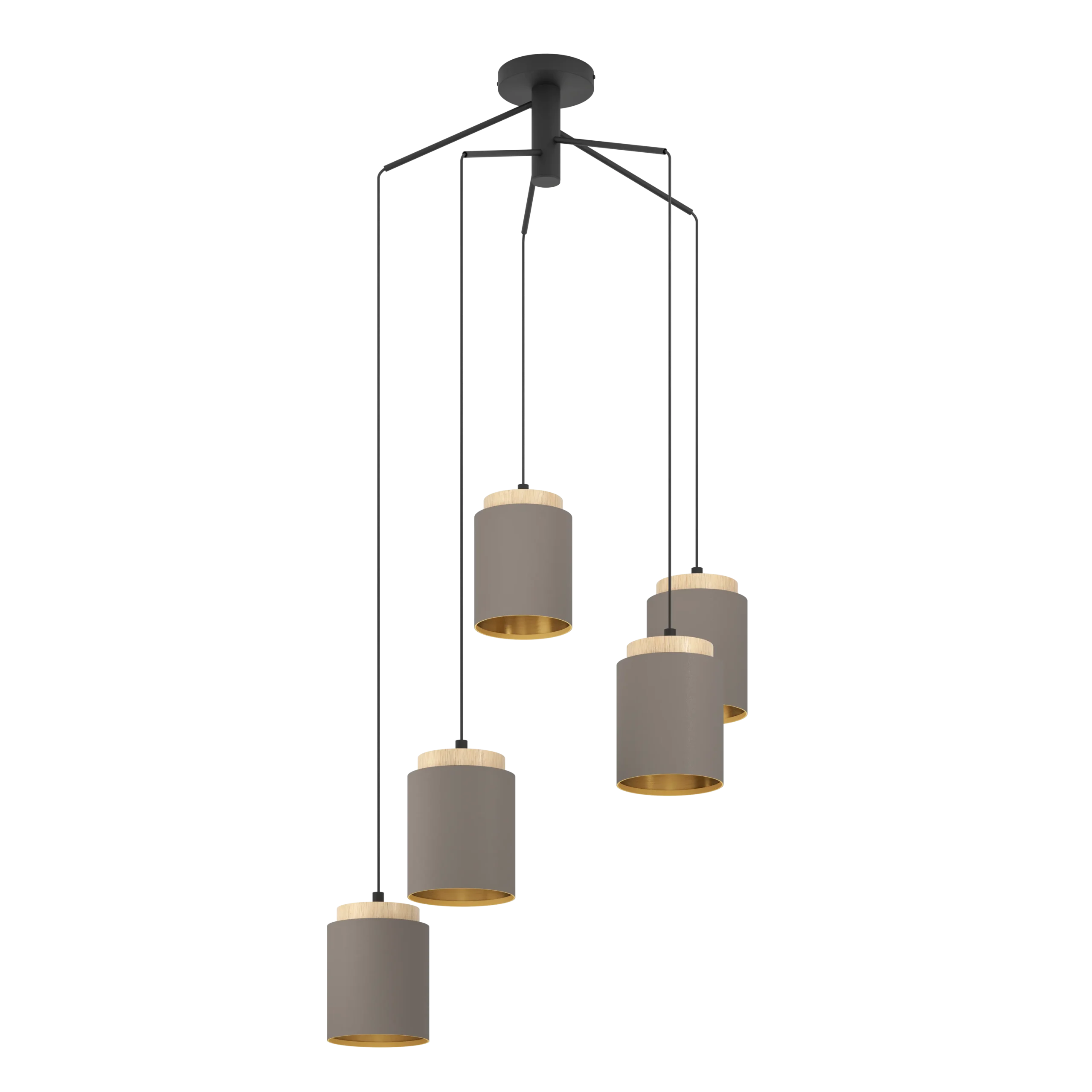 Elegant multi‑drop cascade design – Five cappuccino fabric shades with warm gold interiors are suspended from a black steel canopy featuring stylish wood accents, delivering a modern industrial-scandi look.