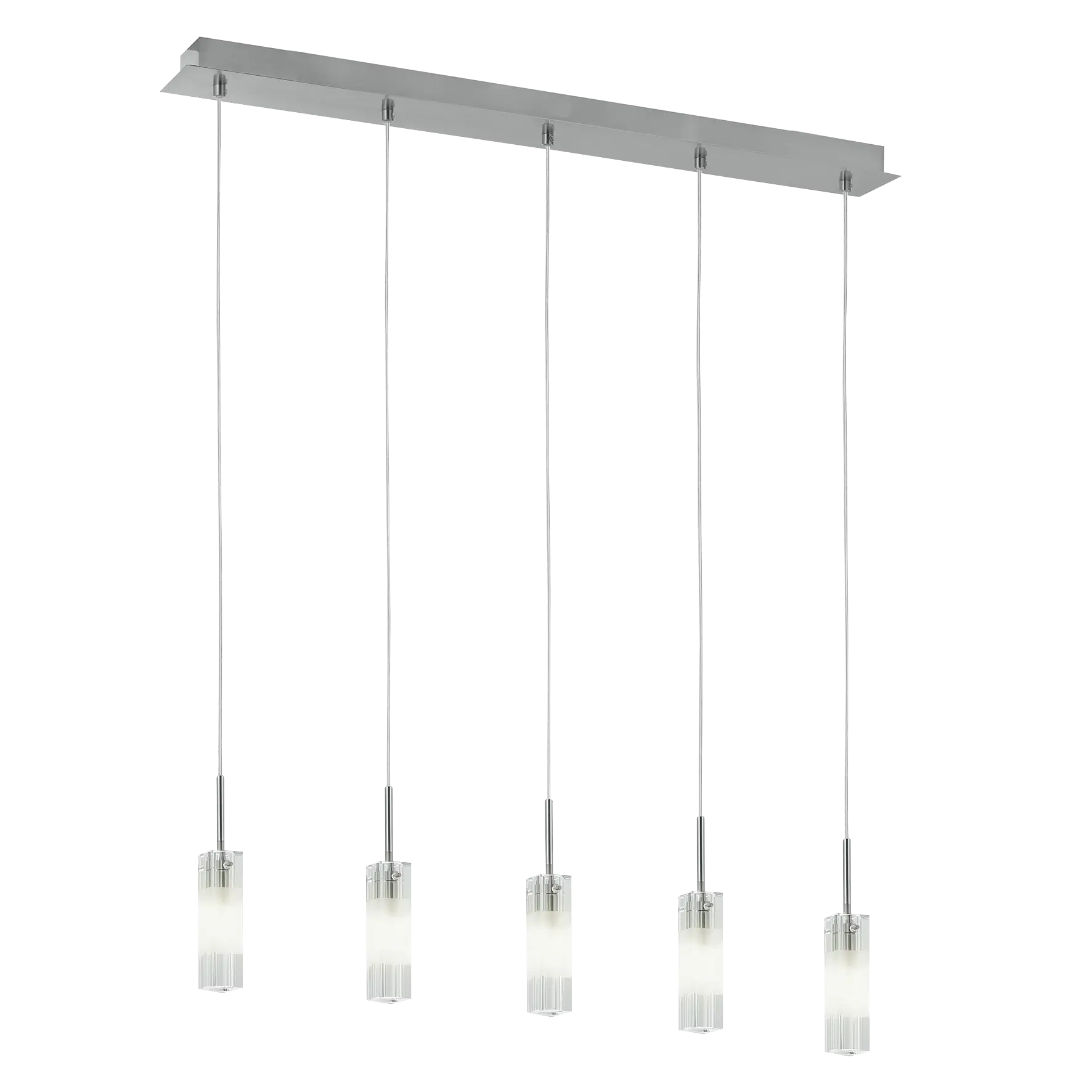The 88847 ALESSA pendant light features a satin nickel steel enclosure combined with a clear glass shade finished with a brilliant satin effect. It measures 1100 mm in height, 870 mm in length, and 100 mm in width, weighing 4 kg. This indoor fixture supports five 20W G4 halogen lamps, emitting warm white light at 2700K. Operating on 220-240V with an IP20 protection rating and without a built-in switch, the ALESSA pendant light offers sophisticated illumination with a modern design aesthetic, suitable for contemporary interior spaces.