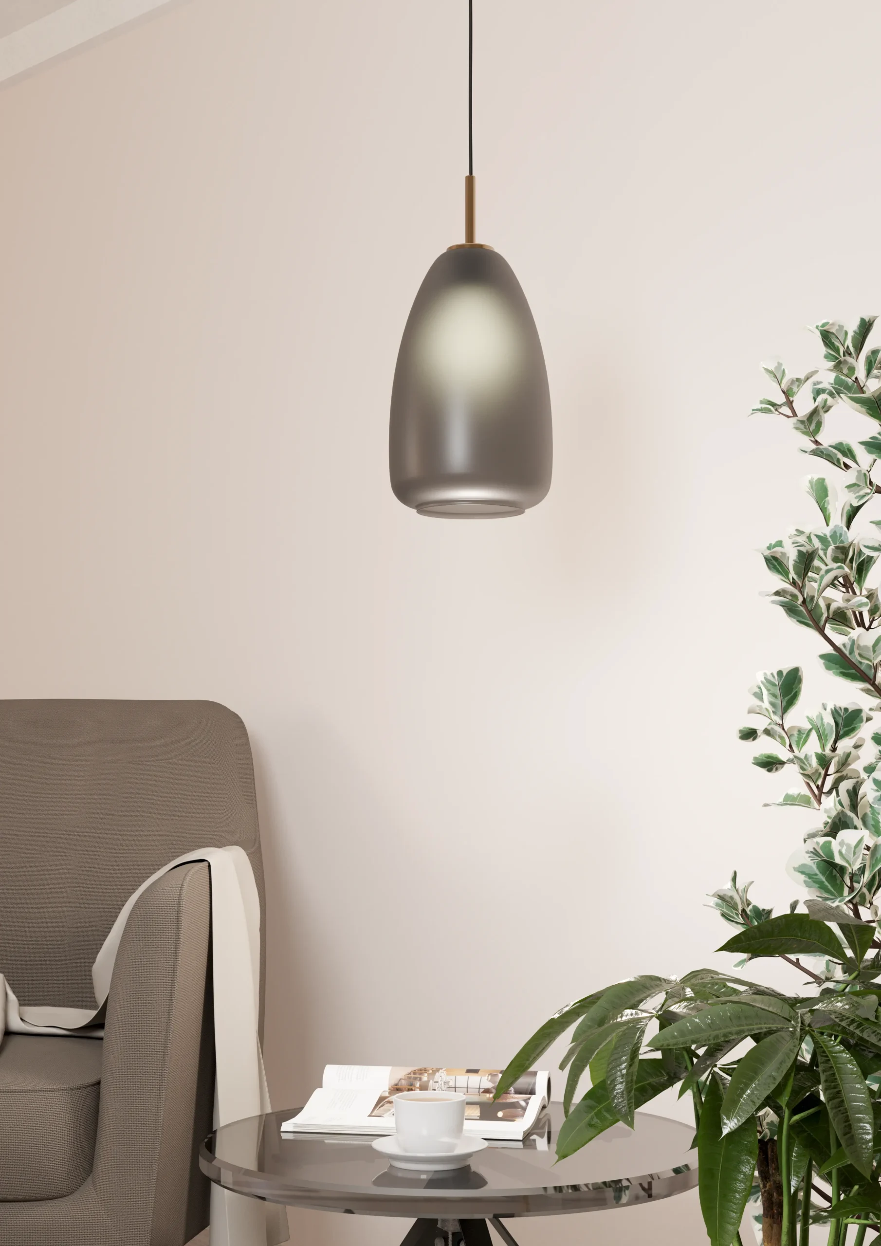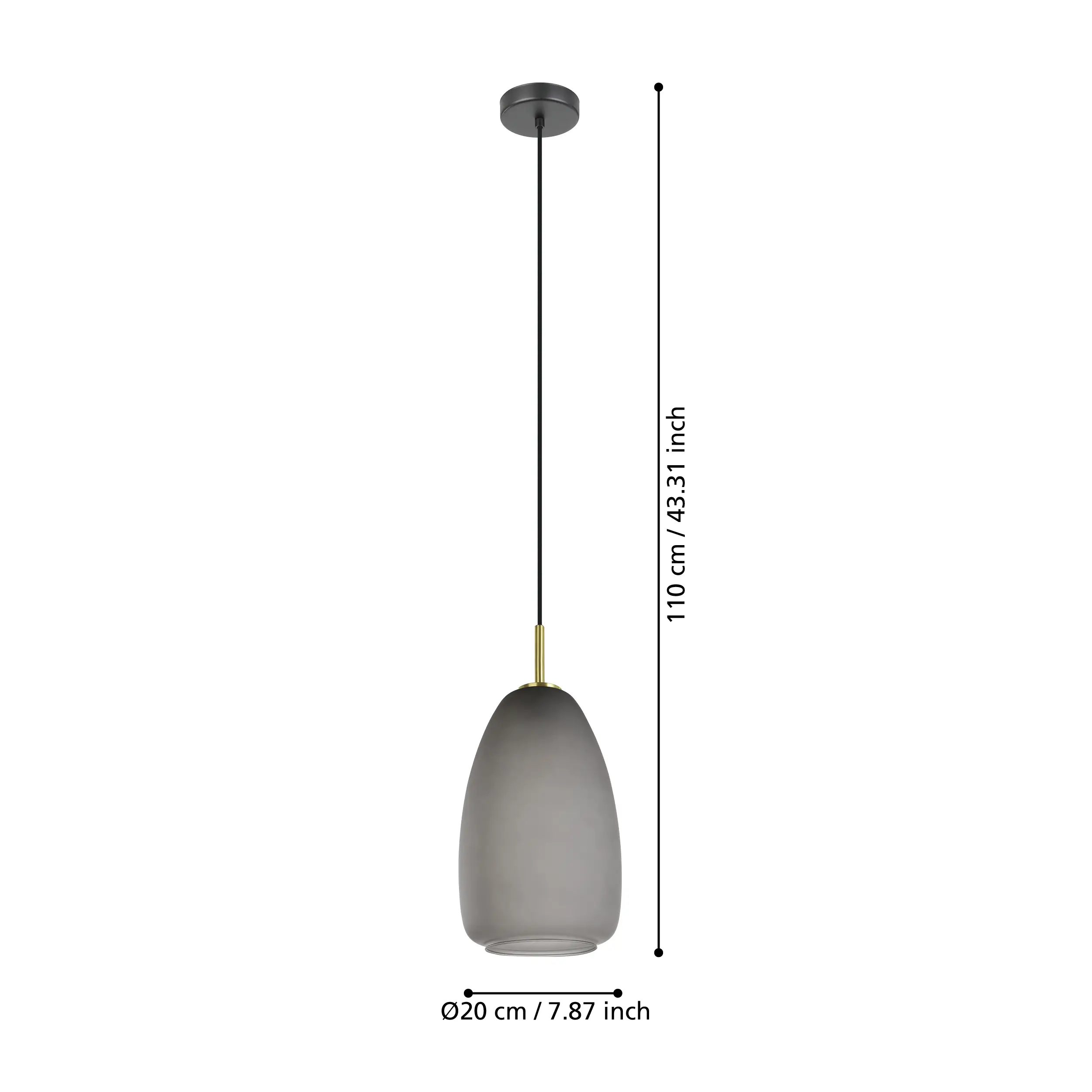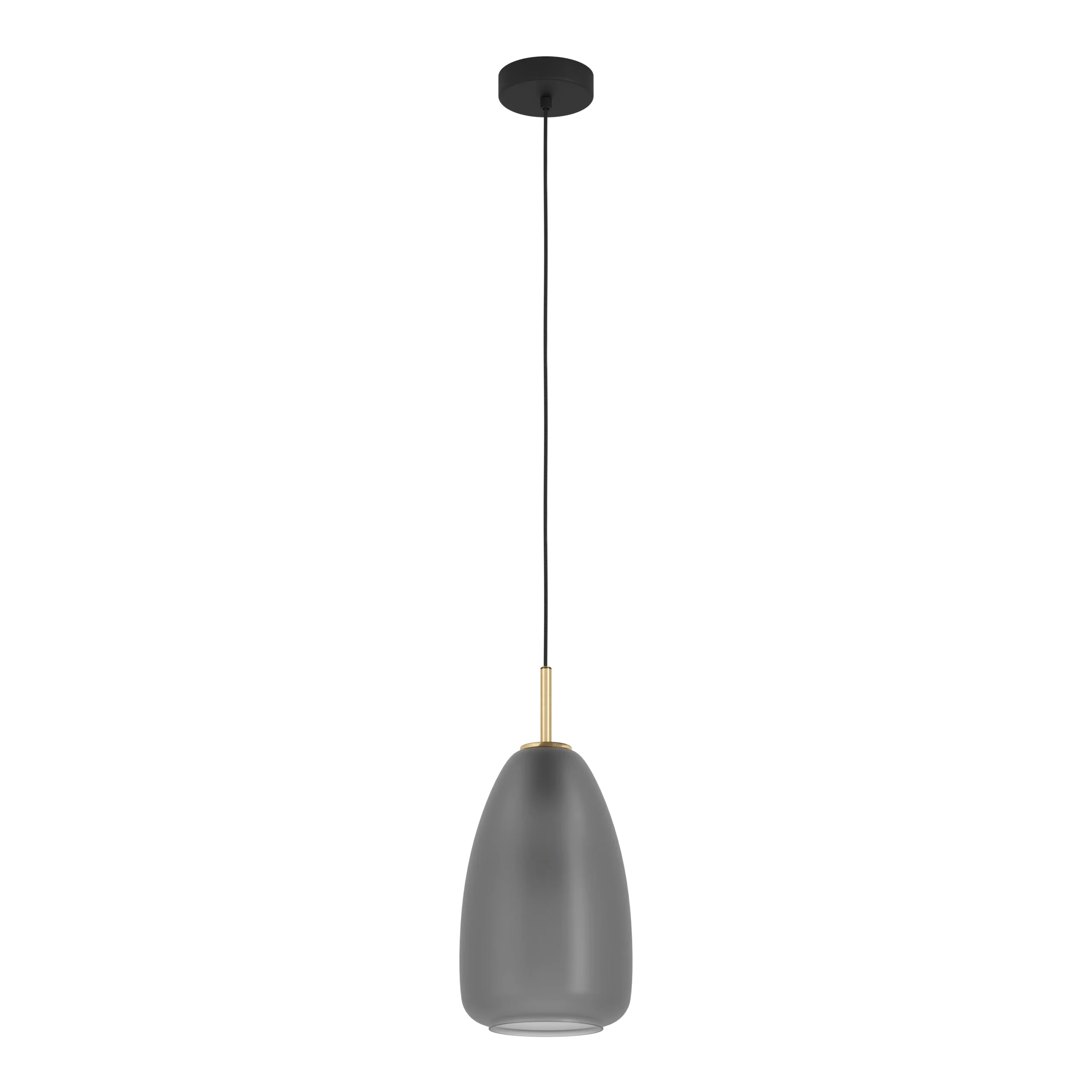 Premium designer Lamping: Stylish EGLO ALOBRASE pendant featuring a black steel canopy and brushed brass accents, complemented by a matte grey satin glass shade.