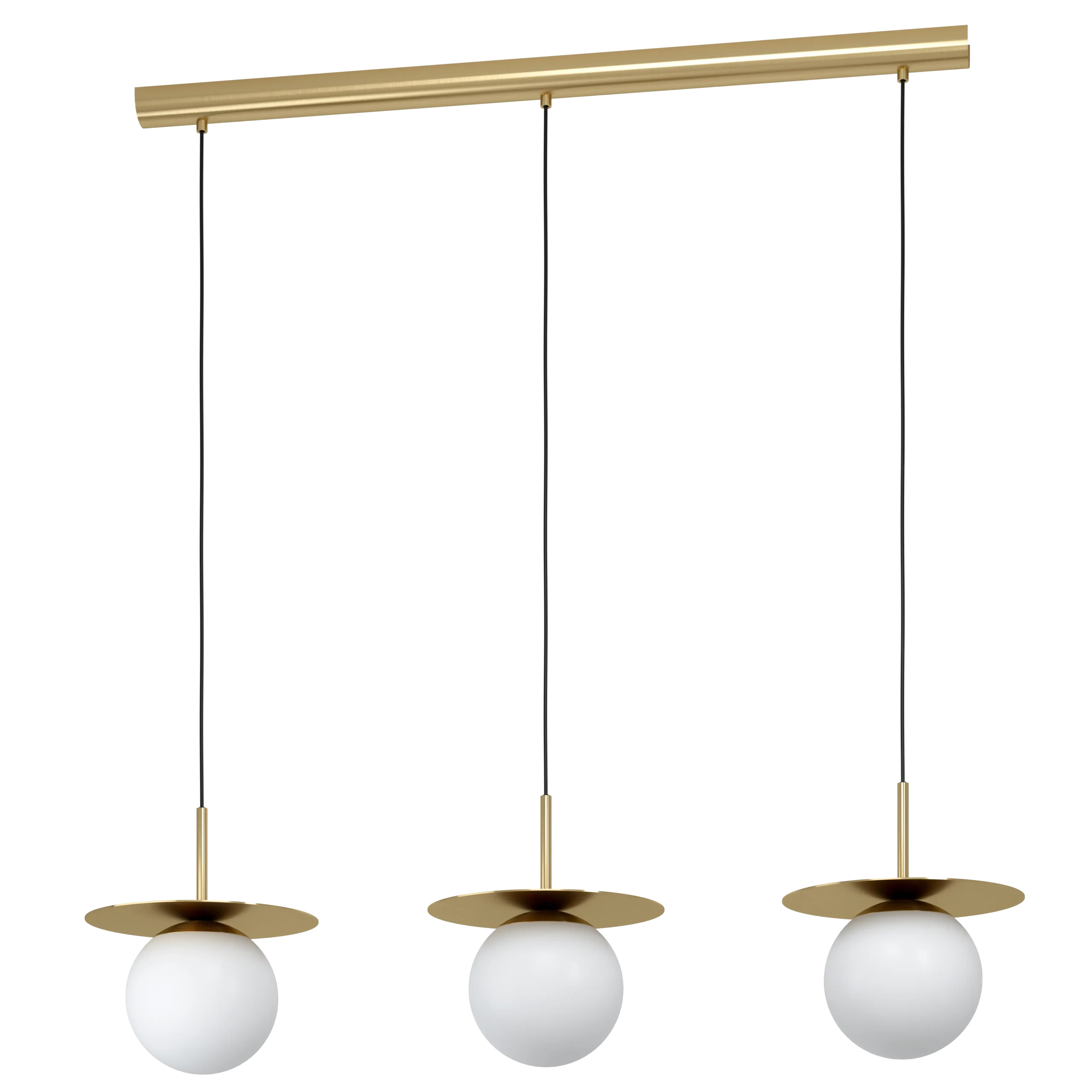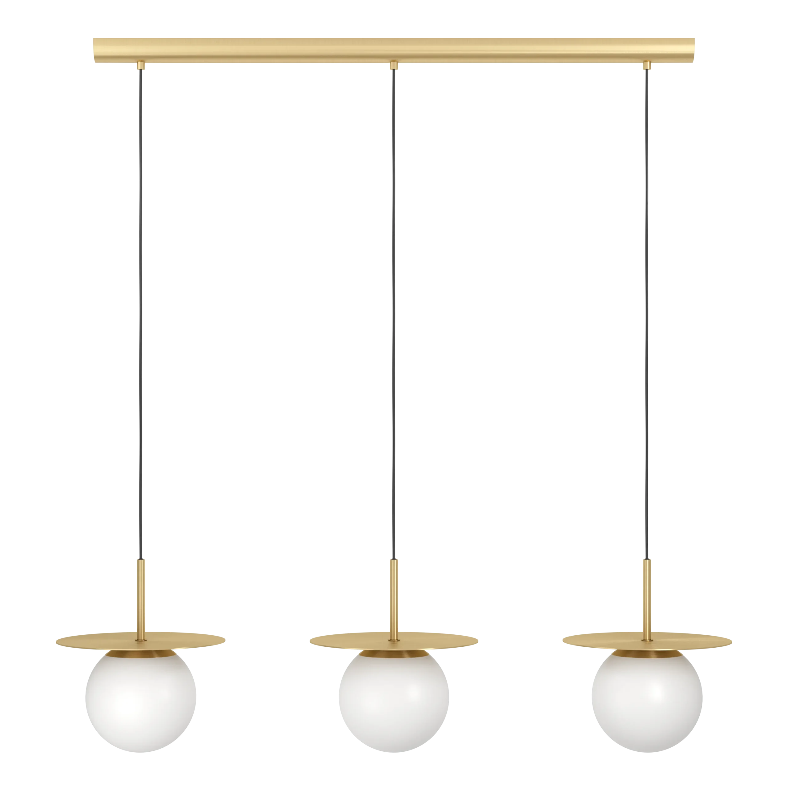 Contemporary Linear Globe Cluster Design: Features three matte-opal glass globes hanging from a brushed-brass steel canopy, creating a sleek, soft-glow cluster perfect for modern interiors.