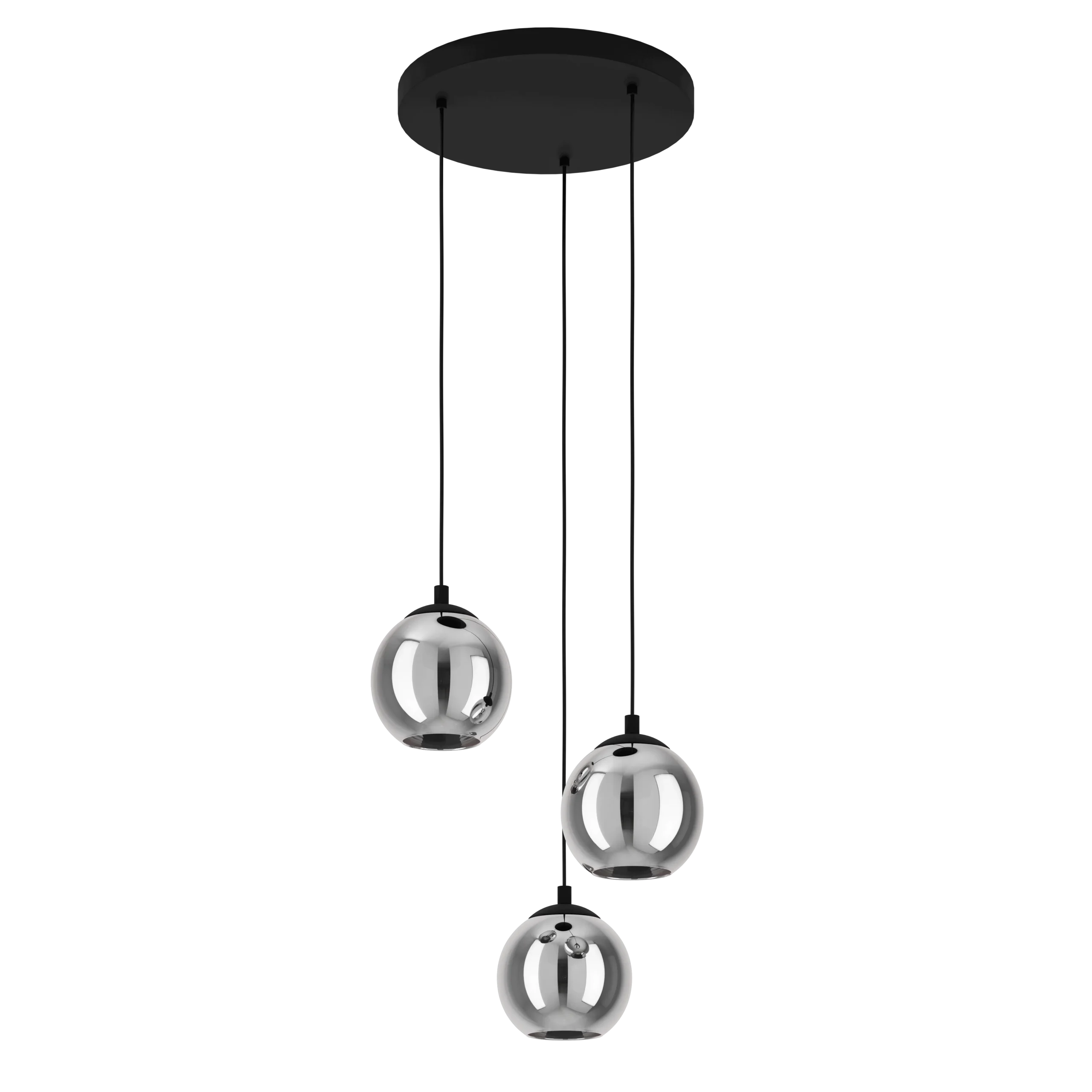 Stylish Clustered Design – Three black‑transparent vaporized glass globes hang at varying heights from a sleek black steel canopy (42.5cm diameter), creating an eye-catching sculptural look—perfect for dining areas, kitchens, or living rooms.