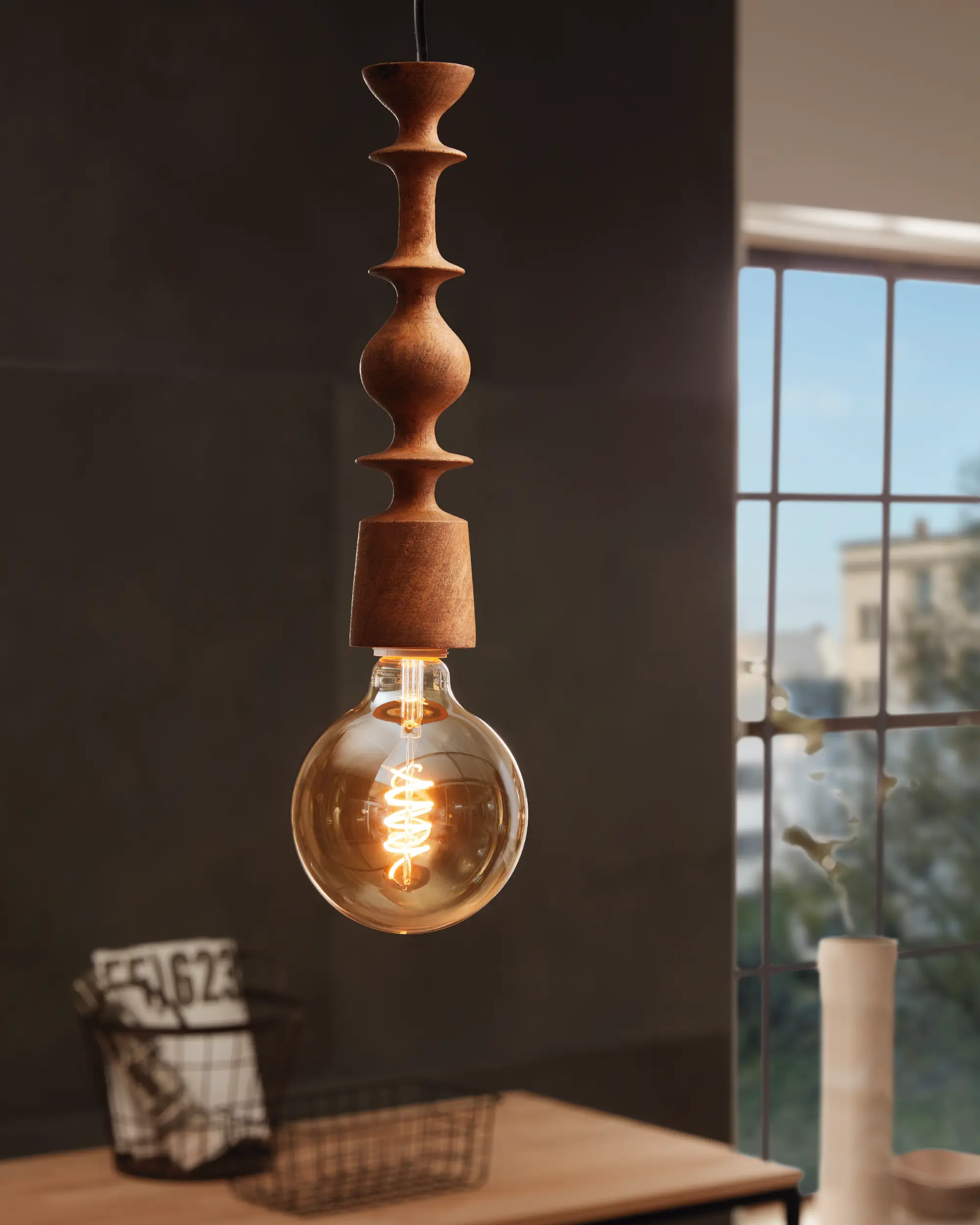 Expressive Shadow Play: The natural wood form beautifully highLamps decorative bulbs, casting warm ambiance and highLamping its minimalist charm.