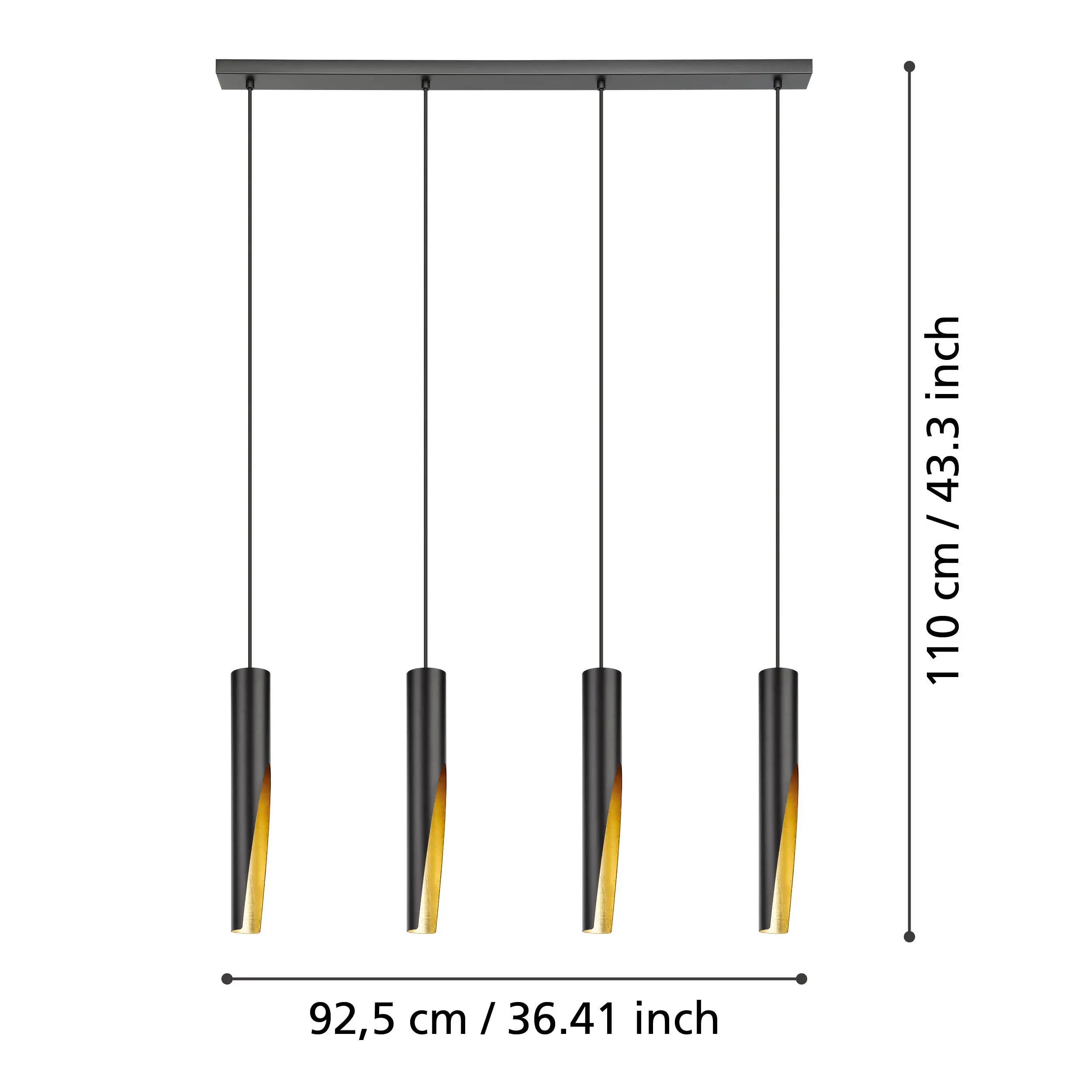 Striking black-and-gold style – Four sleek tubular steel shades finished in matte black with gold interiors capture modern industrial flair and create warm, reflective illumination.