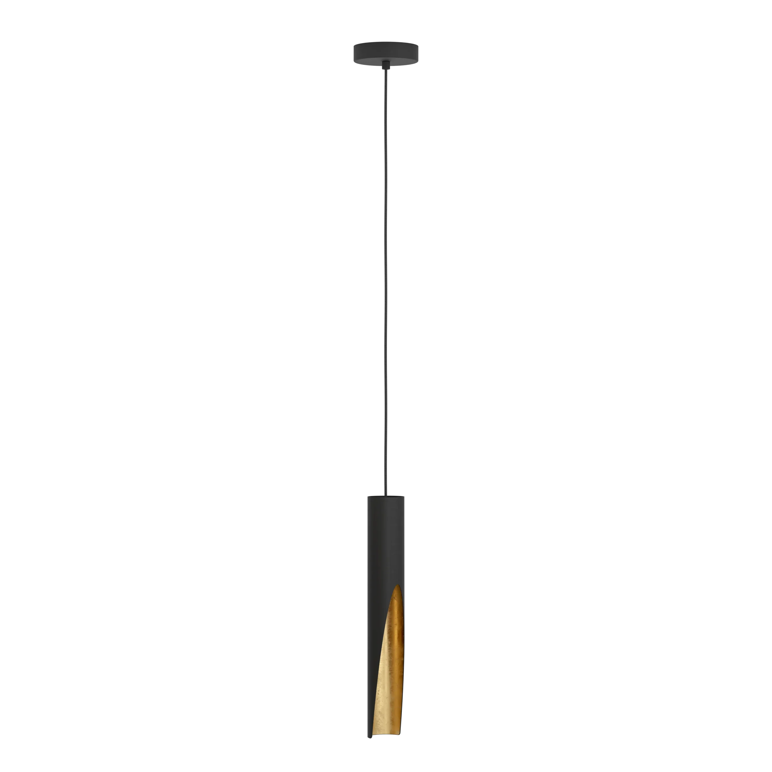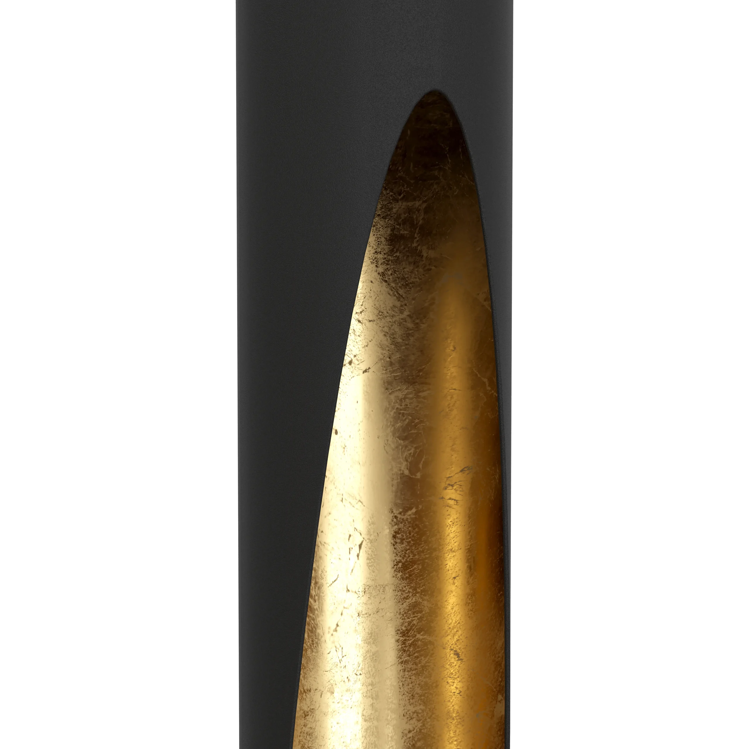 Sleek Black-and-Gold Aesthetic: A slender cylindrical pendant crafted from matte black steel with a luxurious gold-leaf interior—a striking blend of minimalism and elegance.
