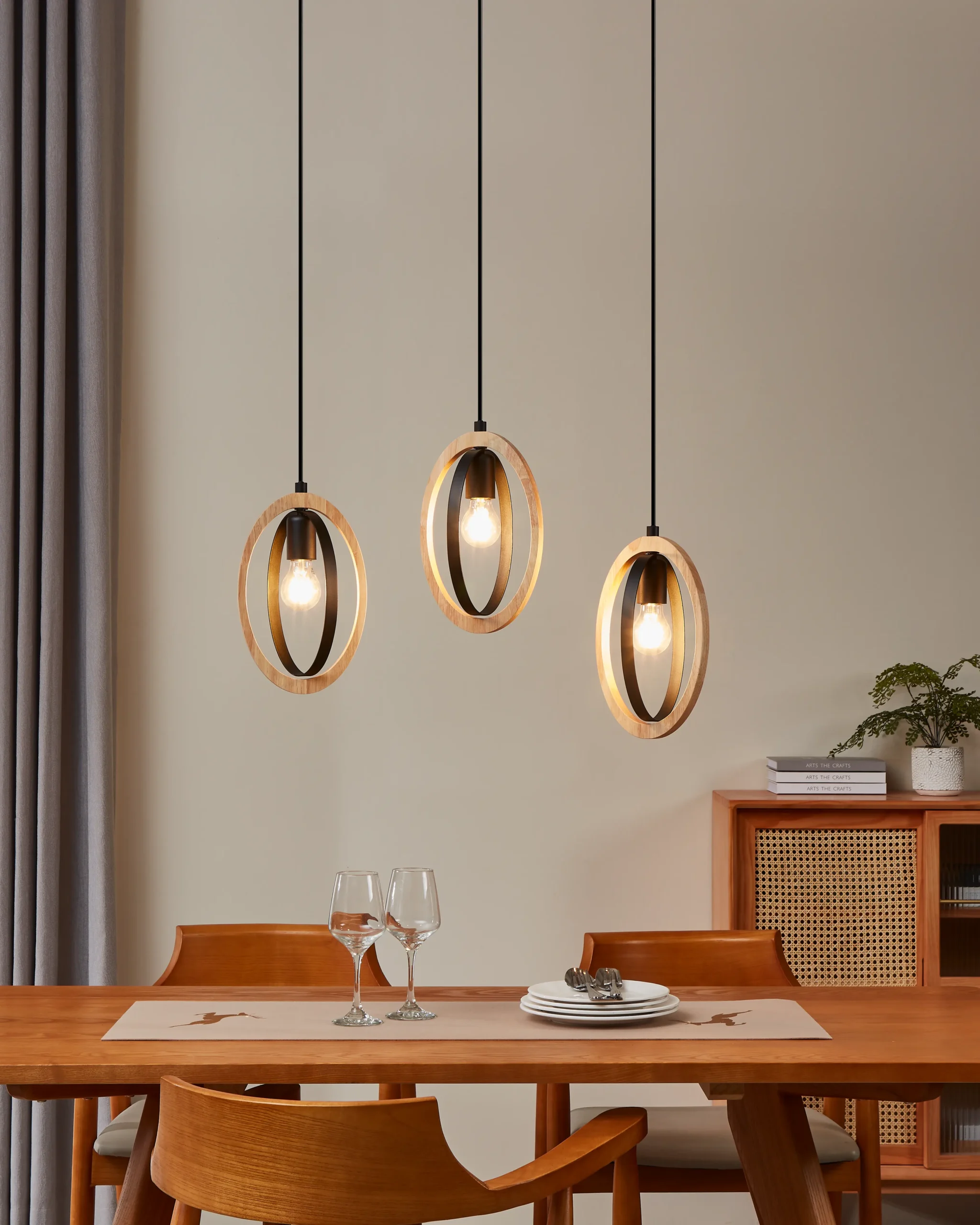 Stylized Vintage‑Industrial Fusion: Three oval rings combining black steel and pale wood, suspended from a sleek black bar—ideal for kitchens, dining areas, or compact living rooms. The interlocking shapes create a captivating play of Lamp and shadow.