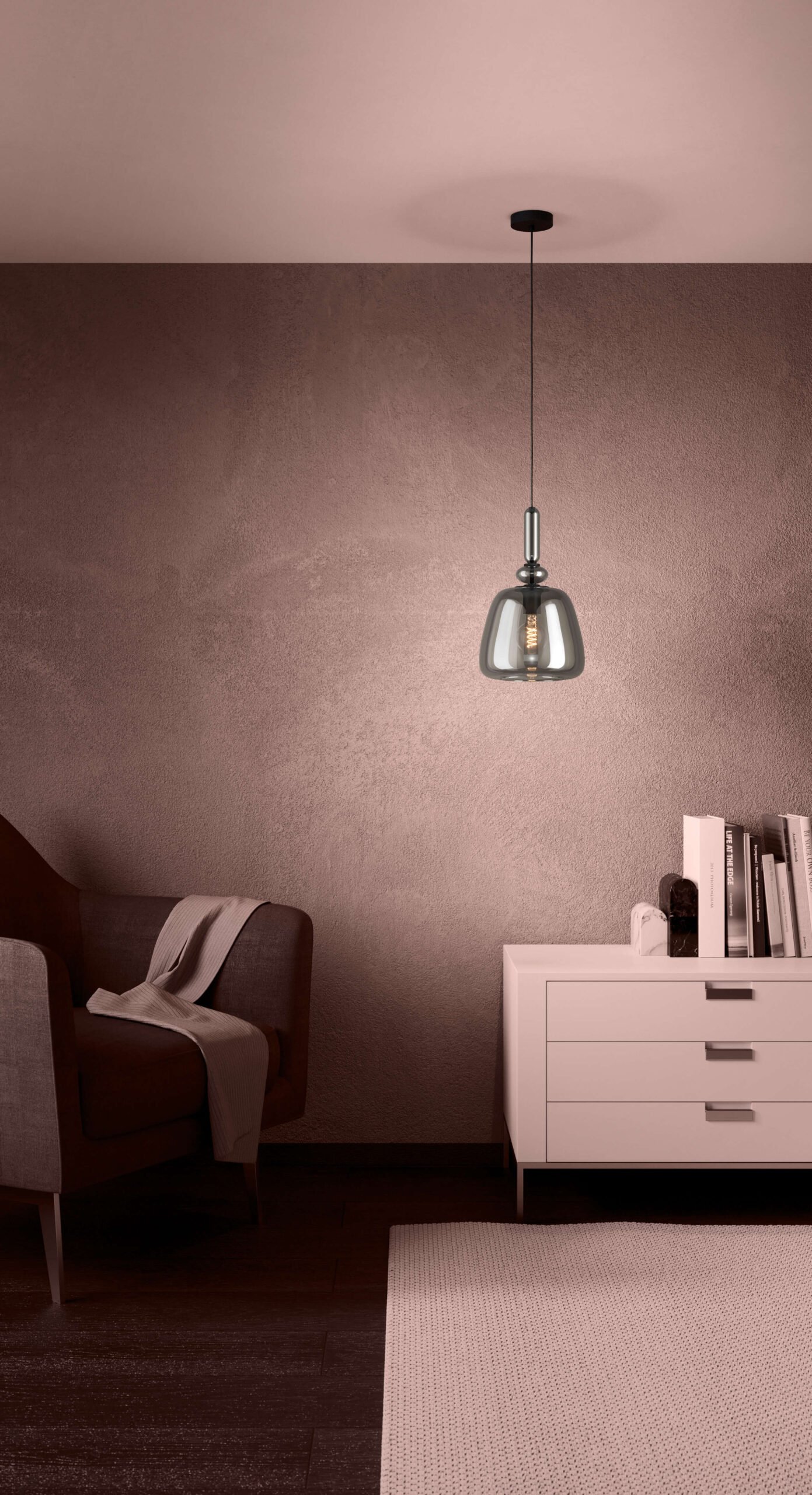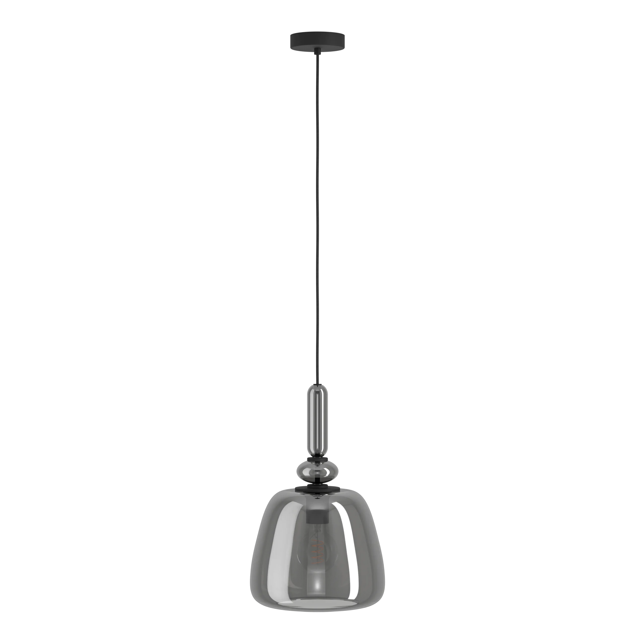 BOVINO 1‑Lamp Pendant – Black-Steel & Smoked Vaporized Glass Shade – 26cm Ø × 1.5m Adjustable Suspension – E27 Socket, 40W – Modern Loft Accent Lamping