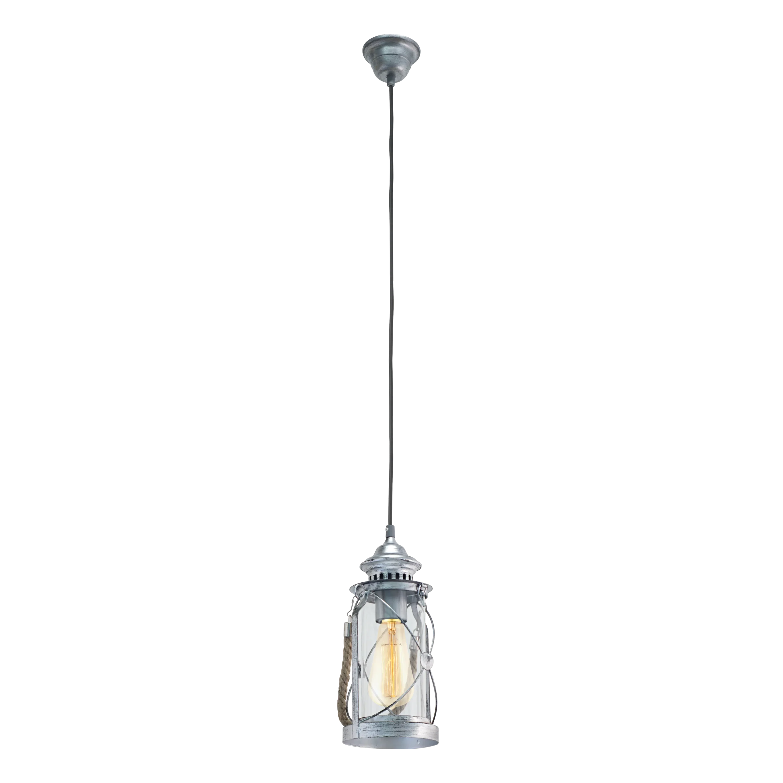 Classic lantern pendant design – Antique-silver steel frame with clear glass cylinder and decorative rope handle, inspired by vintage lantern styles (model49214).