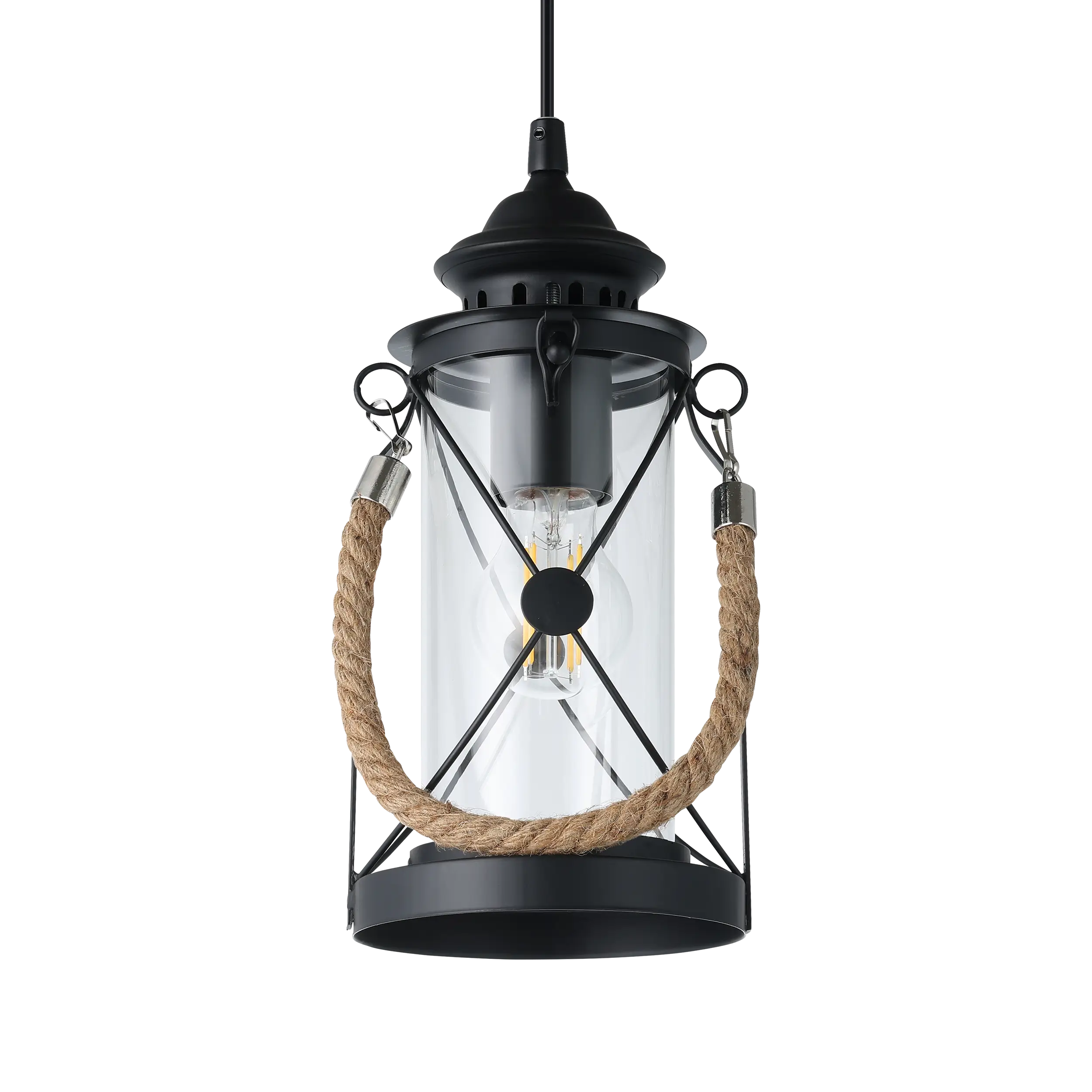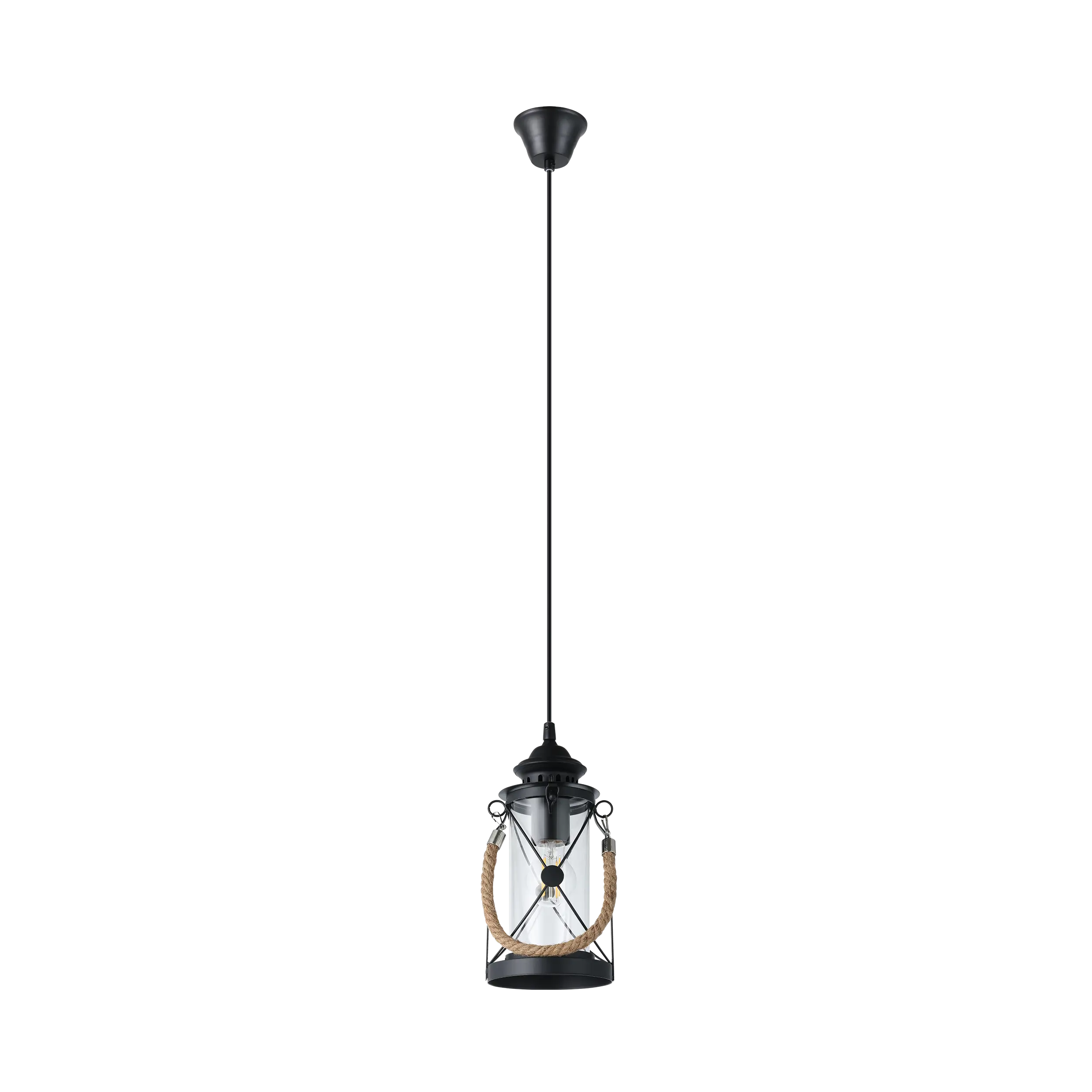 Vintage lantern-style pendant – Steel body in matte black with clear glass cylinder and decorative rope accent for timeless elegance (model49213).
