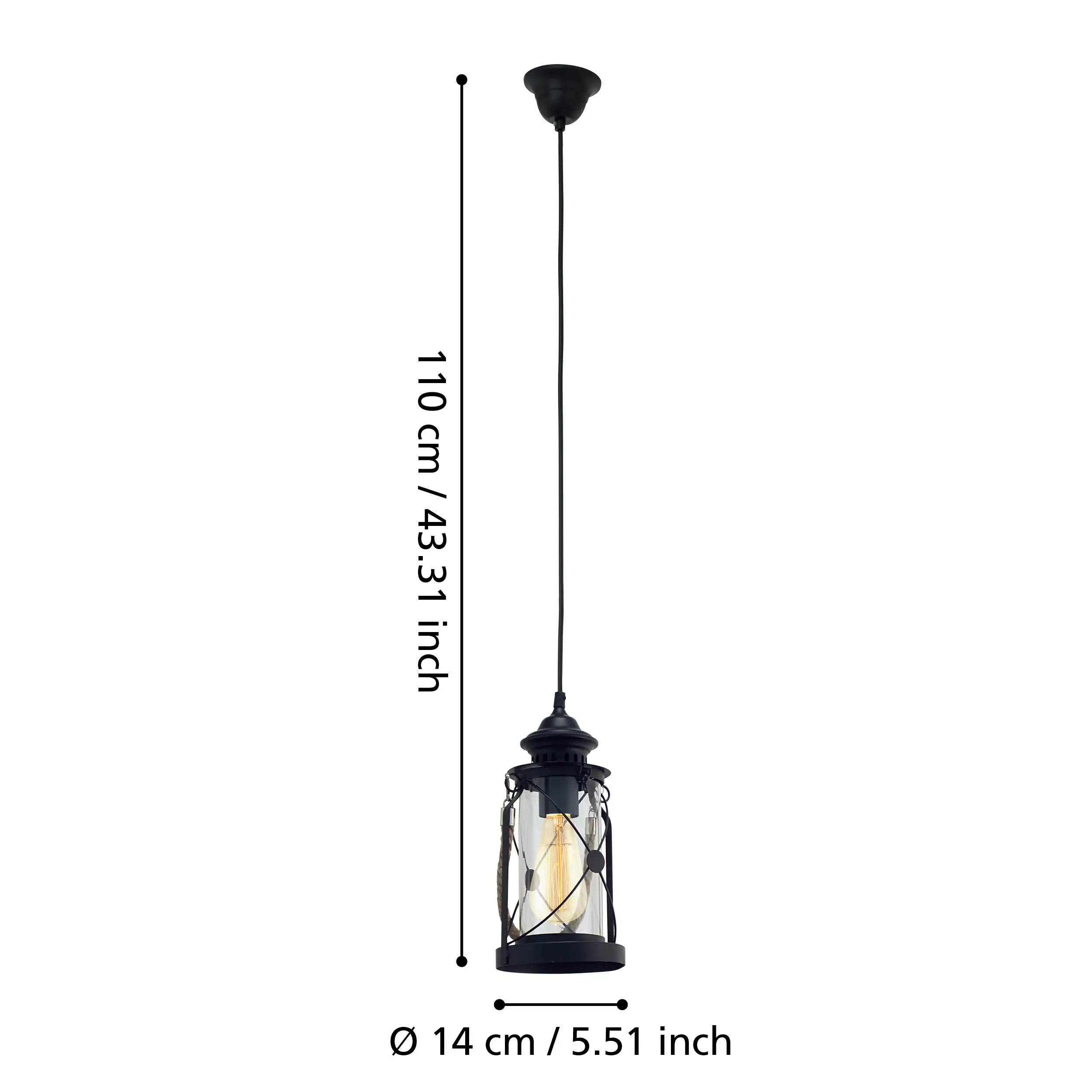 Material & finish – Durable steel frame with clear glass shade; traditional rope handle adds rustic character.