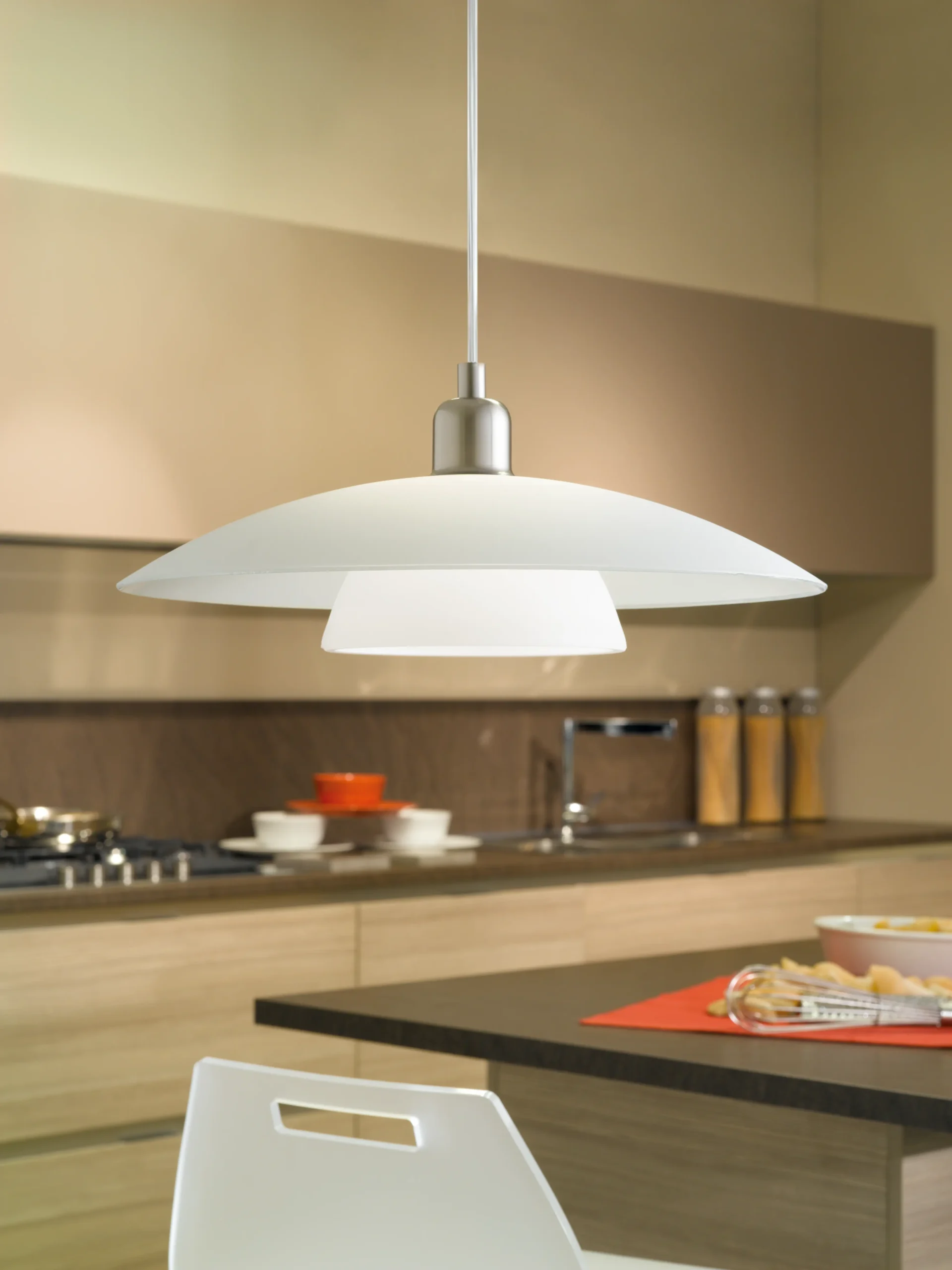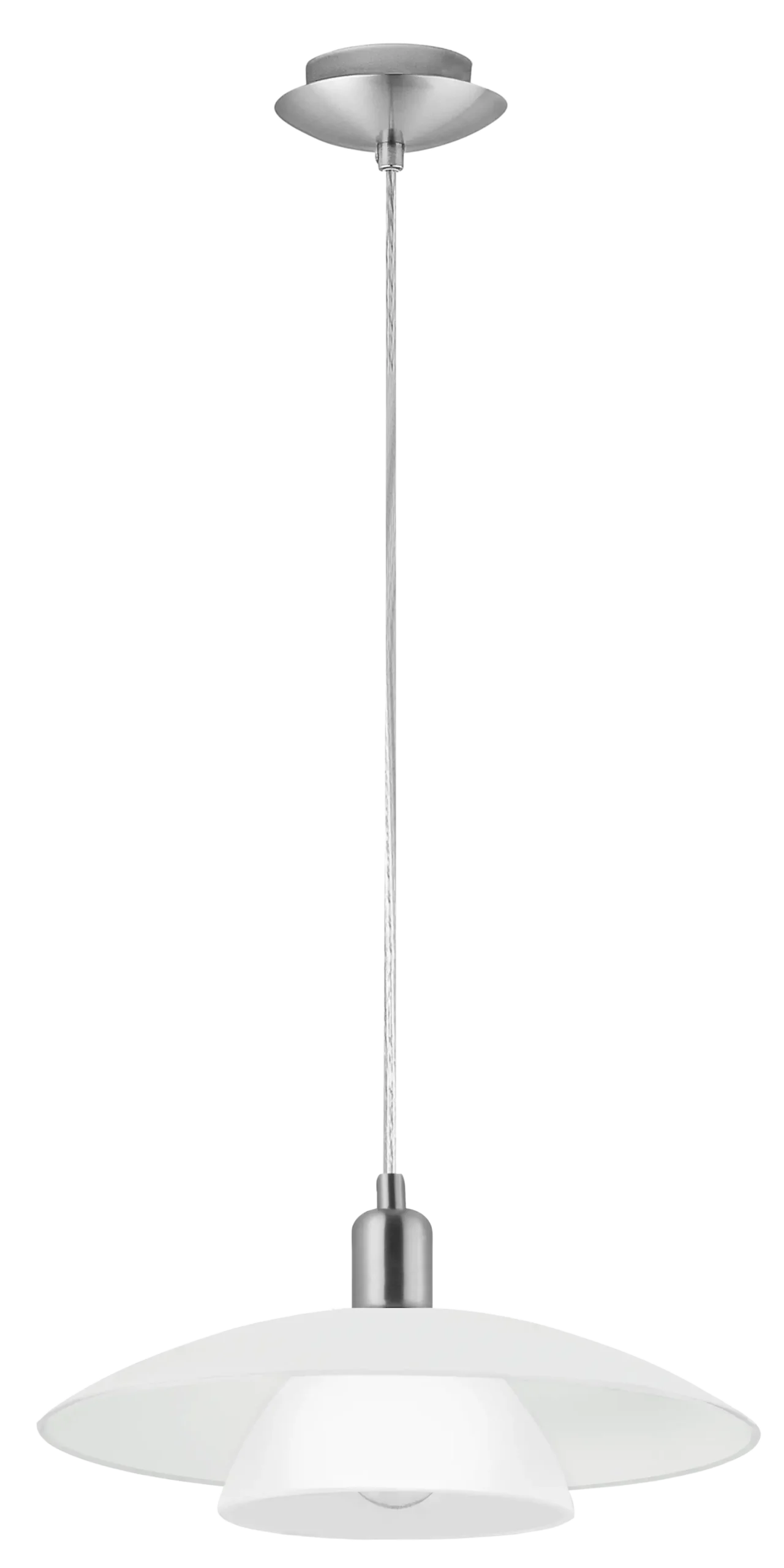 Timeless Minimalist Design: Features a clean, double-layer satin-glass shade suspended by a satin-nickel steel canopy—offering a soft, evenly diffused glow that suits modern dining rooms, kitchens, living spaces, or offices.