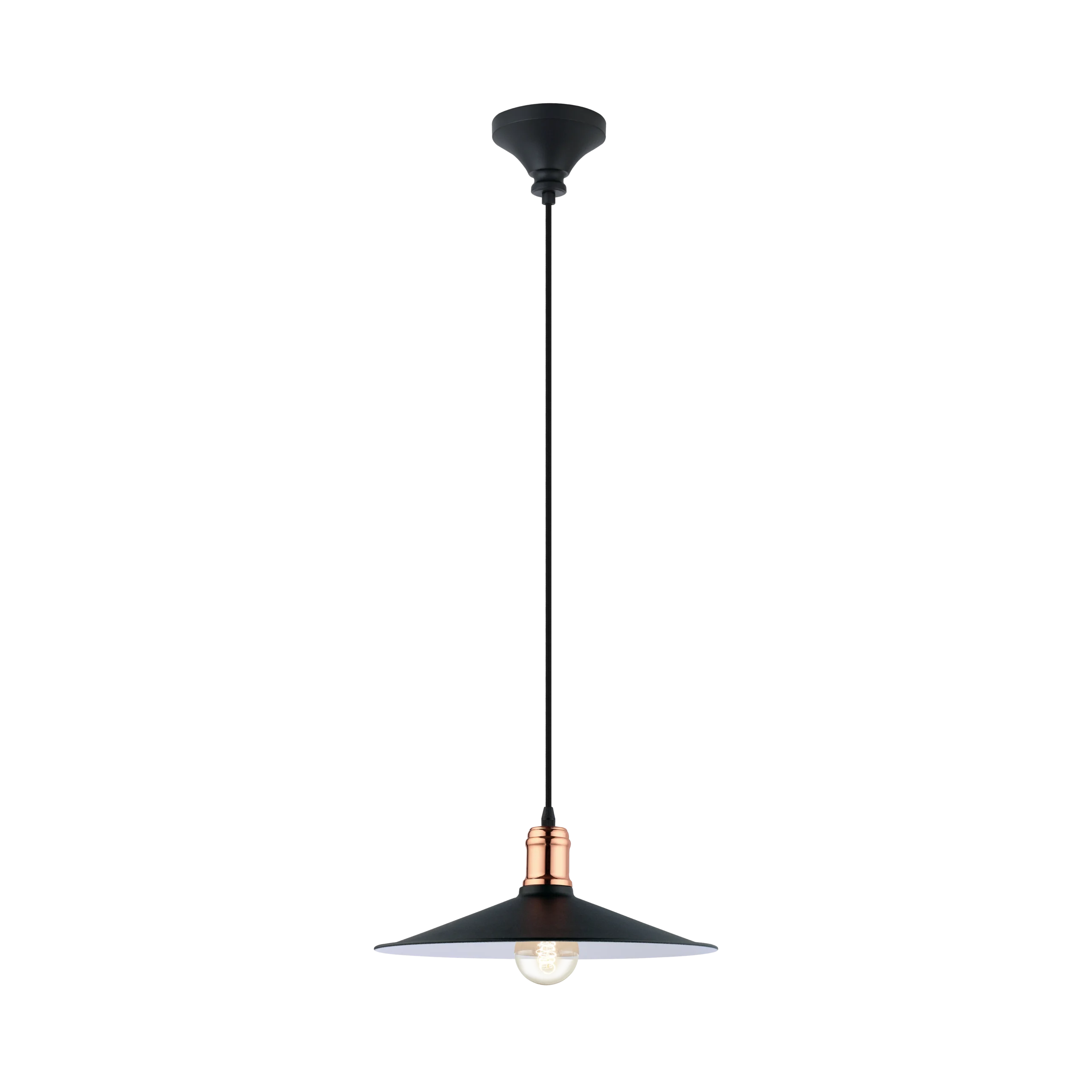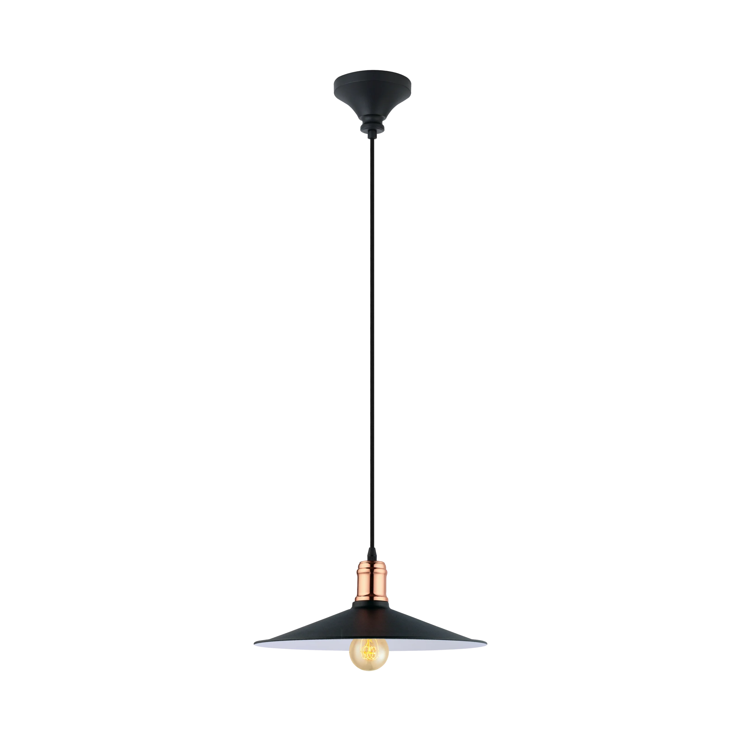Vintage Industrial Charm – Features a wide black-steel shade with contrasting white inner lining and stylish copper detail at the top, offering timeless appeal for kitchens, dining areas, hallways, or workspace lighting.