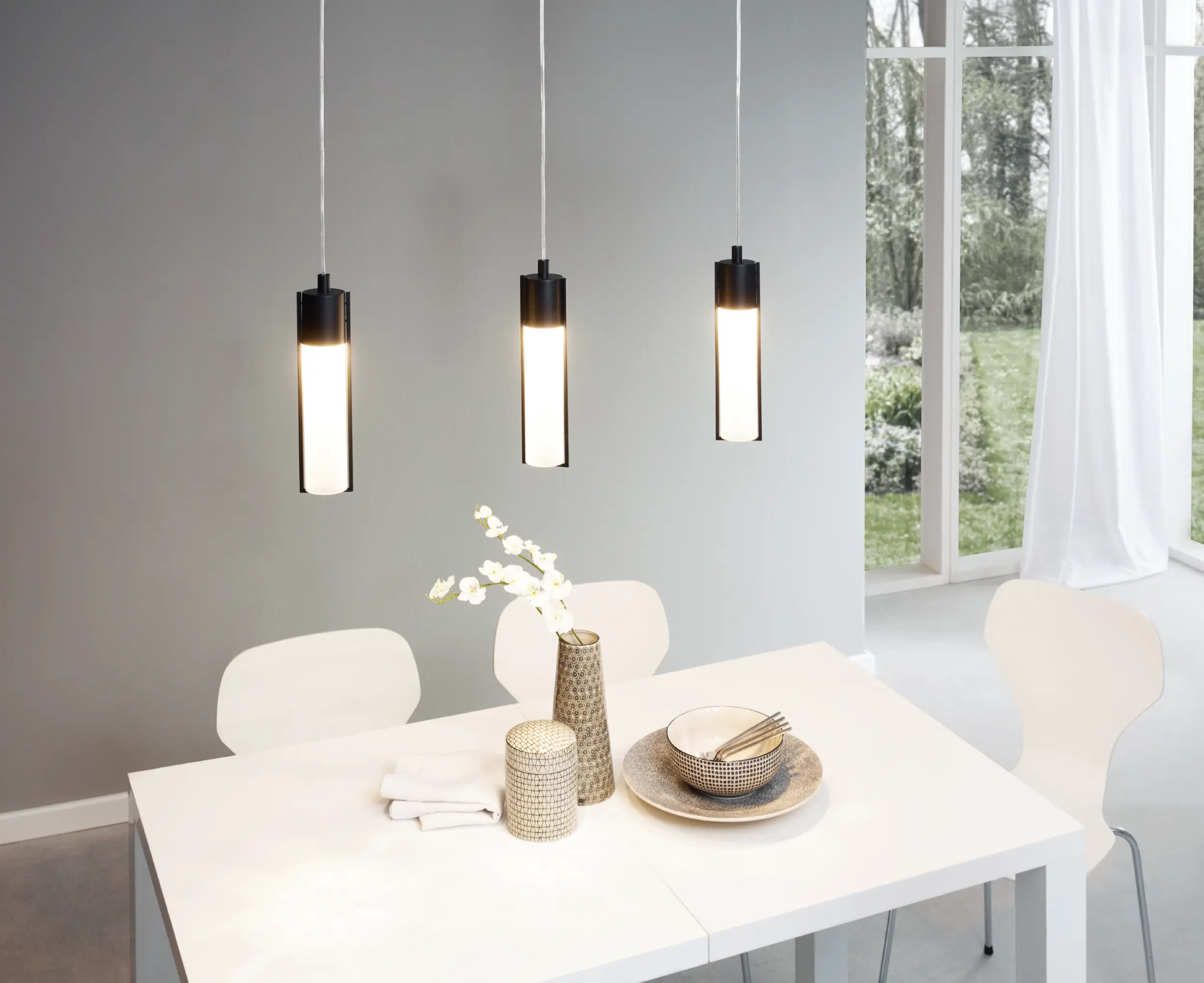 Sleek, Industrial Design – Features a 800×60×1,500mm black steel bar with three adjustable GU10 LED heads and white glass shades, complementing modern and industrial interiors.