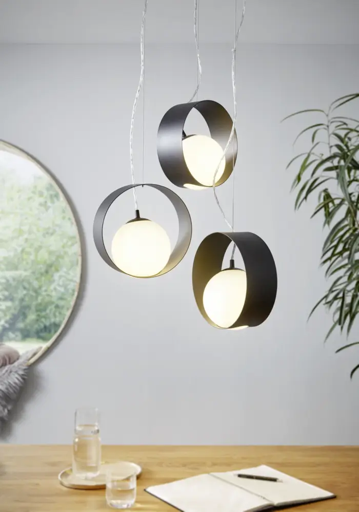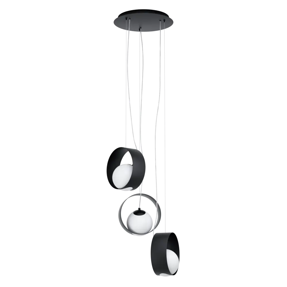 Elegant Modern Design: Three matte opal glass globes suspended at varying heights around a sleek black steel frame—adds sophistication and visual interest.