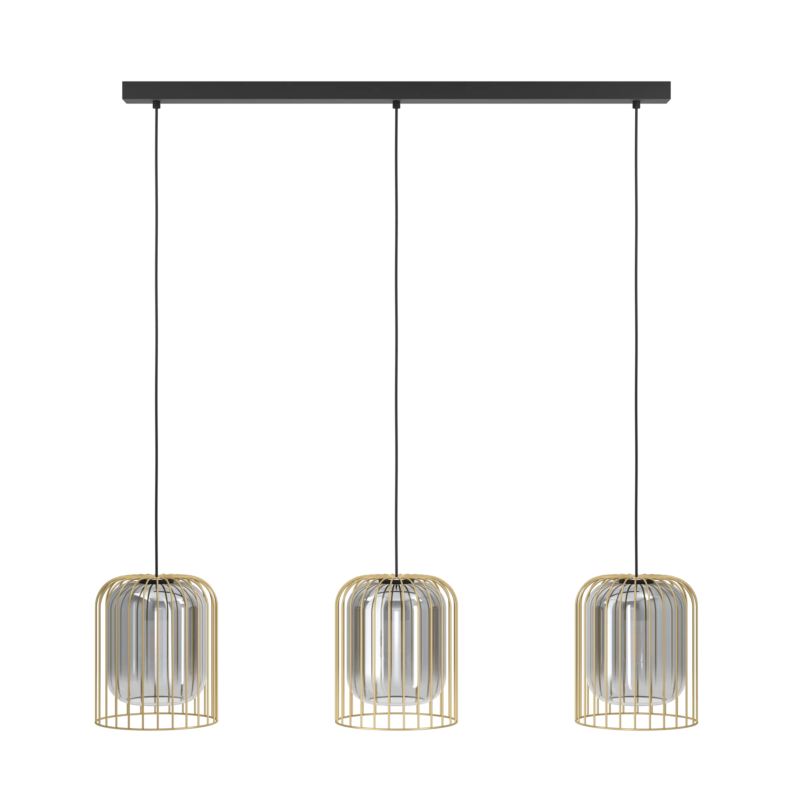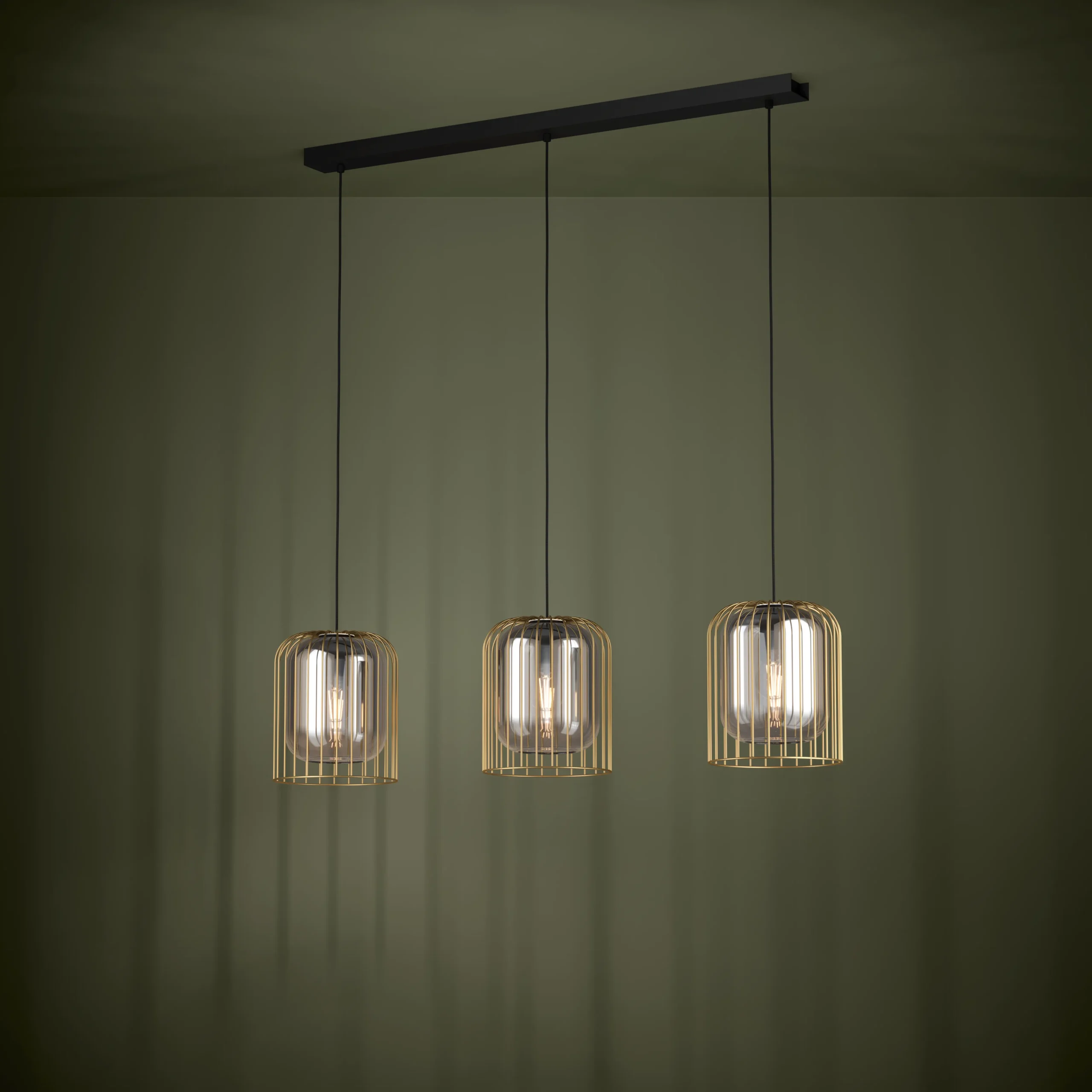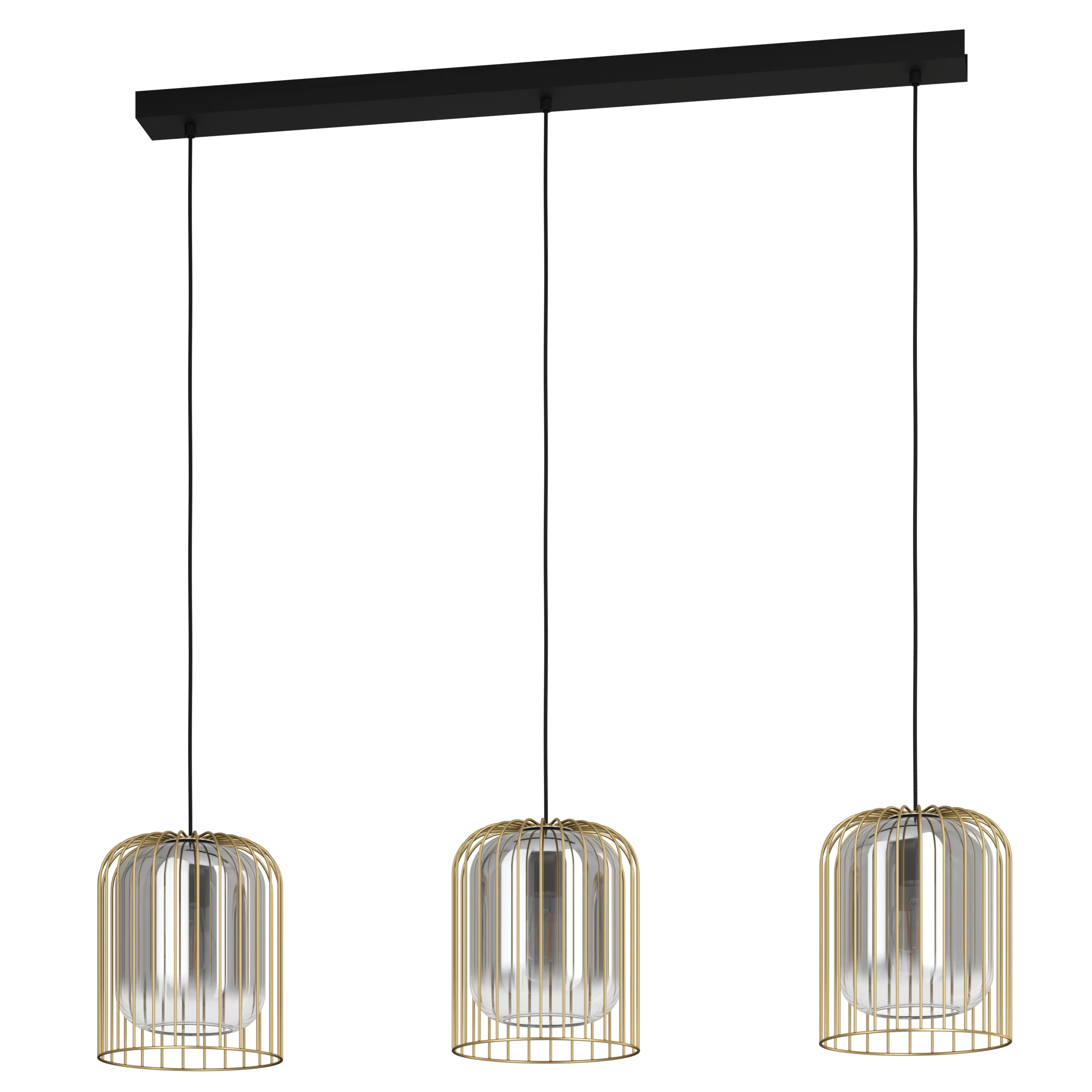 Elegant Dual‑Pendant Design: Features two vaporized black‑transparent glass shades suspended from a matte‑black steel canopy with warm gold interiors—ideal for lighting over kitchen islands, dining tables, or study areas.