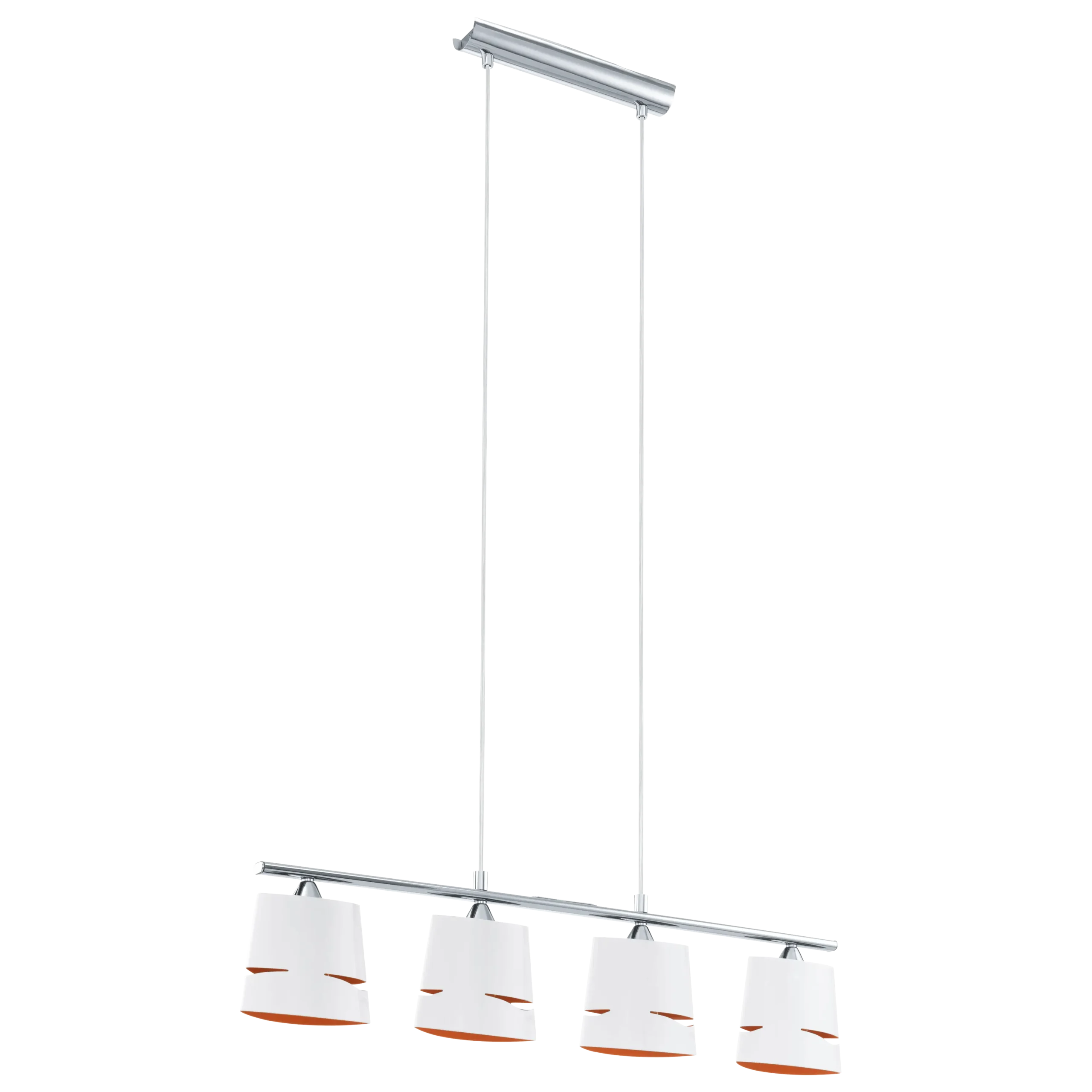 Vibrant color-pop pendant – Three steel shades in crisp white and bold orange hang from a sleek chrome-finished steel bar (750mm long), creating a playful, modern flair ideal for kitchens, dining areas, or creative studios.