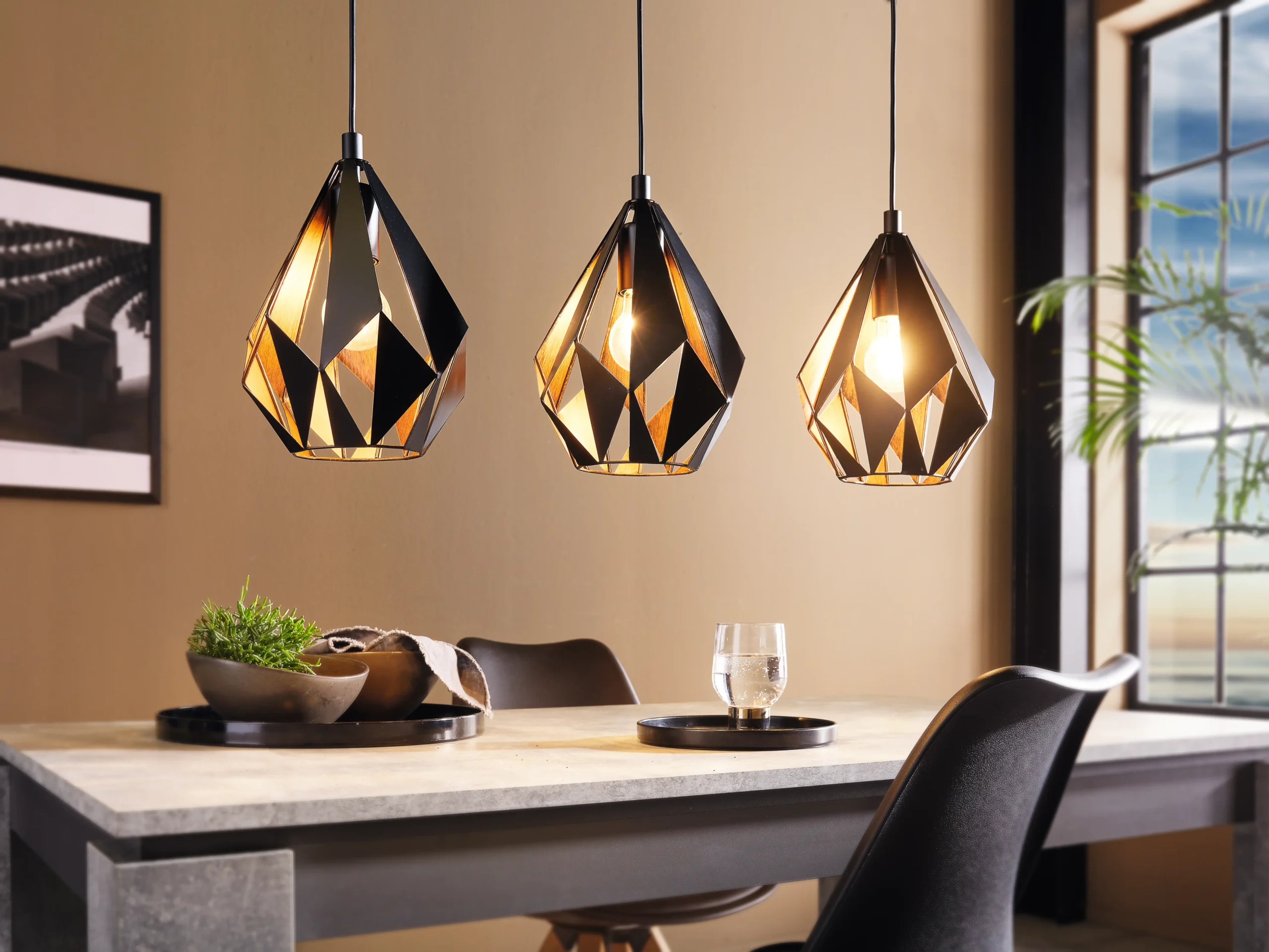 Striking Geometric Cluster: Consists of three diamond‐shaped steel shades in matte black with warm copper‐tone interiors—creates captivating light-and-shadow patterns ideal for kitchen islands, dining tables, or entry hallways.