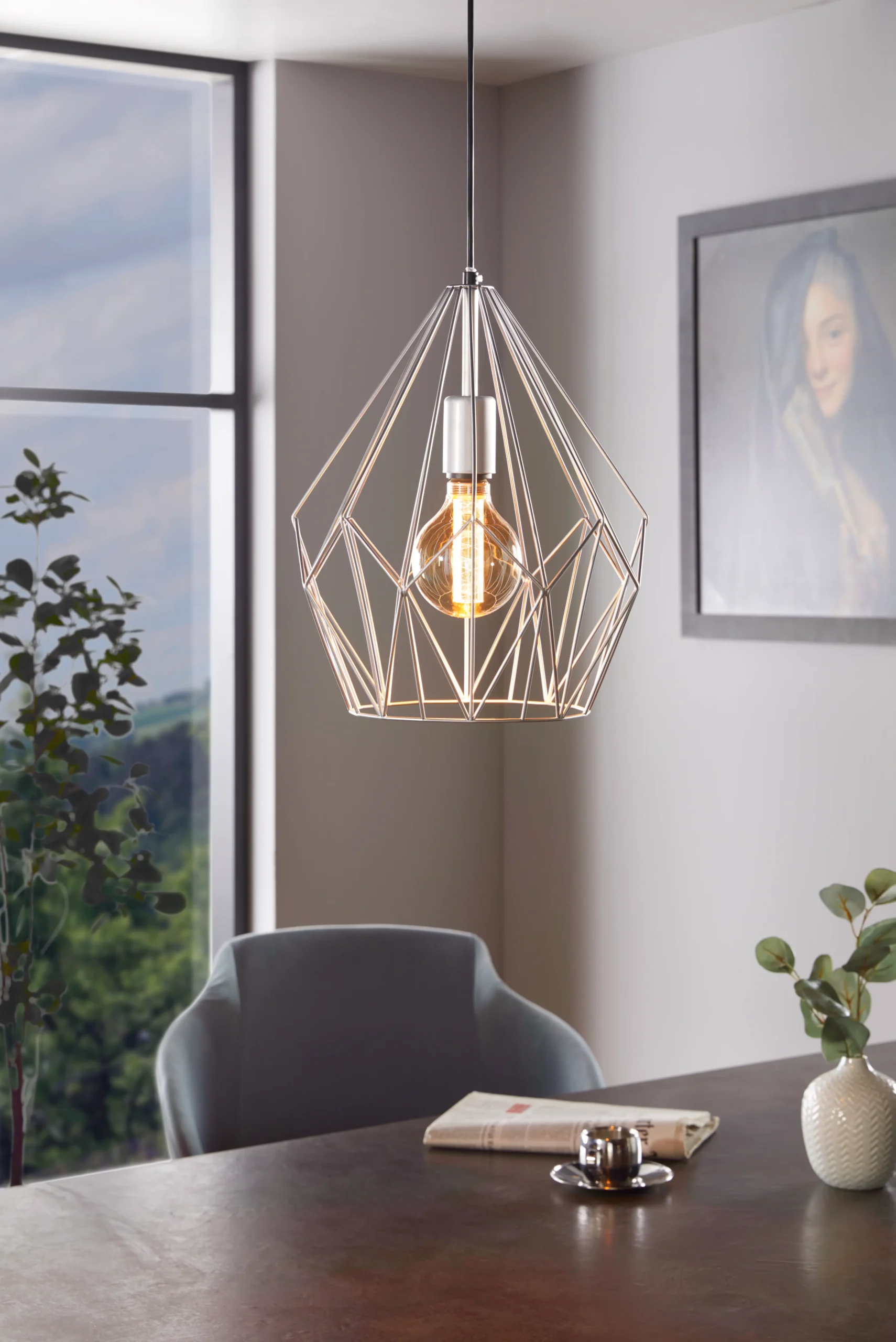 Geometric Silver-Cage Design: The diamond-shaped silver steel wire cage offers an eye-catching industrial-industrial focal point, casting bold light-and-shadow effects—perfect for kitchens, dining areas, hallways, or modern living rooms.