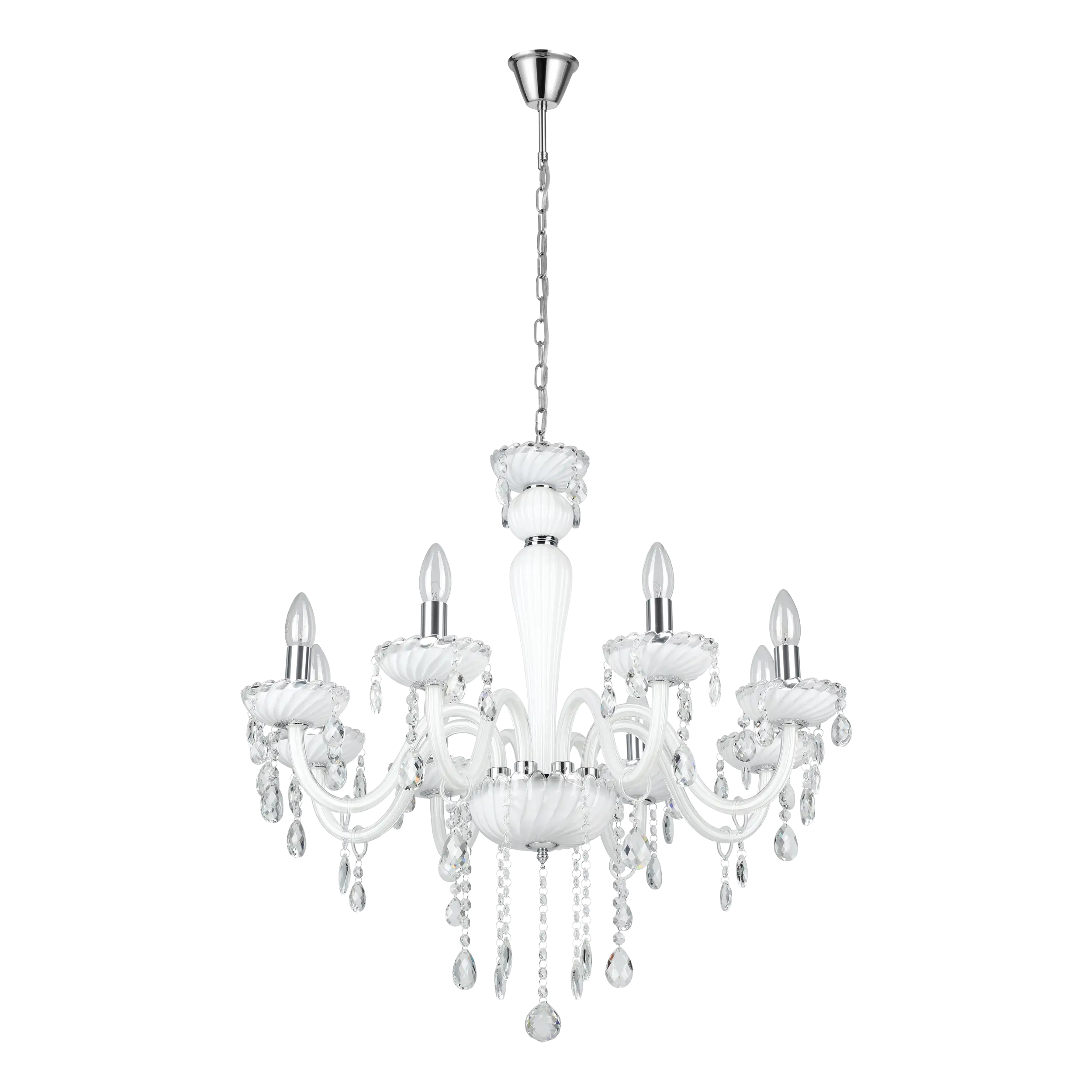 Sophisticated Classic Design: Elegant 8‑arm chandelier featuring chrome-plated steel structure, white glass shades, and crystal accents—perfect focal piece for living rooms, dining rooms, entryways, or bedroom ceilings.