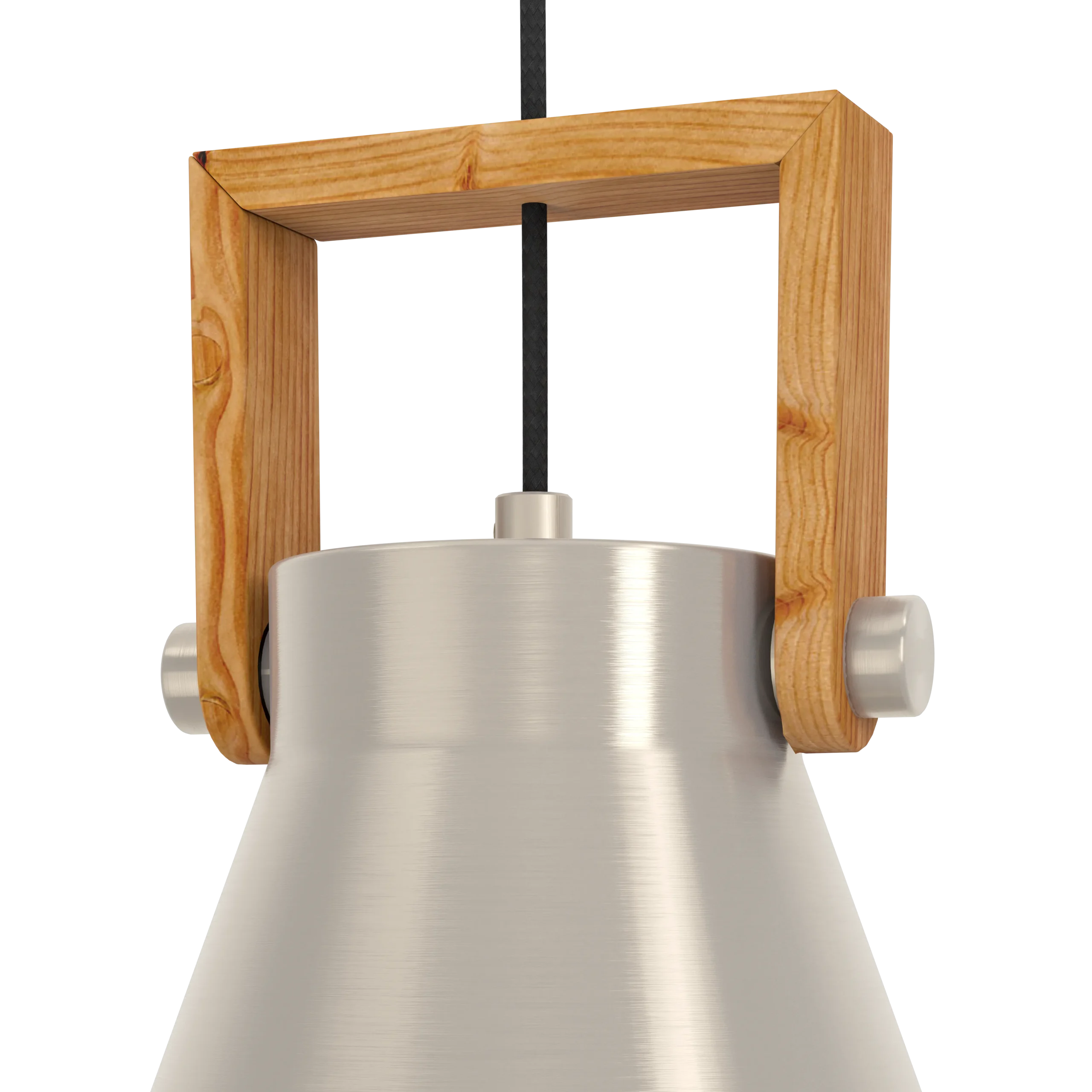 Industrial Vintage Design: The EGLO CAWTON Pendant Light features a steel-colored conical shade paired with rustic brown wooden accents, offering a blend of industrial and vintage aesthetics suitable for various interiors.