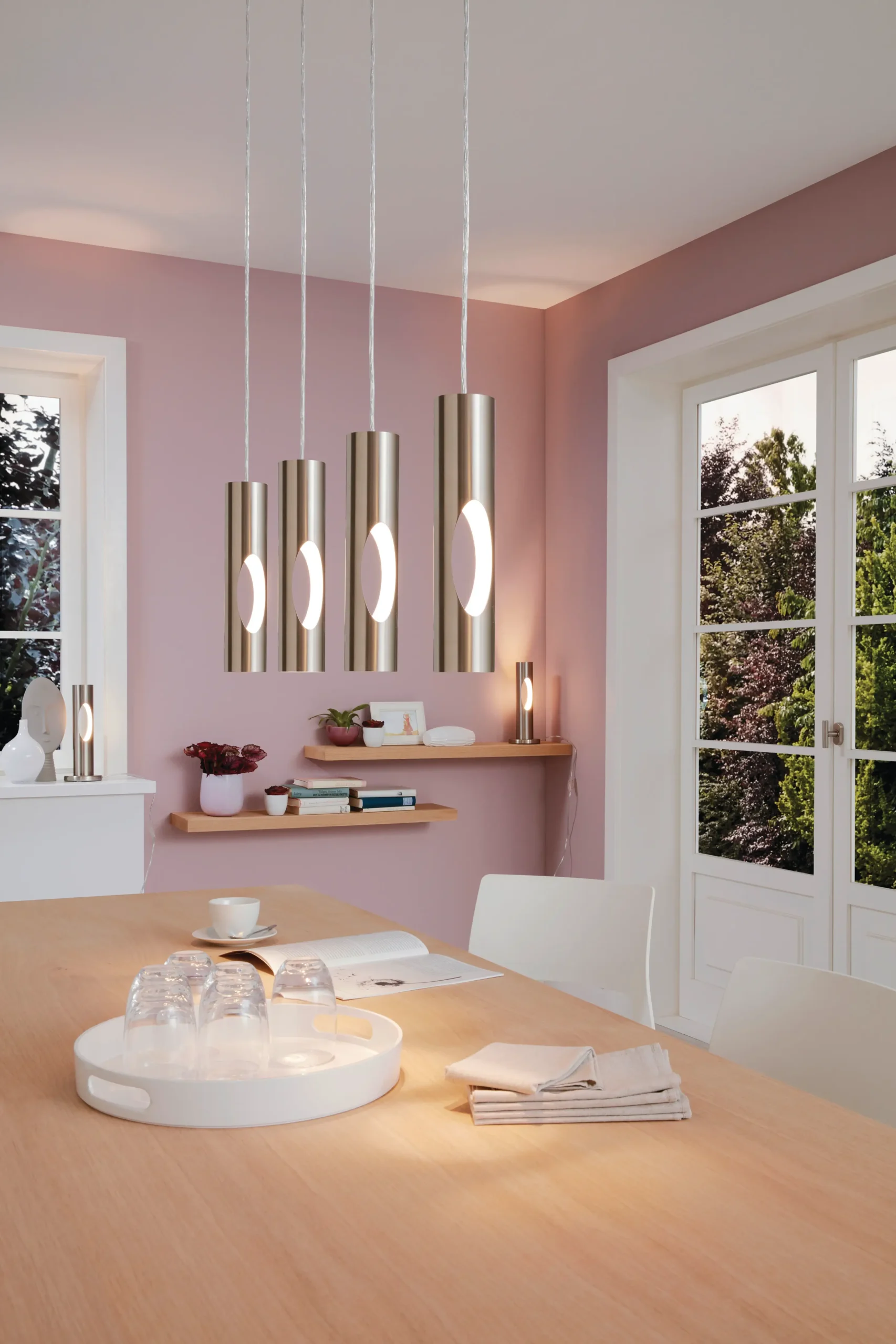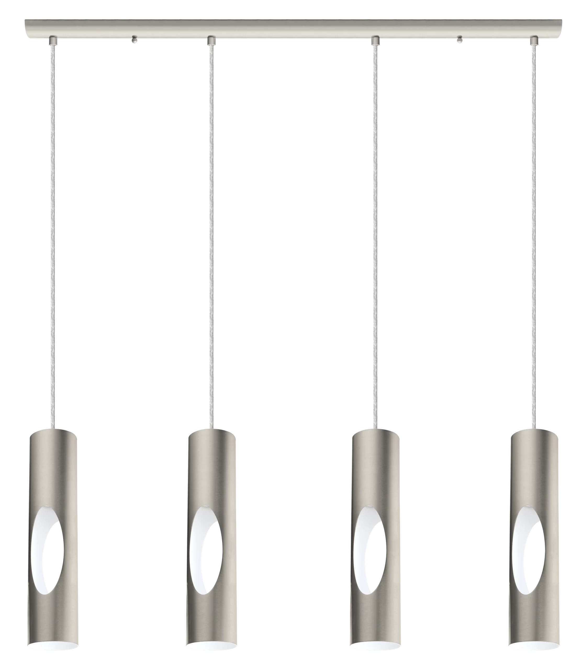 Elegant Linear Design – Four cylindrical satin-nickel pendants suspended from a sleek 84cm bar, ideal over kitchen islands or dining tables.