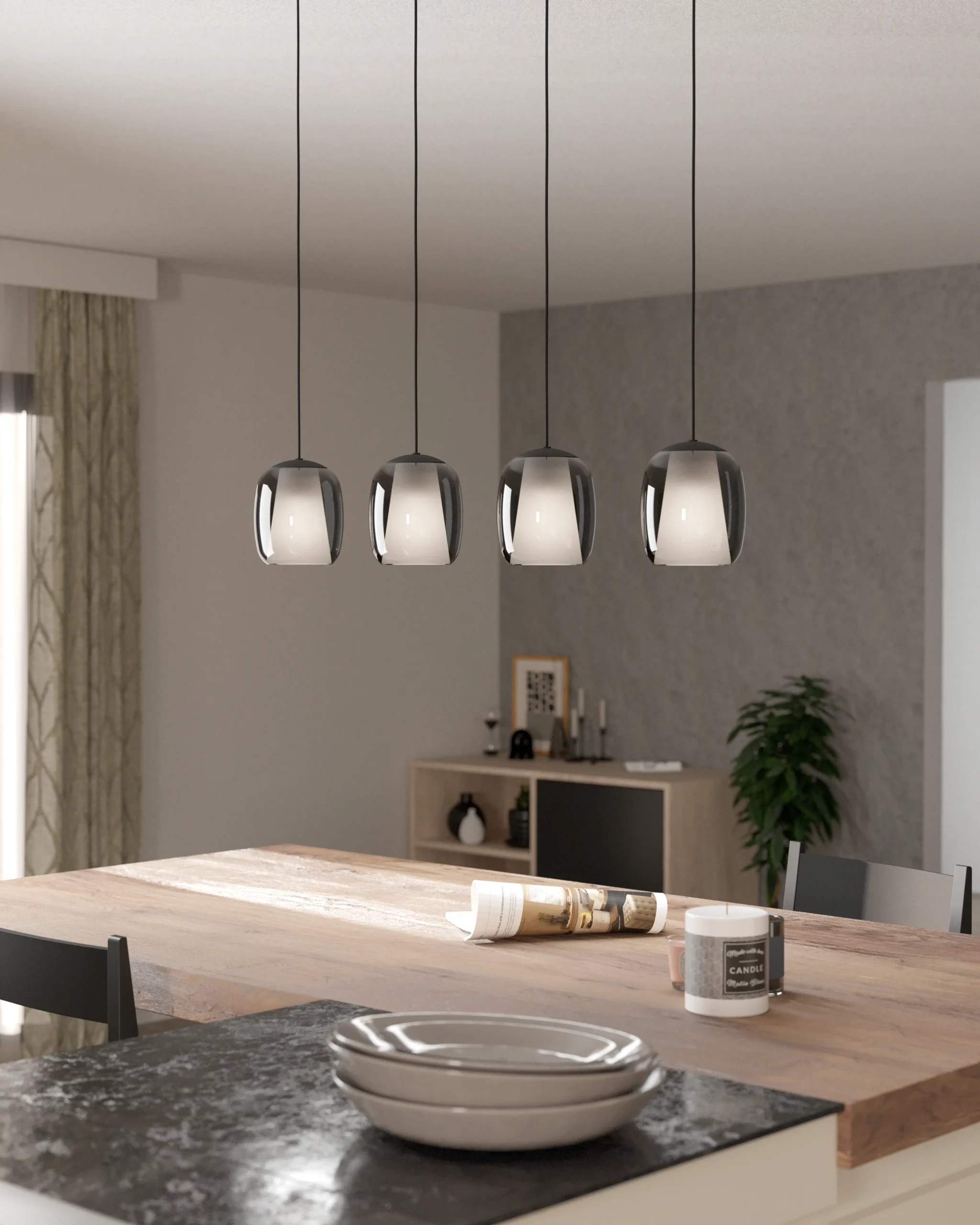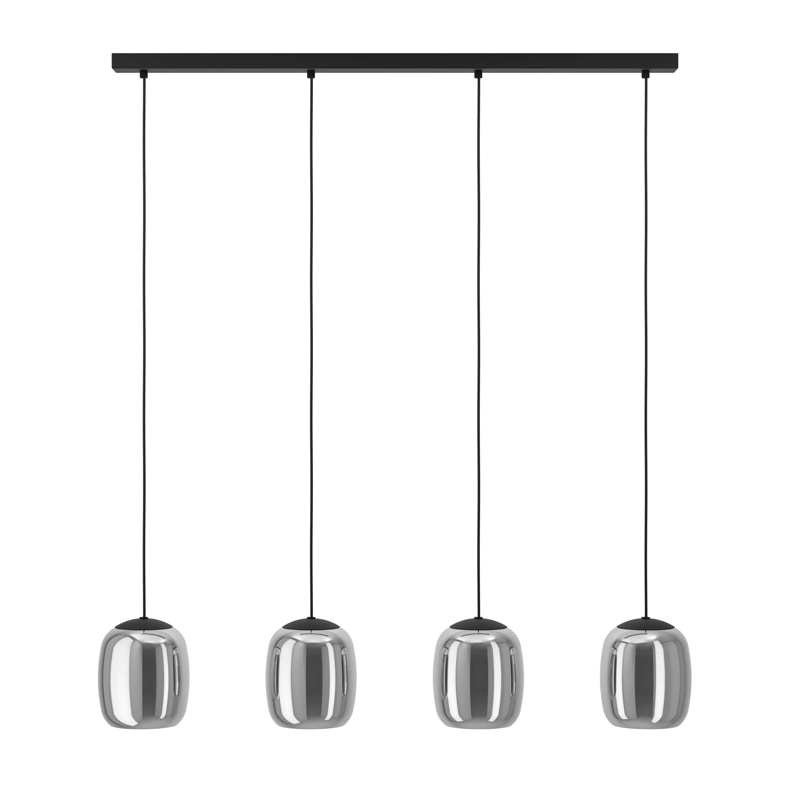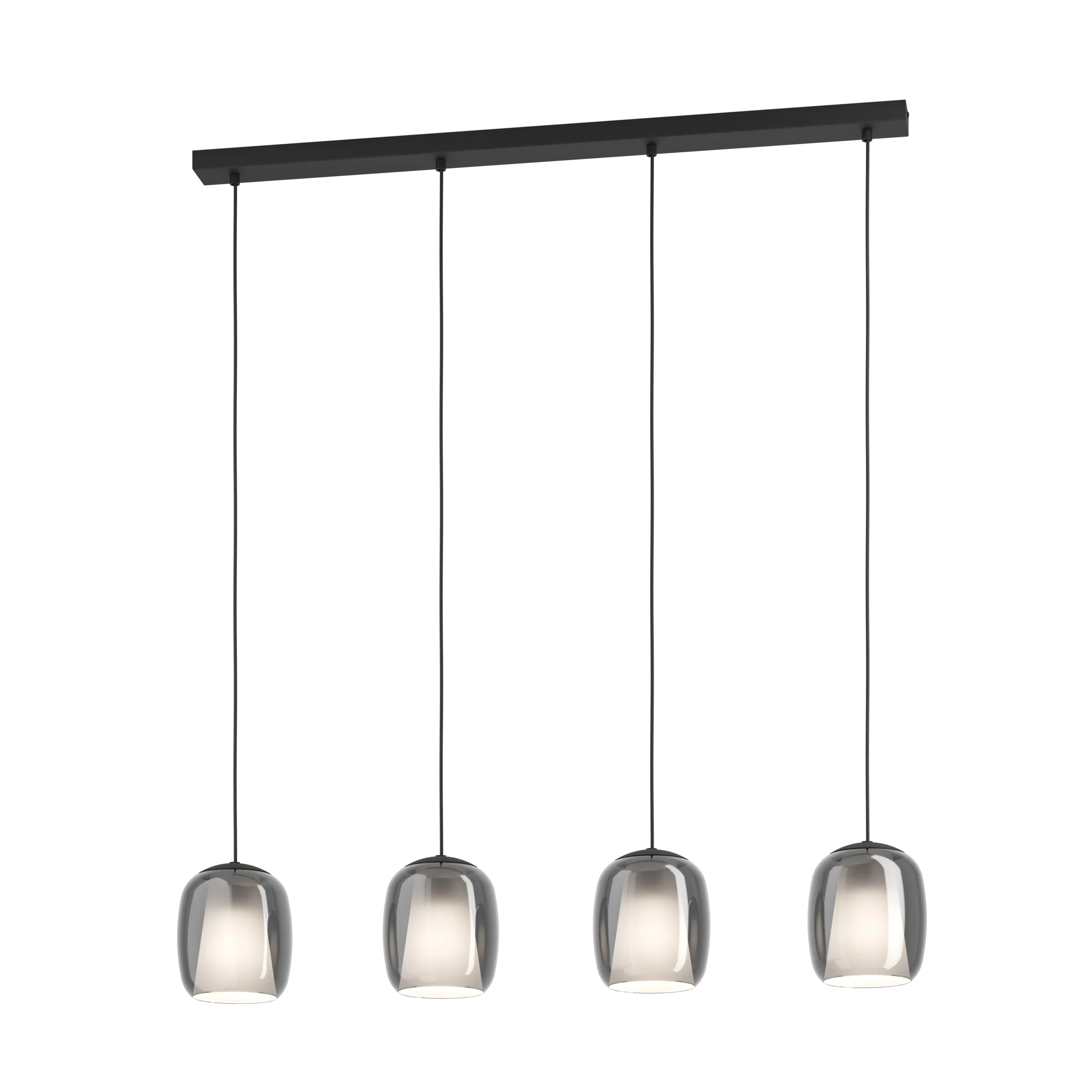 Modern industrial design – Sleek black steel bar frame with four elegant grey‑vaporized glass shades for a stylish loft‑style or contemporary home aesthetic.