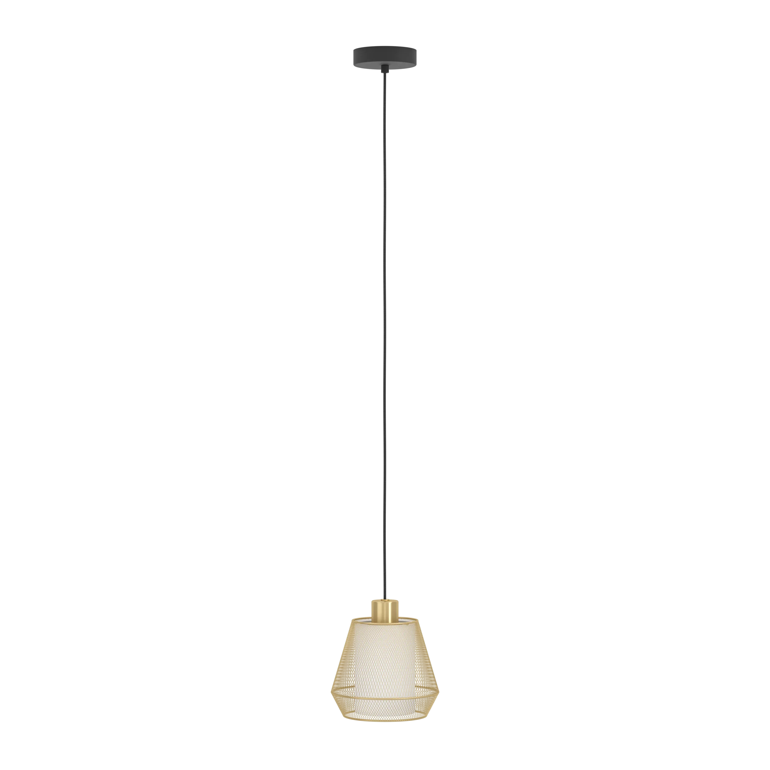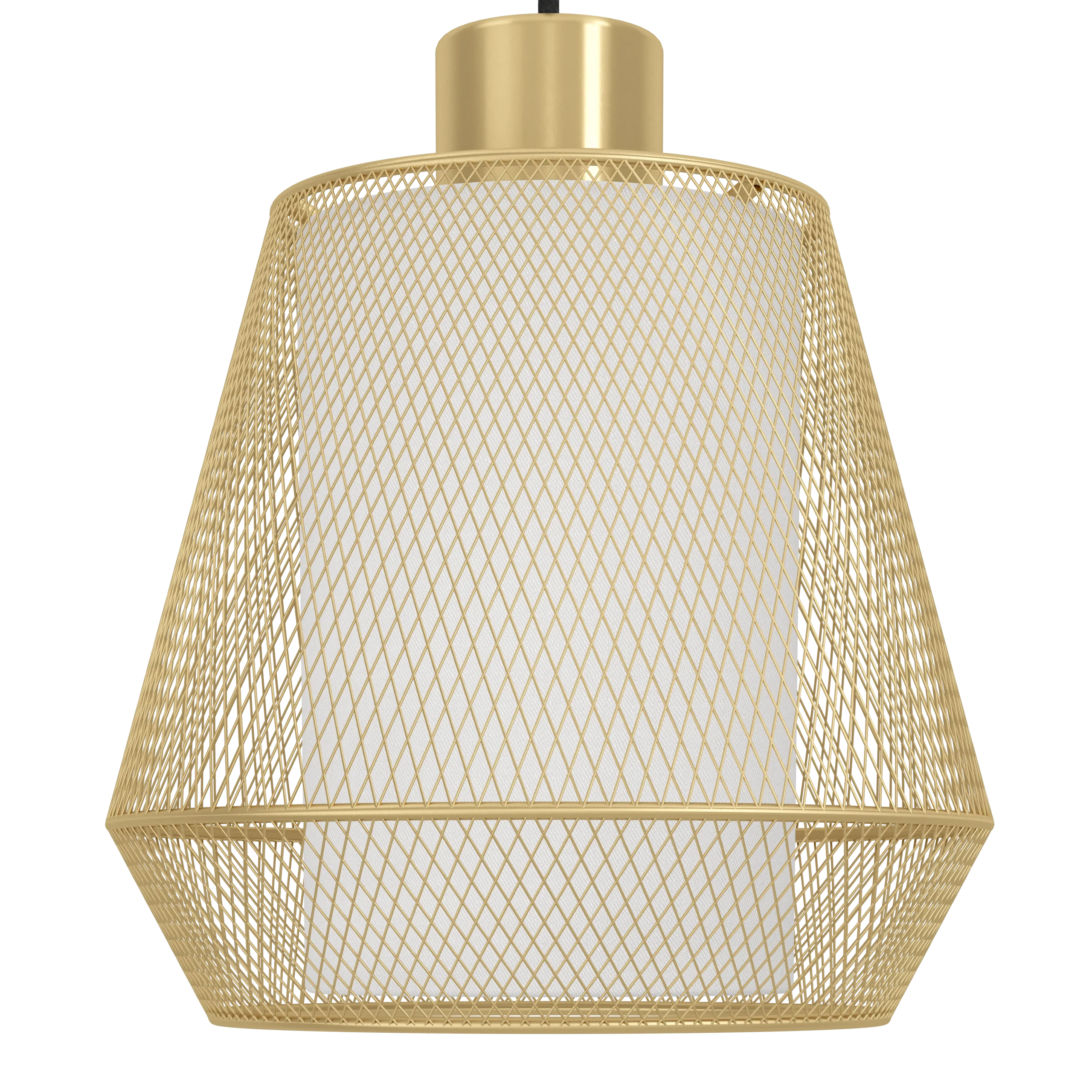 Striking Diamond Wireframe Shade: A black steel canopy suspends a brushed‑brass, diamond‑shaped wireframe encasing a crisp white fabric cylinder—crafting a captivating interplay of light and shadow when illuminated.