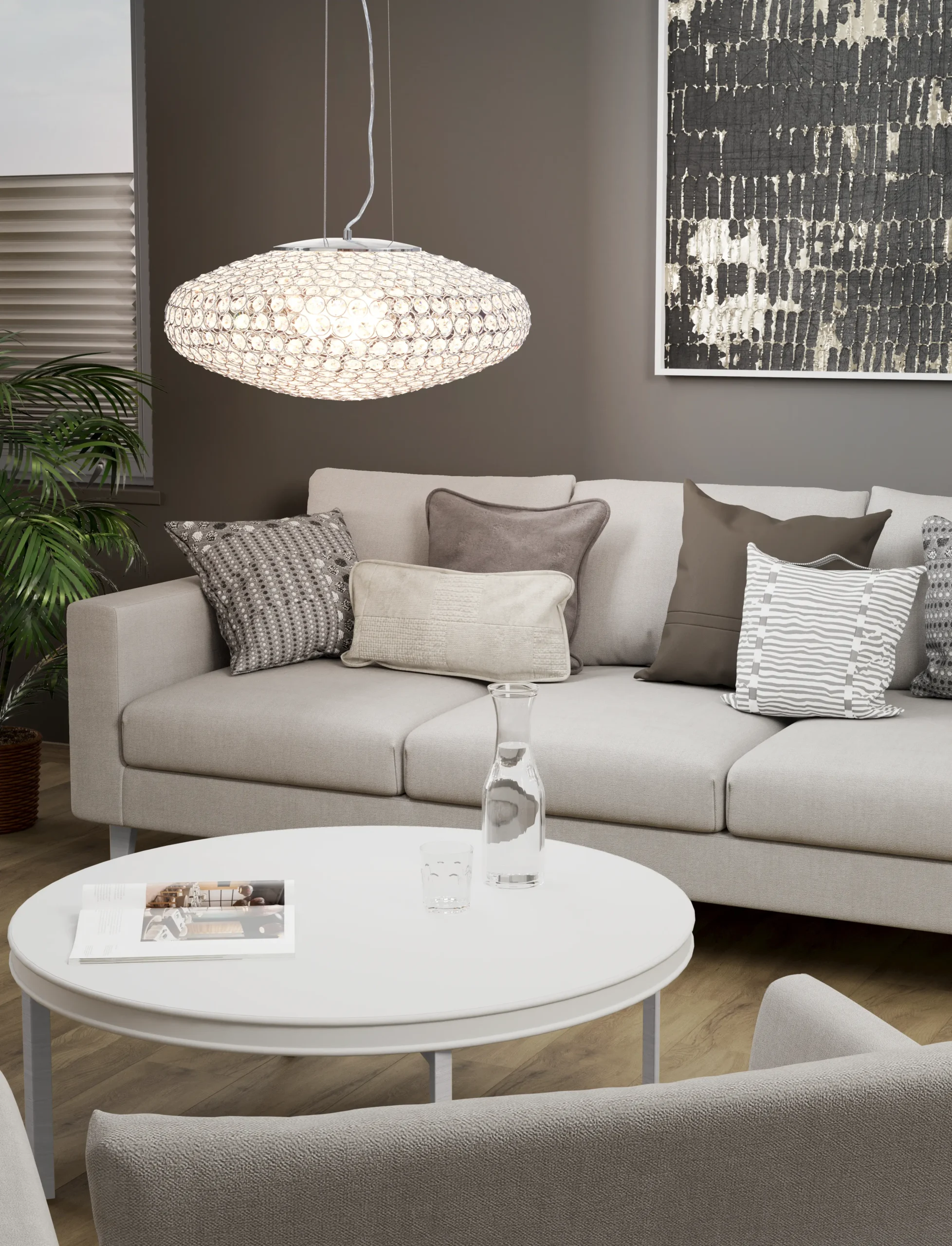 Sparkling Crystal Design: Chrome-colored steel frame with an elegant oval shade crafted from rows of clear, crystal-inspired glass for a luxurious ambient glow.