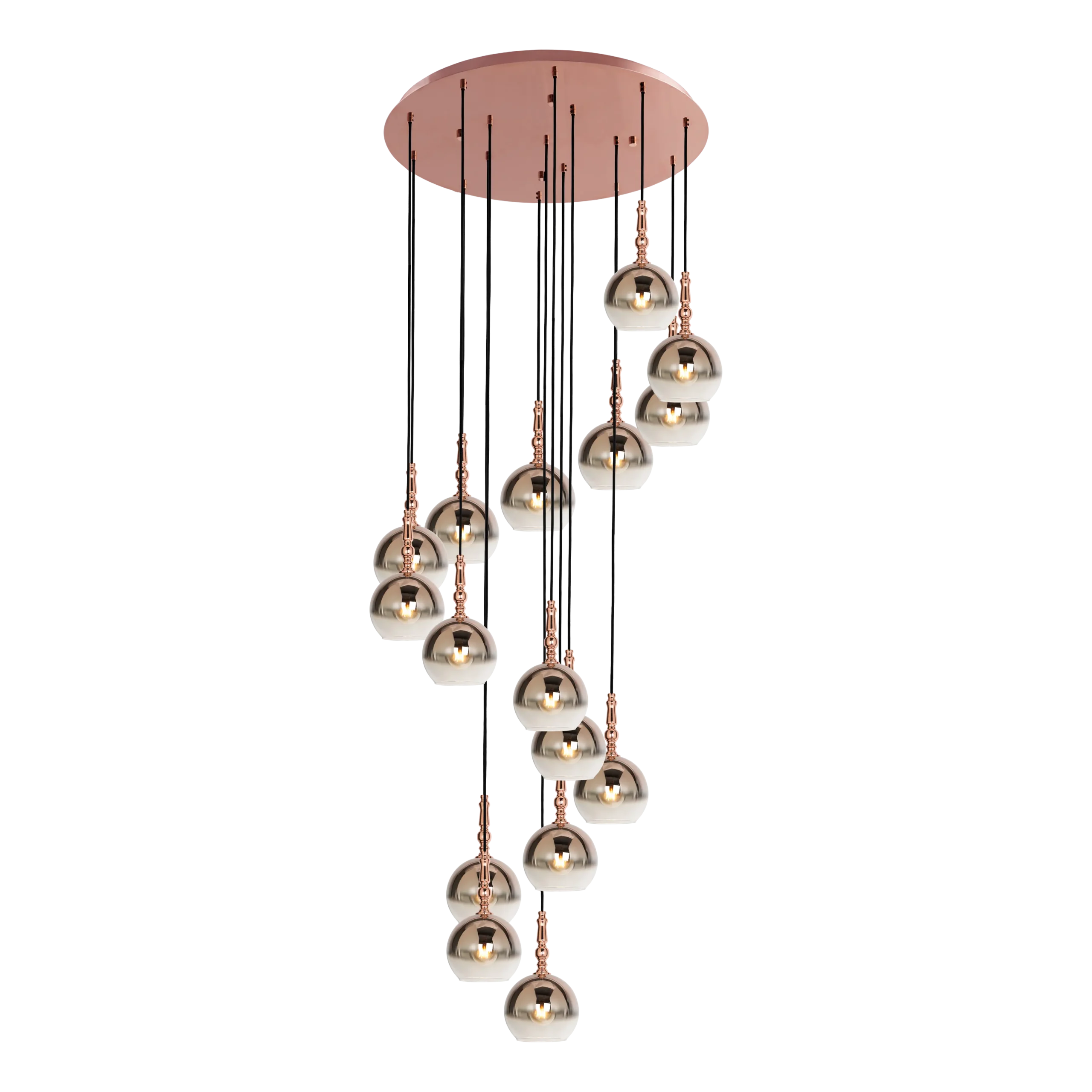 A copper-colored indoor pendant light with a steel enclosure and glass shade. It features a black textile cable and no switch. The lamp uses a 40W AGL illuminant with an E27 socket. It weighs 16.32 kg, operates at 220-240V, and has IP20 protection class 1.