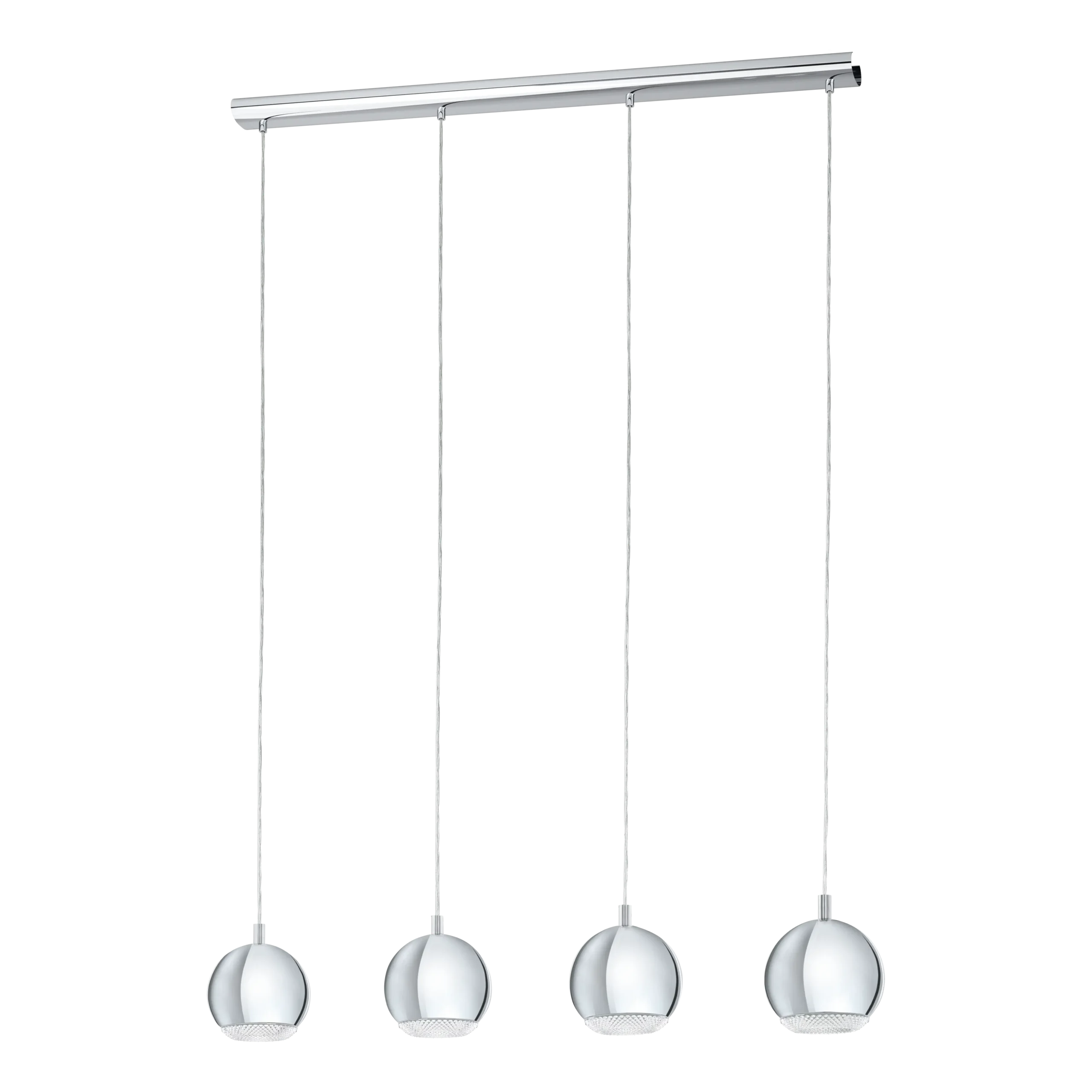 Elegant crystal-inspired design – Features four spherical chrome-plated steel shades with clear plastic crystal-effect detailing that cast a sparkling glow, adding sophistication to living rooms or over dining tables.