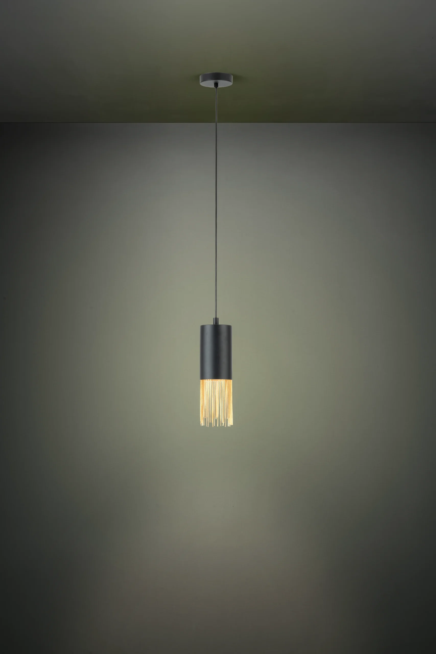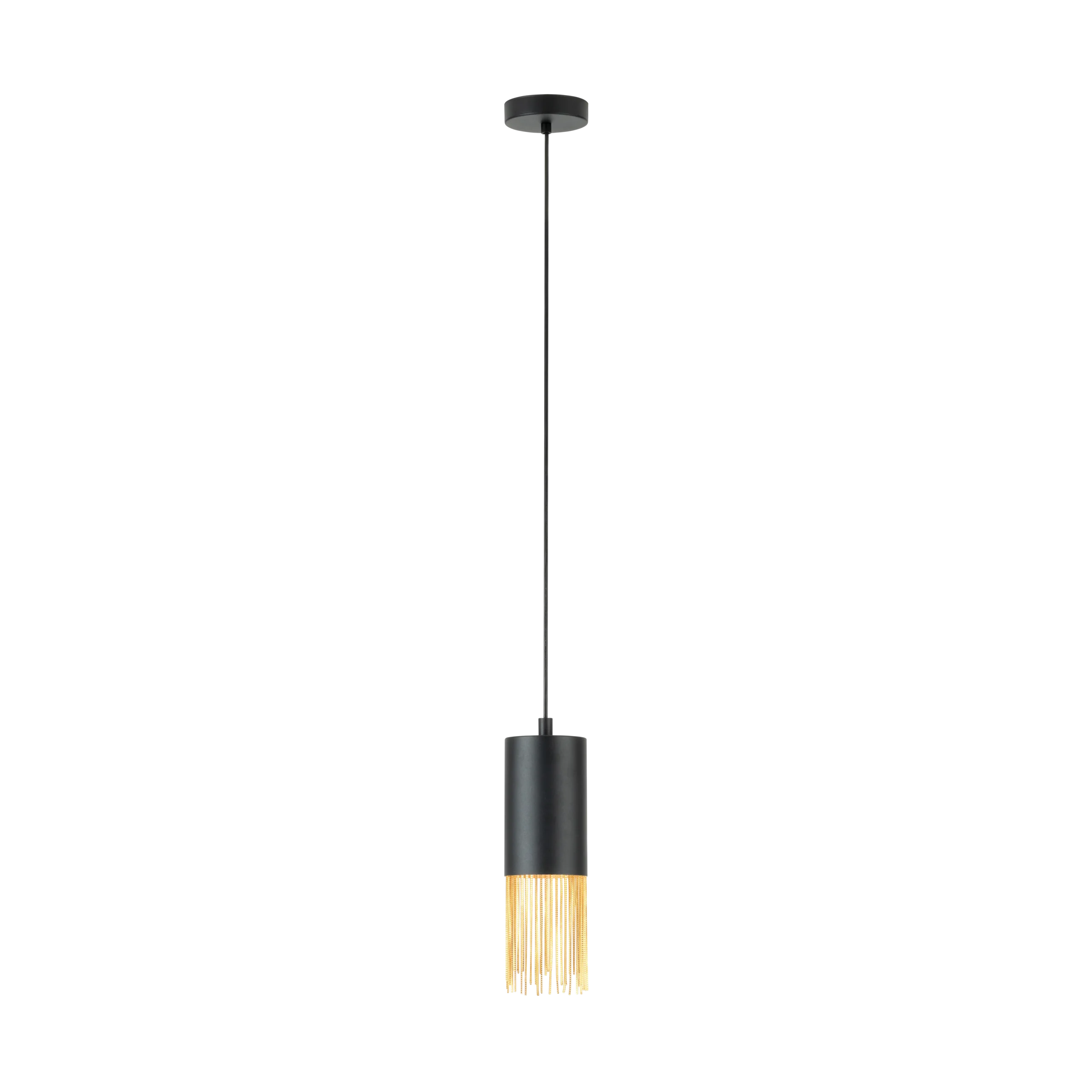 Modern boutique pendant – Sleek cylindrical steel fixture in black with brass accent detail, compact and urban-chic