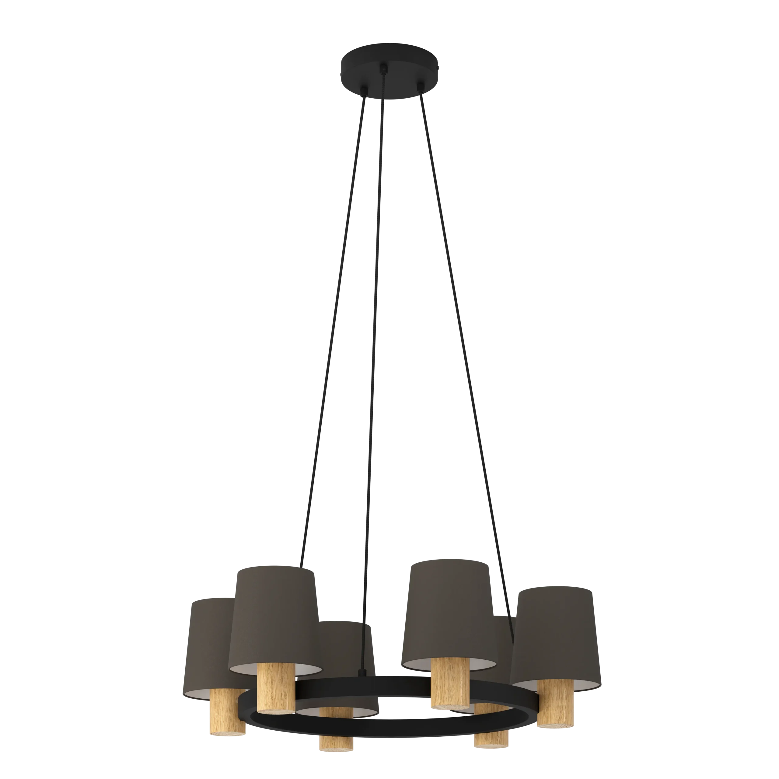 Design & Materials: A vintage-inspired pendant featuring a black steel oval frame accented with natural oak lamp holders and six cappuccino-fabric shades—blending metal, wood, and textile for a warm, modern farmhouse look.
