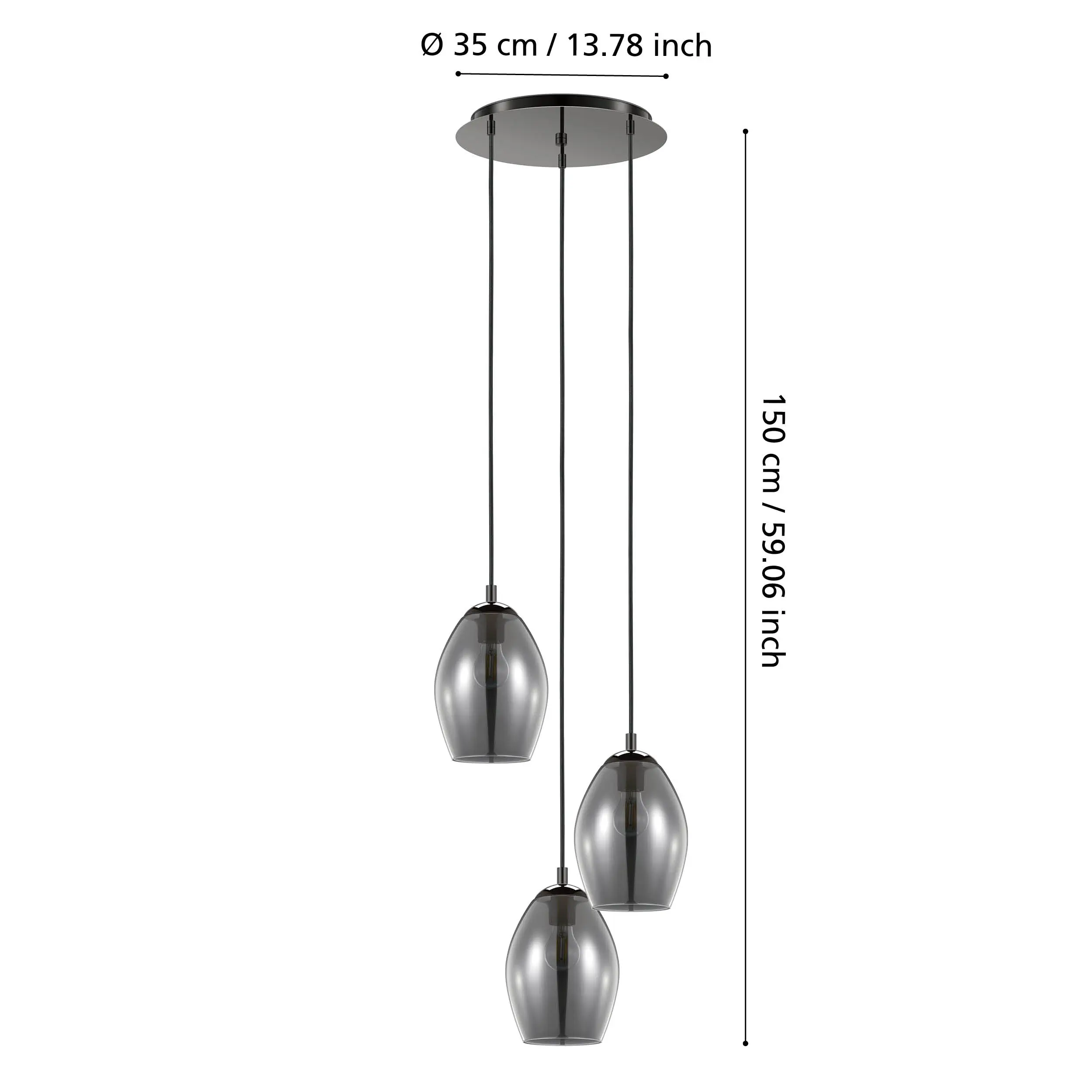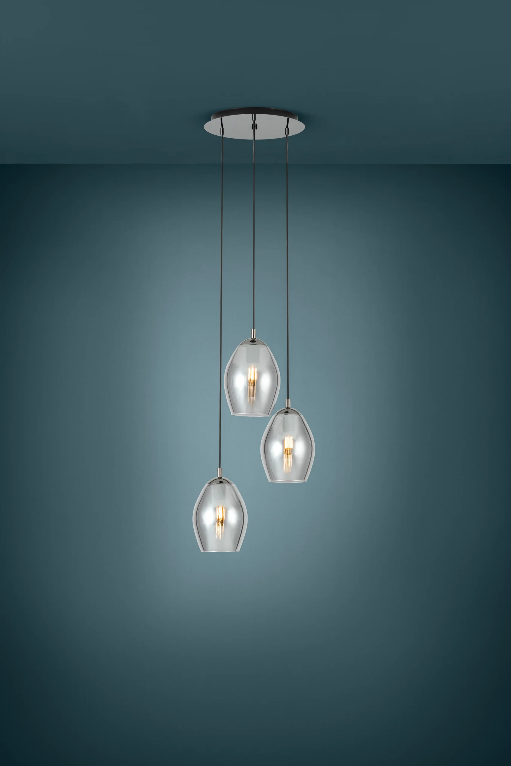 Stylish Smoked Glass Shades: Features three smoked, vaporized glass shades paired with a sleek nickel‑nero steel frame—perfect for contemporary living spaces and dining areas .