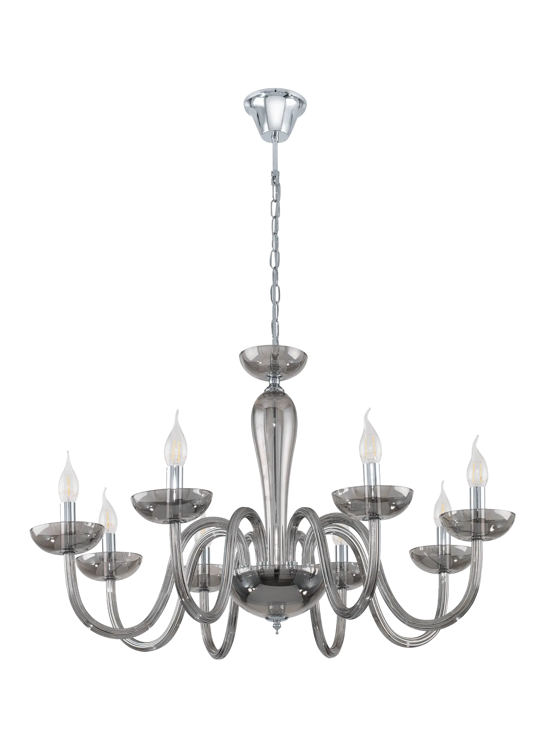 FALCADO 8‑Lamp Pendant Chandelier – Chrome Steel Frame with Black Transparent Glass – E14 Base, 40W – 79cm Dia × 110cm H – Elegant Indoor Ceiling Fixture