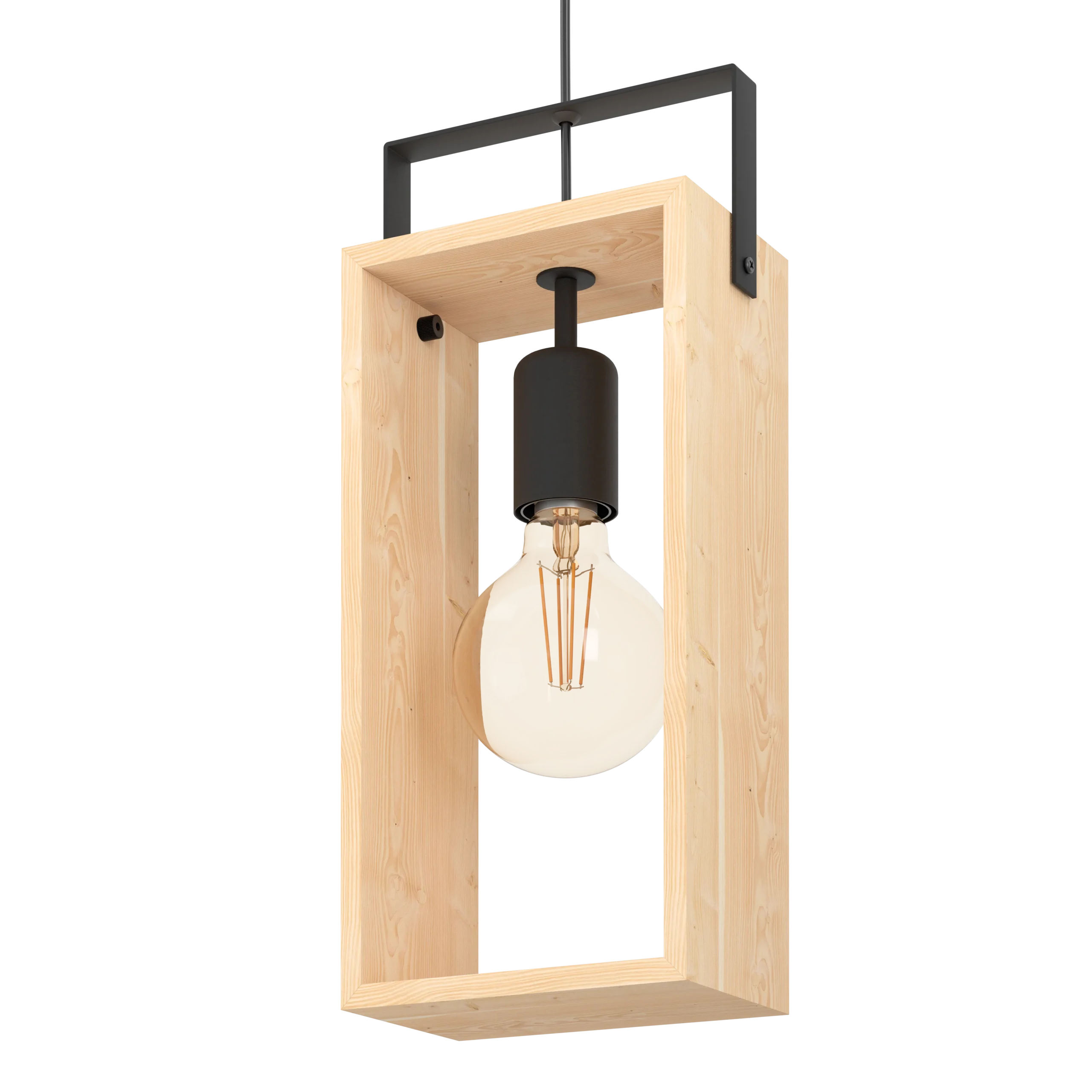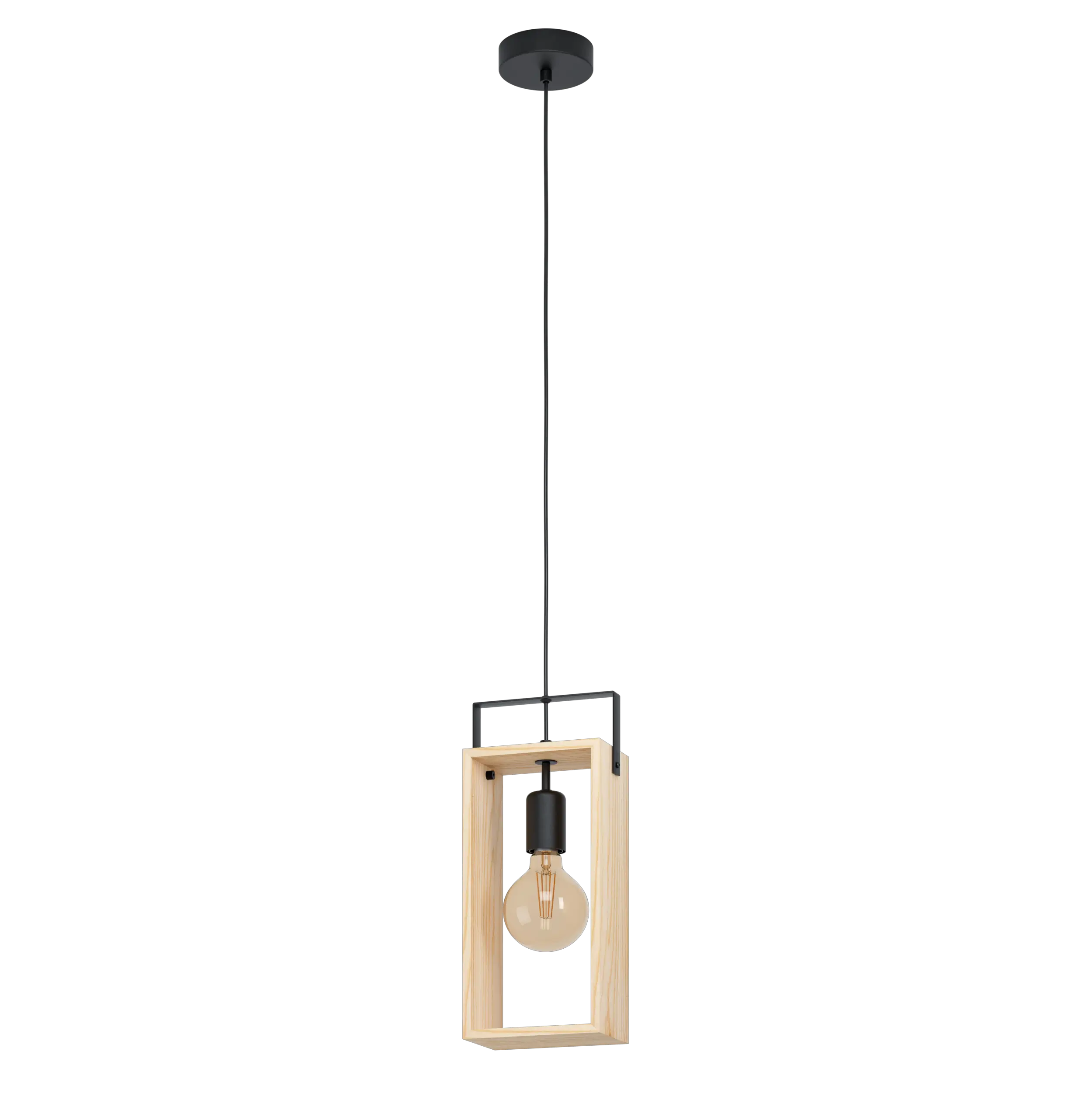 FAMBOROUGH 1‑Lamp Pendant – Black Steel & Natural Wood Rectangular Frame, 16×10.5cm, 110cm Hanging Cable – E27 Socket, 40W Max – Vintage‑Scandi Accent Pendant