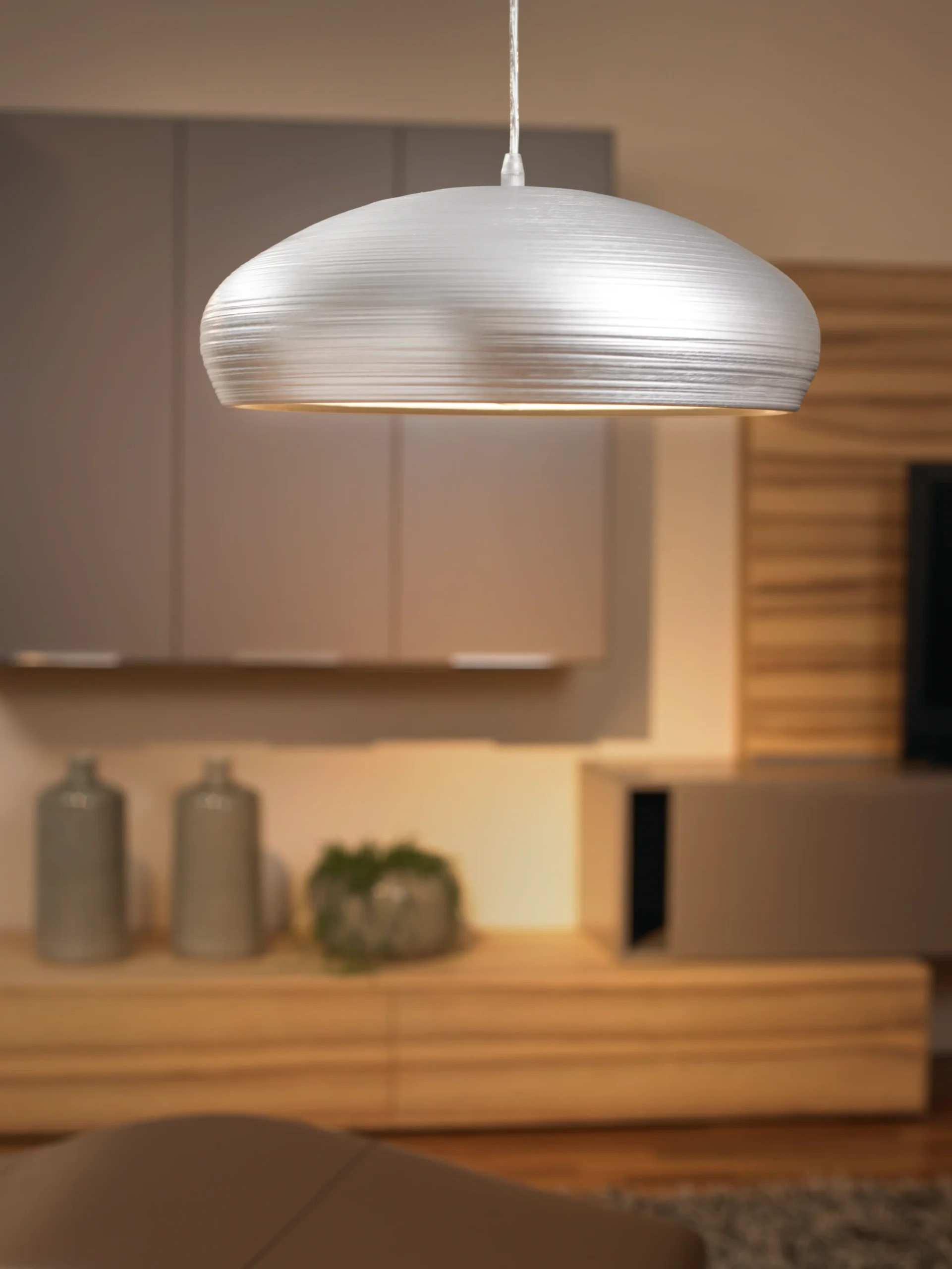 Stylish Minimalist Design: Features a sleek, brushed‑aluminium metal shade with a modern disc shape—adds refined industrial-style elegance to kitchens, dining rooms, or living areas.