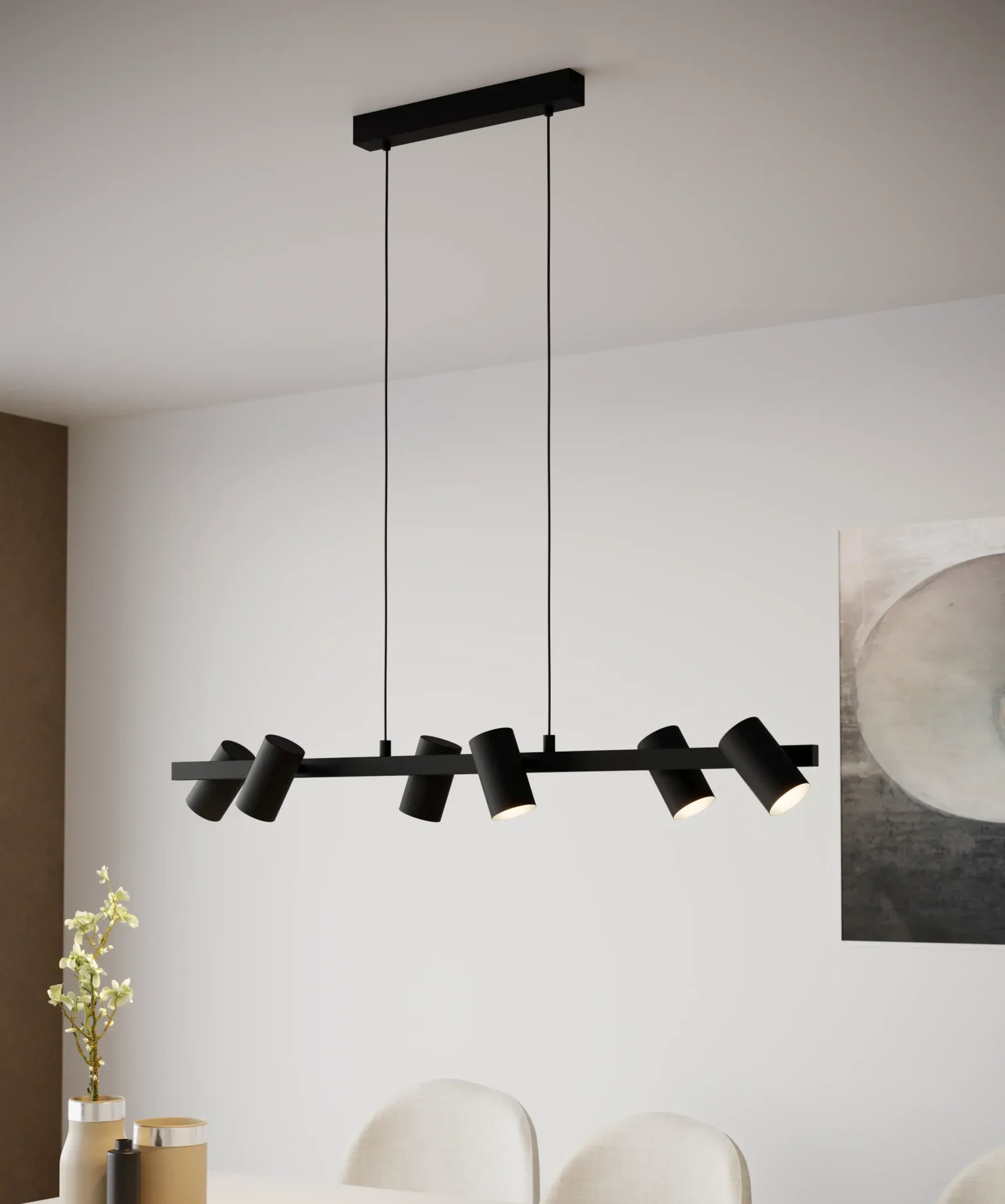 Modern adjustable spotLamp design– Features six individual cylinder shades on a sleek black steel bar. Each head can be rotated and angled to highLamp specific areas, perfect for kitchen islands or dining tables.