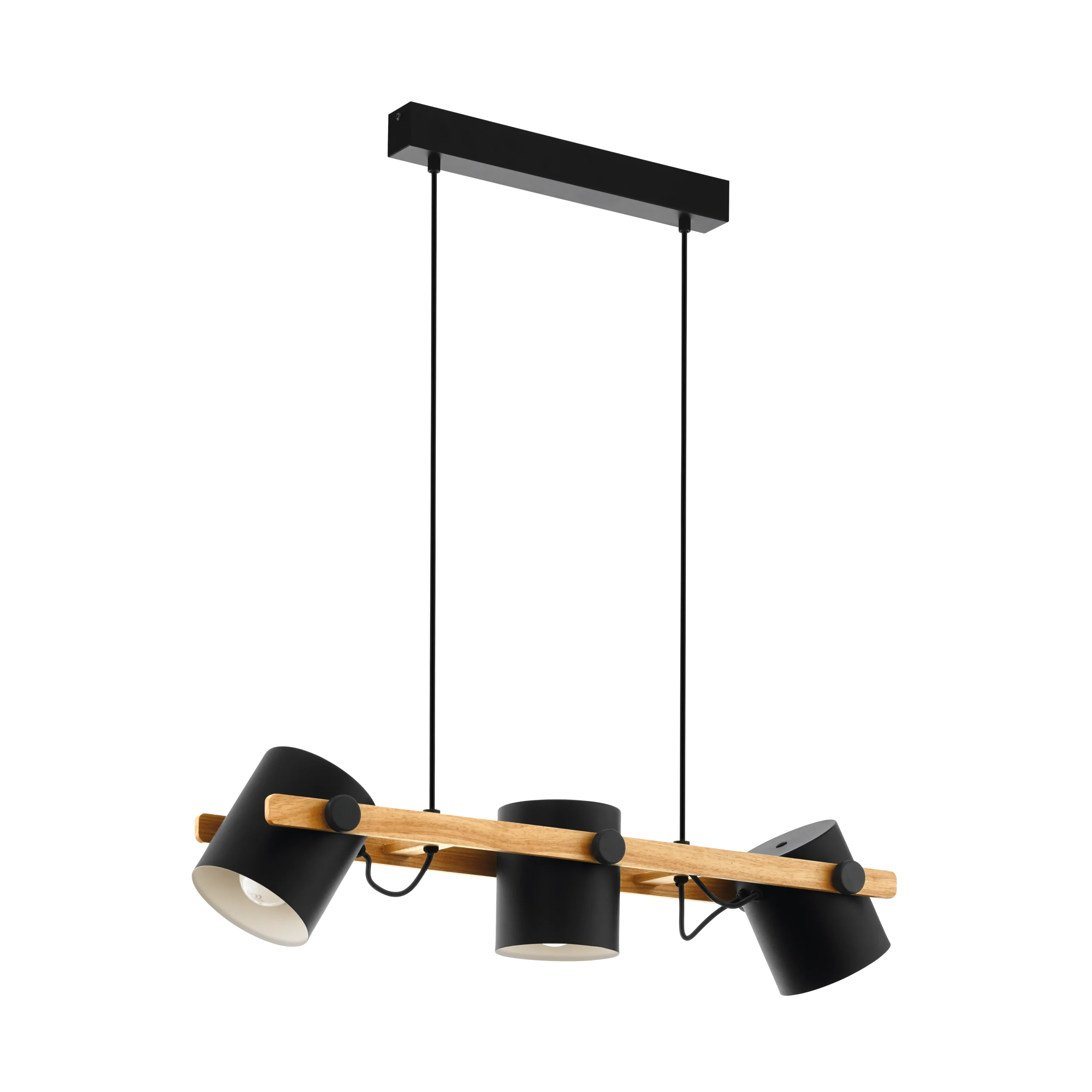 Vintage-Modern Linear Design: Features three matte-black cylindrical steel shades with cream-colored interiors and warm wood accents, creating a sleek yet cozy aesthetic—perfect for kitchens, dining spaces, or offices.