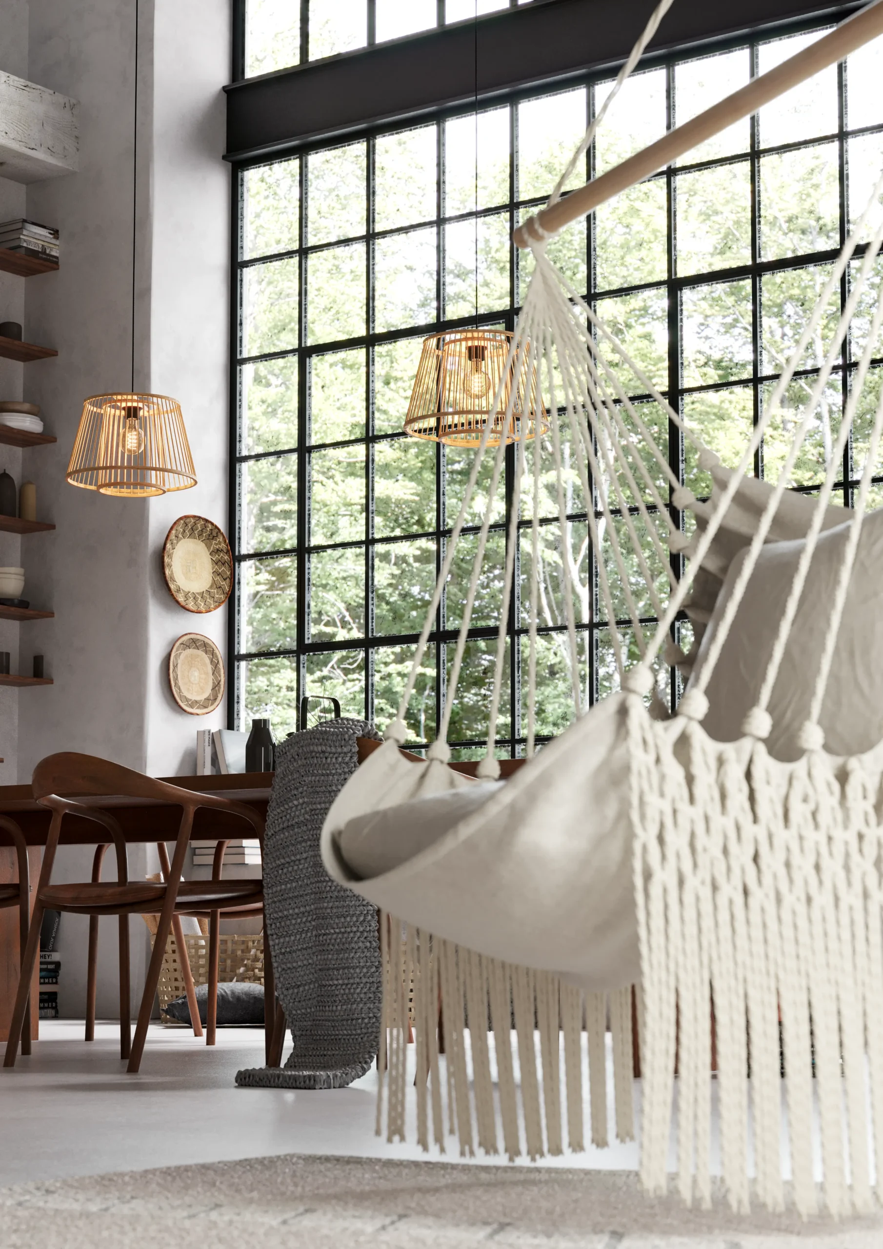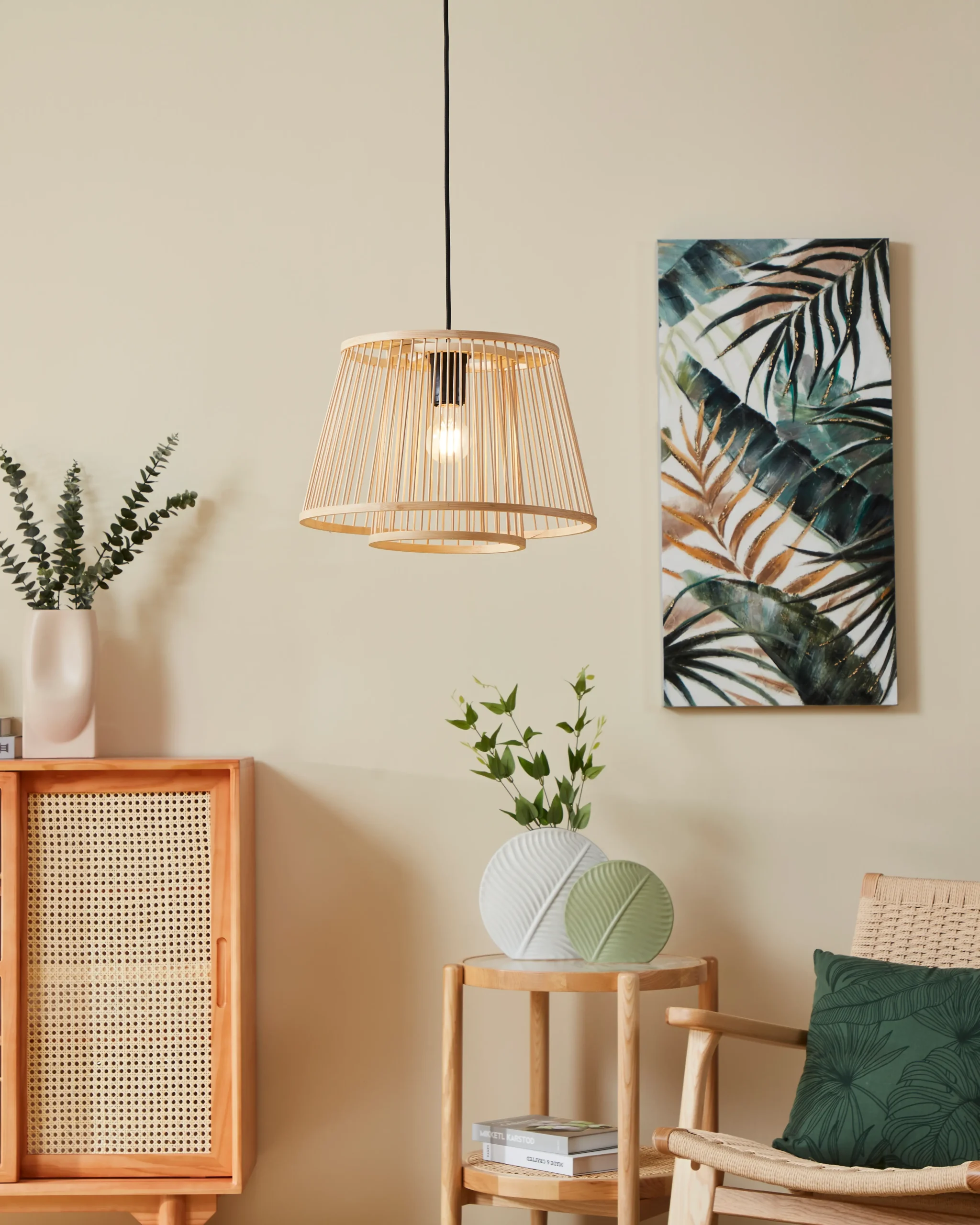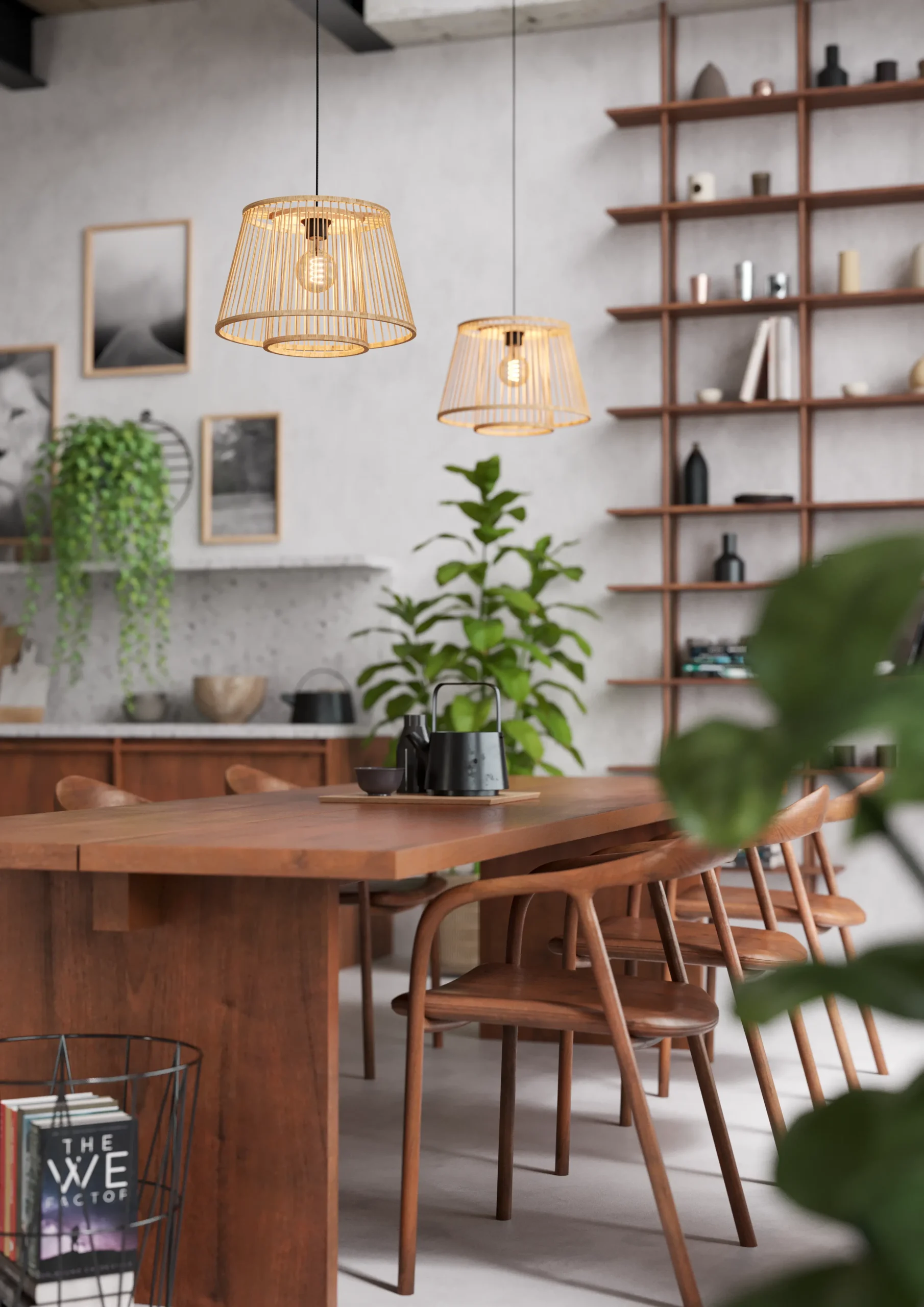 Boho-Natural Aesthetic: Features two nested bamboo lampshades suspended from a matte-black steel canopy; when lit, it casts captivating light-and-shadow patterns—ideal for living rooms or dining areas.