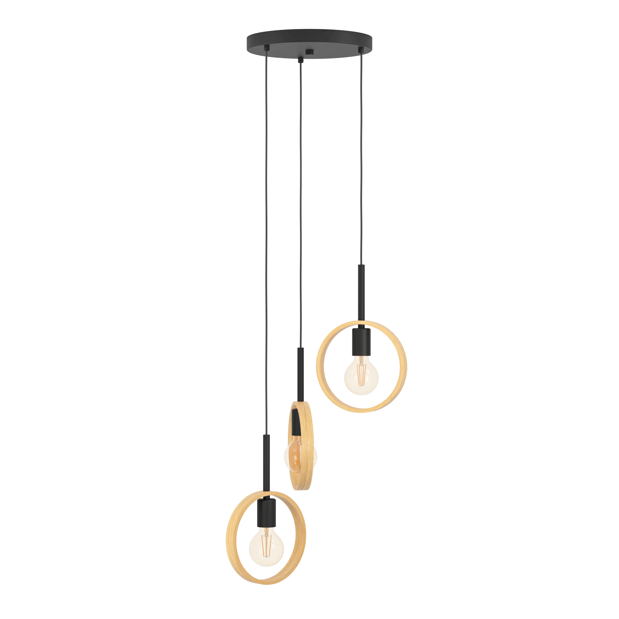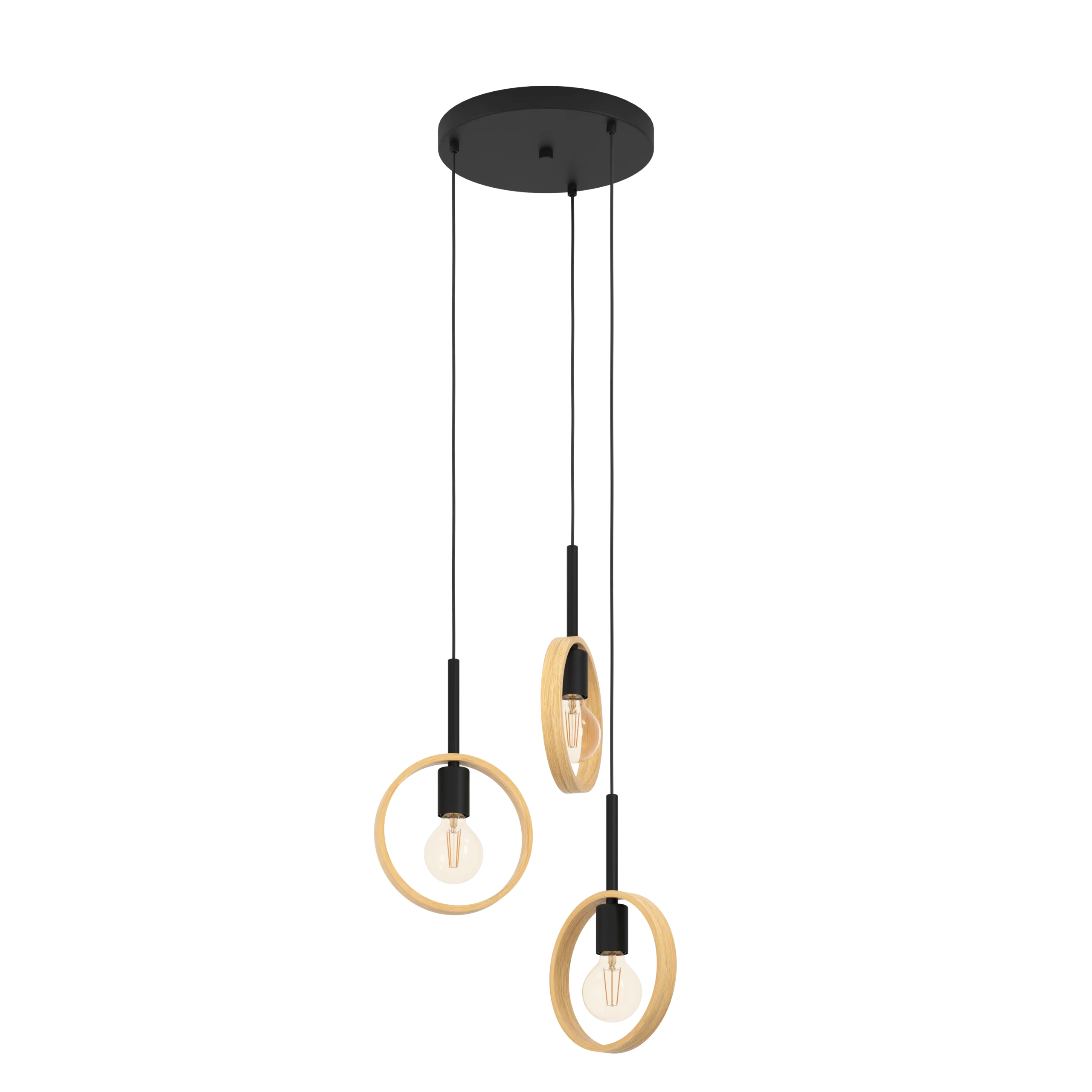 Striking Vintage-Modern Cluster Design: Features three black steel lamp holders surrounded by narrow rubberwood rings of varying heights, offering a rustic-meets-industrial look that makes a bold statement in living rooms, bedrooms, or over dining tables.