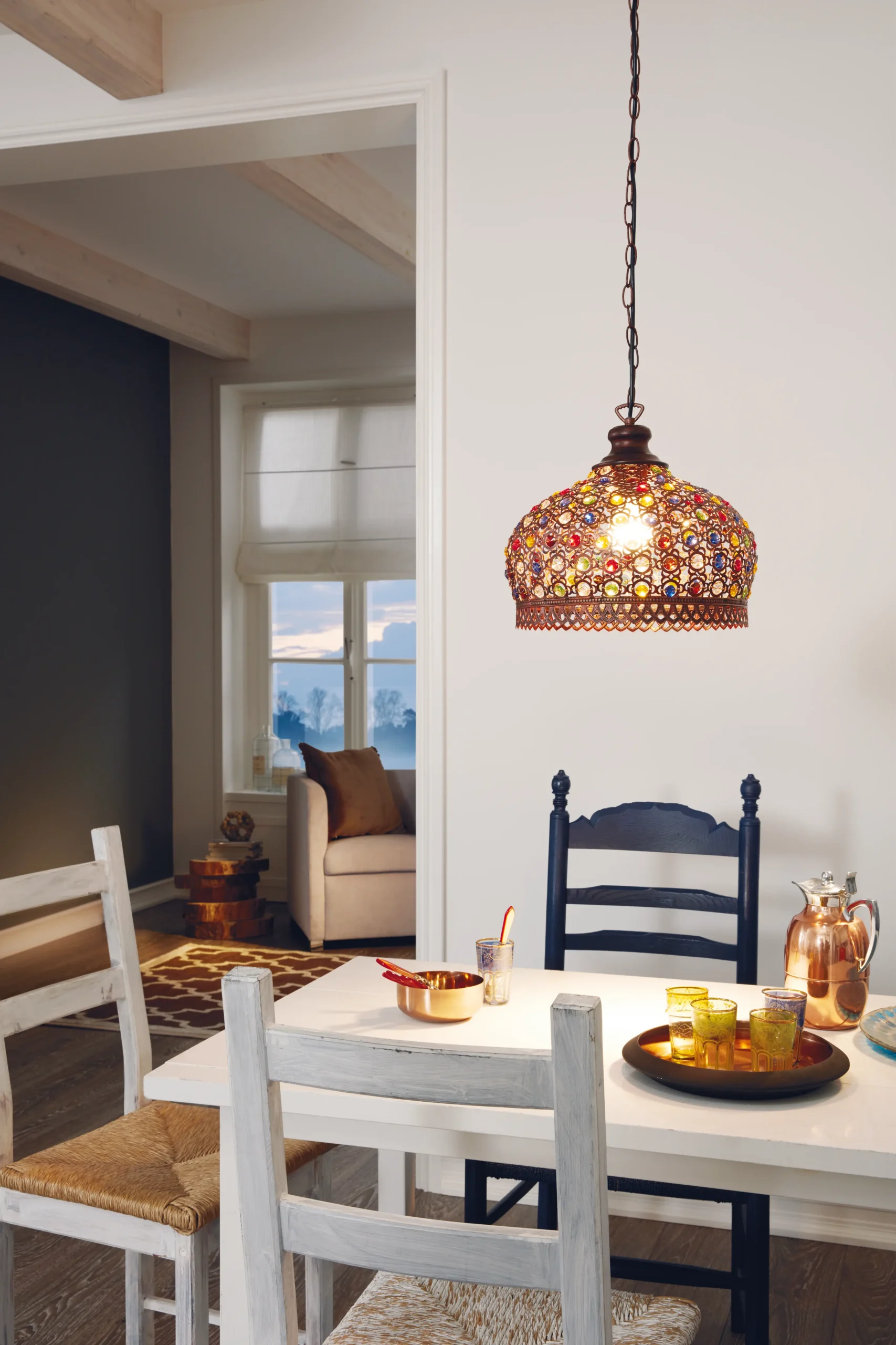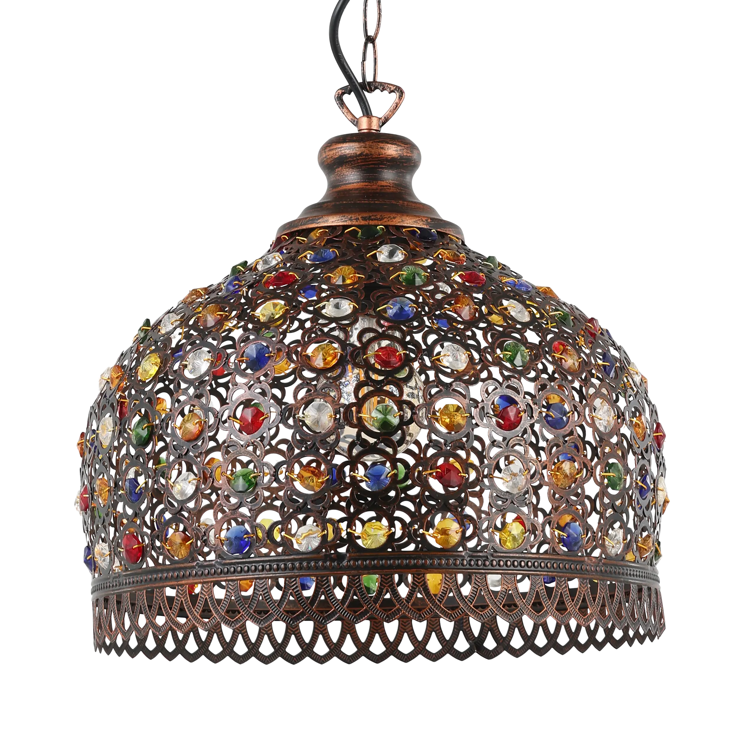 Eclectic Vintage Design: Antique copper-toned steel shade adorned with multicoloured glass beads evokes Boho and Oriental styles—creating stunning Lamp-shadow effects.