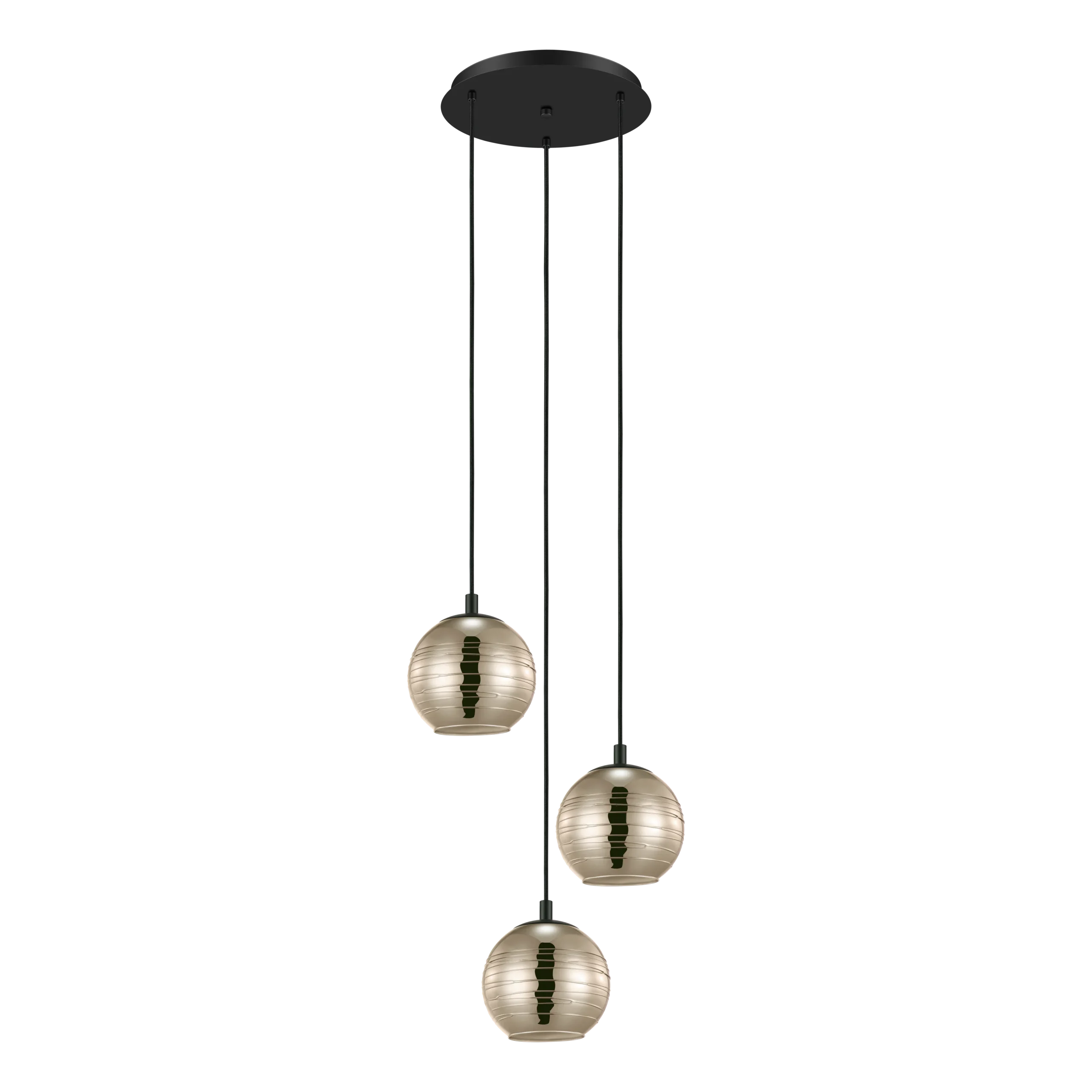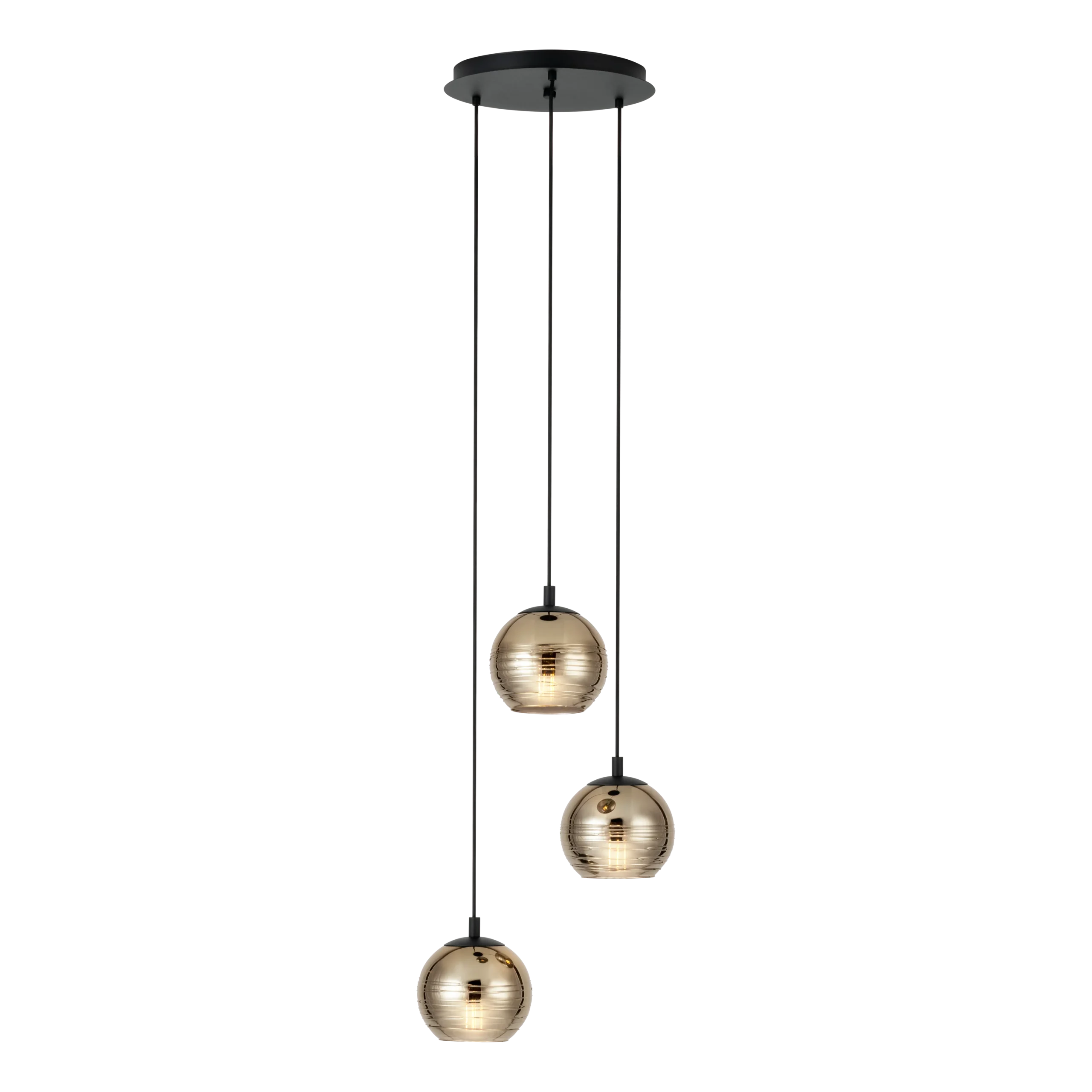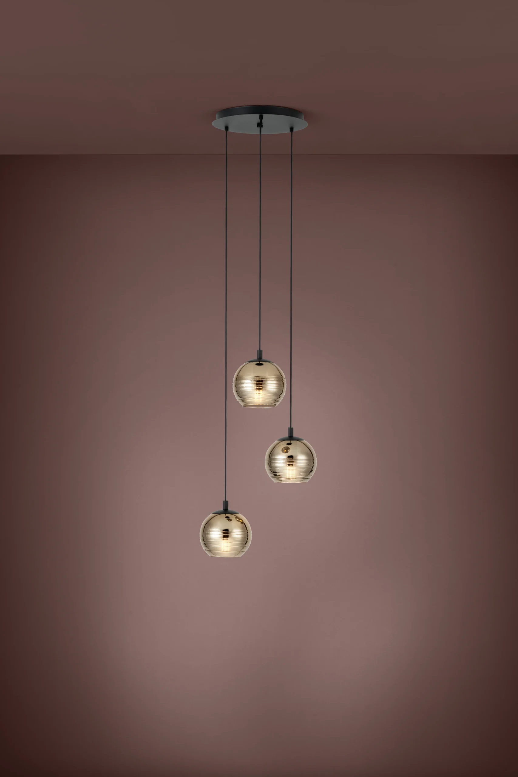 Modern Cascade Design: Features three gold‑tinted, vaporized glass globes hanging at varying lengths from a sleek black steel canopy—adds visual interest and warmth to dining areas, side tables, or kitchen islands.
